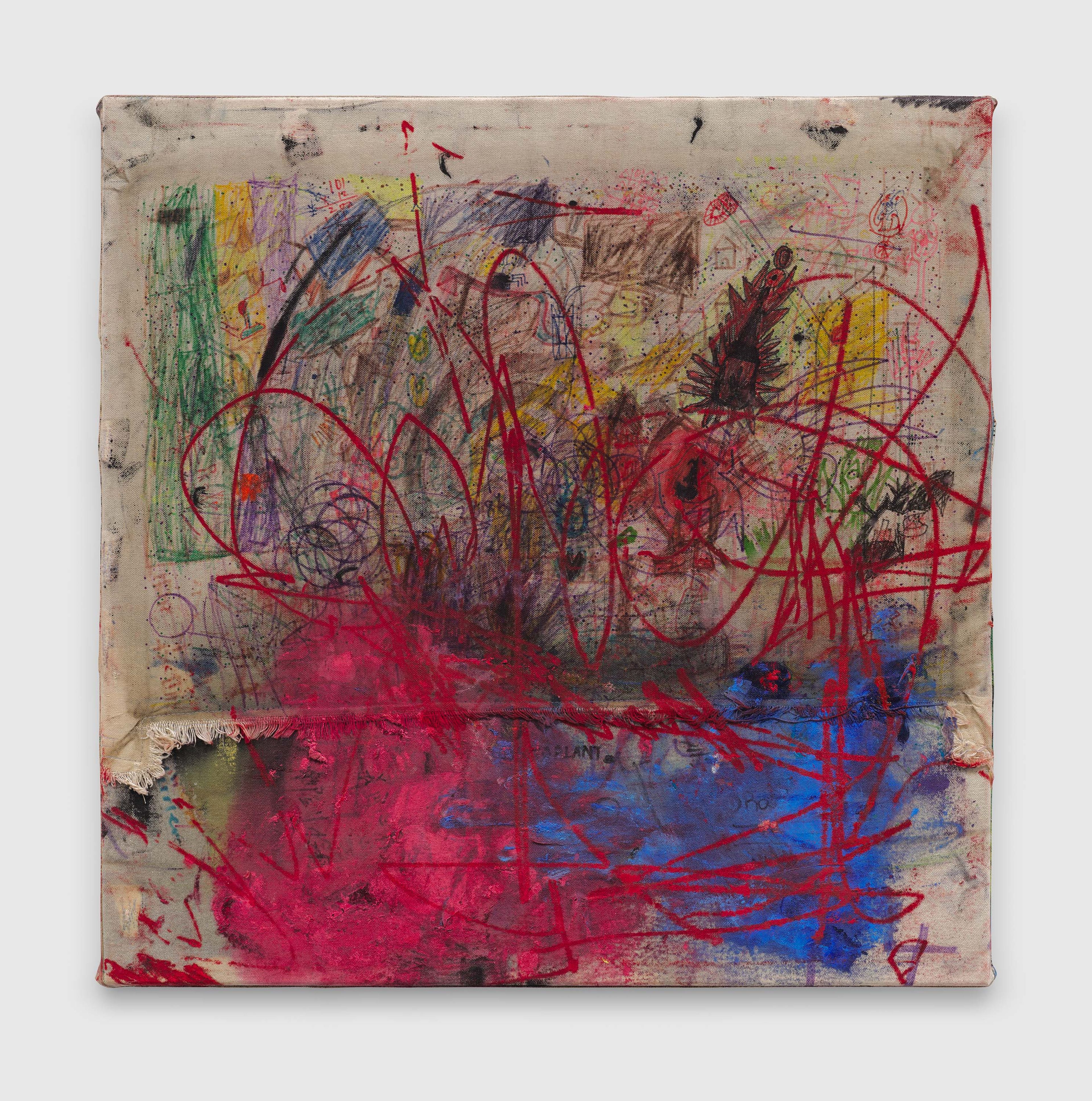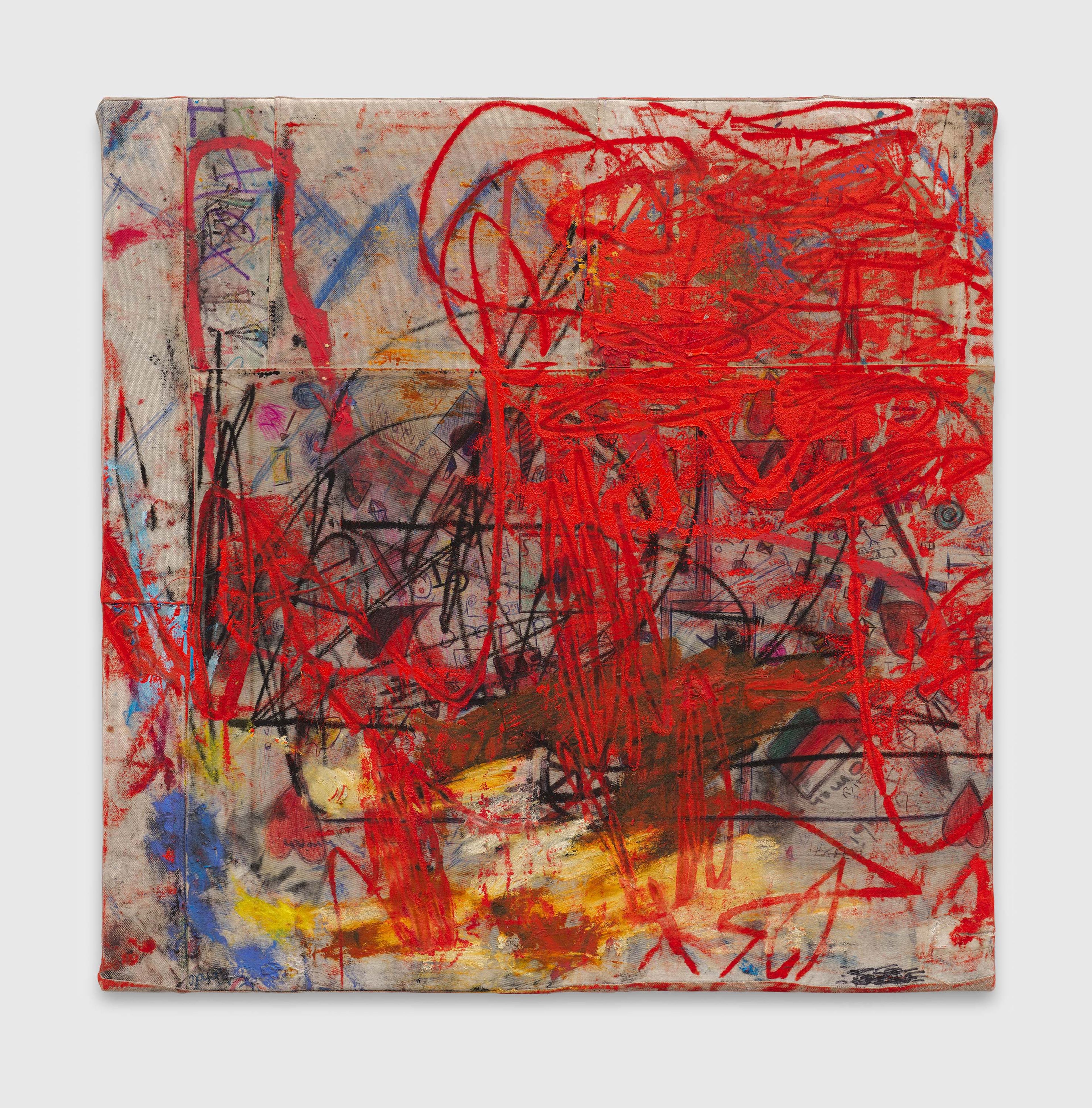 For Murillo’s ongoing long-term project Frequencies, developed with members of the artist’s family, studio team, and collaborators around the world, canvases are temporarily affixed to classroom desks in selected schools across the globe, encouraging students aged ten to sixteen to create any kind of mark making—drawing, writing, doodling. Frequencies was shown at the 56th Venice Biennale exhibition, All the World’s Futures, in 2015. The following year, in 2016, it was presented at the 2nd Hangzhou Triennial of Fiber Art in China and the 3rd Aichi Triennial exhibition, Homo Faber: A Rainbow Caravan, in Japan. It has subsequently been presented at institutions such as the Haus der Kunst, Munich (2017); Museum of Contemporary Art, Cleveland, Ohio (2017); PinchukArtCentre, Kyiv (2017); Yorkshire Sculpture Park, West Bretton, England (2019); Swiss Institute, New York (2021); Mori Art Museum, Tokyo (2021); Coachella Valley, California (2021); TANK Shanghai (2021); and Javett Art Centre, University of Pretoria, South Africa (2023). In 2015, David Zwirner Books published Oscar Murillo: Frequencies, which catalogues the first year of the project and includes reproductions of canvases and photographs of the schools and students involved. A subsequent volume, published in 2024 by Hatje Cantz, with texts by Mark Godfrey, Eleanor Nairne, Gabi Ngcobo, and Alessandro Rabottini, provides an archive of the many iterations of the Frequencies project that Murillo has organized over the past decade and beyond.