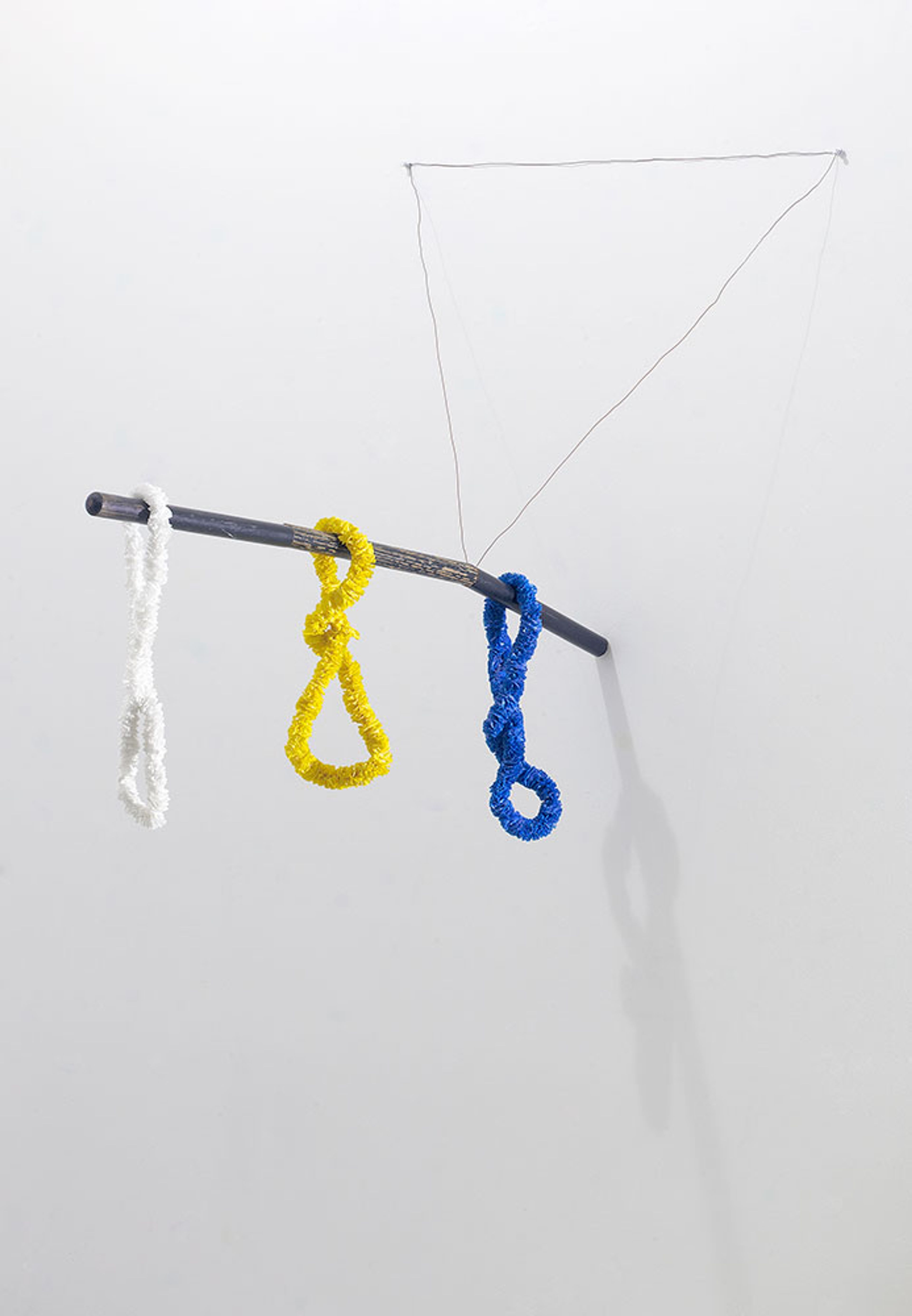 Wooden broomsticks with enamel paint, wire, and plastic leis