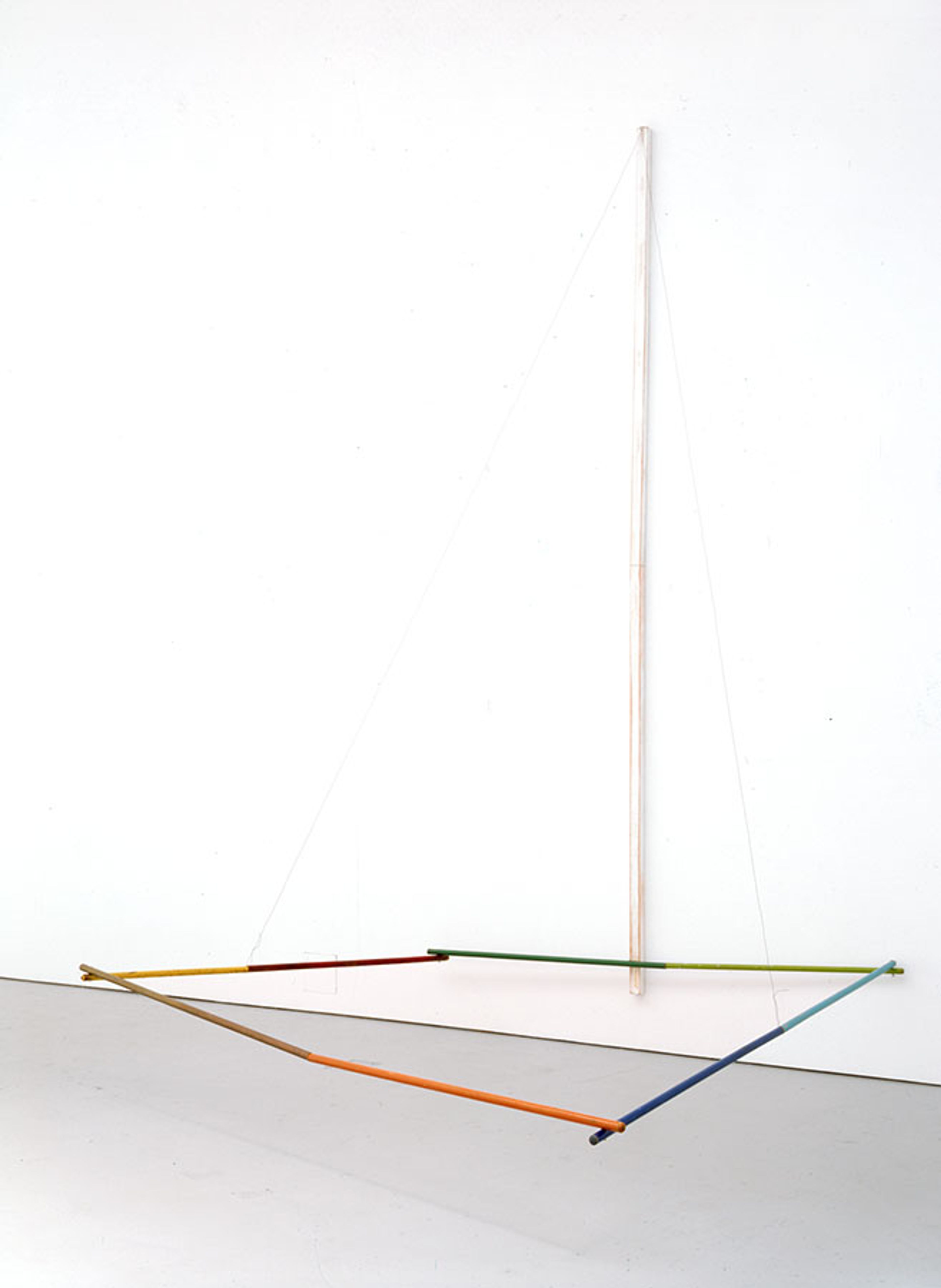 Wooden broomsticks with enamel paint, wood, latex paint, and wire