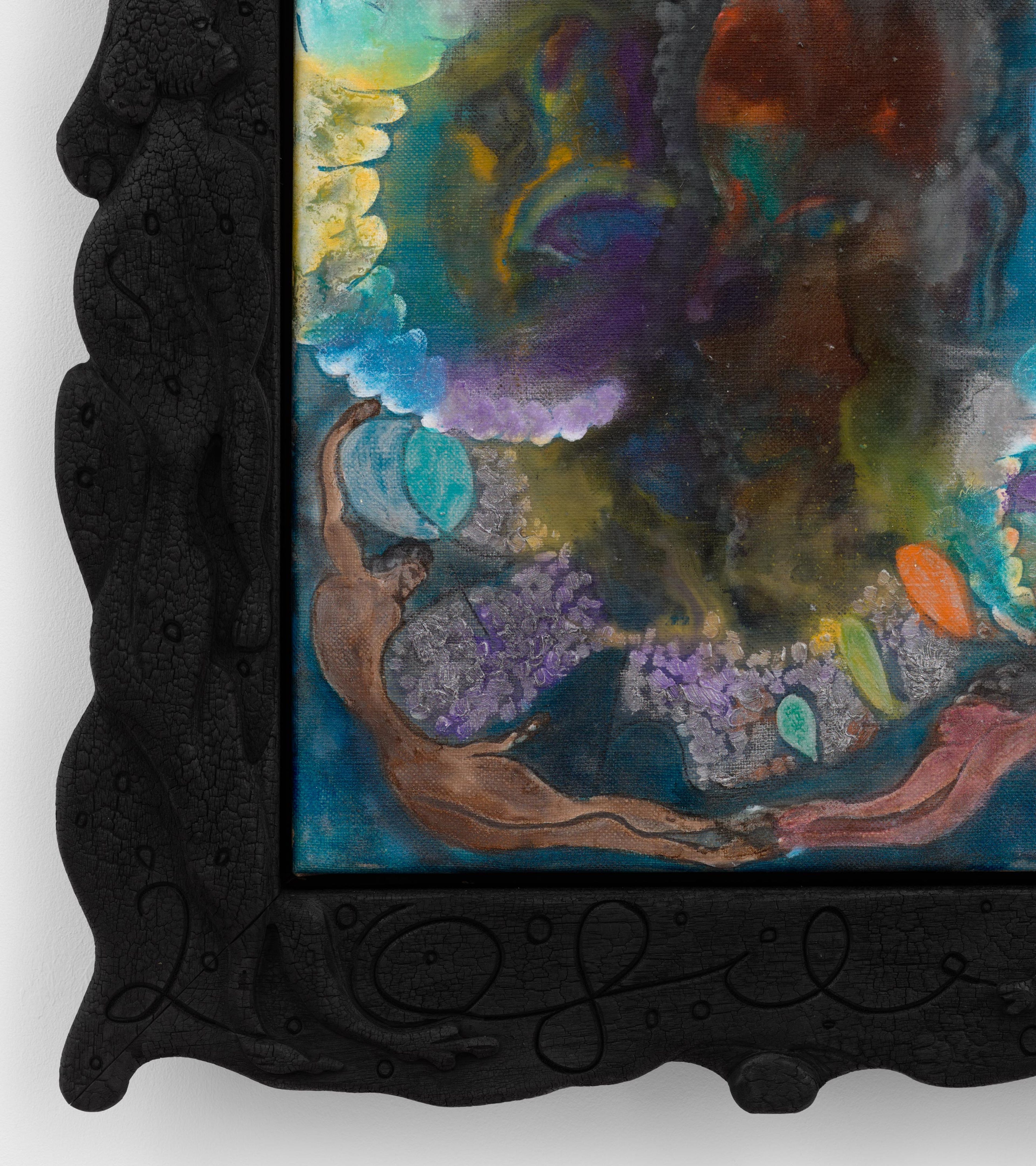 Oil and charcoal on linen in artist frame of carved and charred American black walnut with iron nails and screenprint on bamboo silk