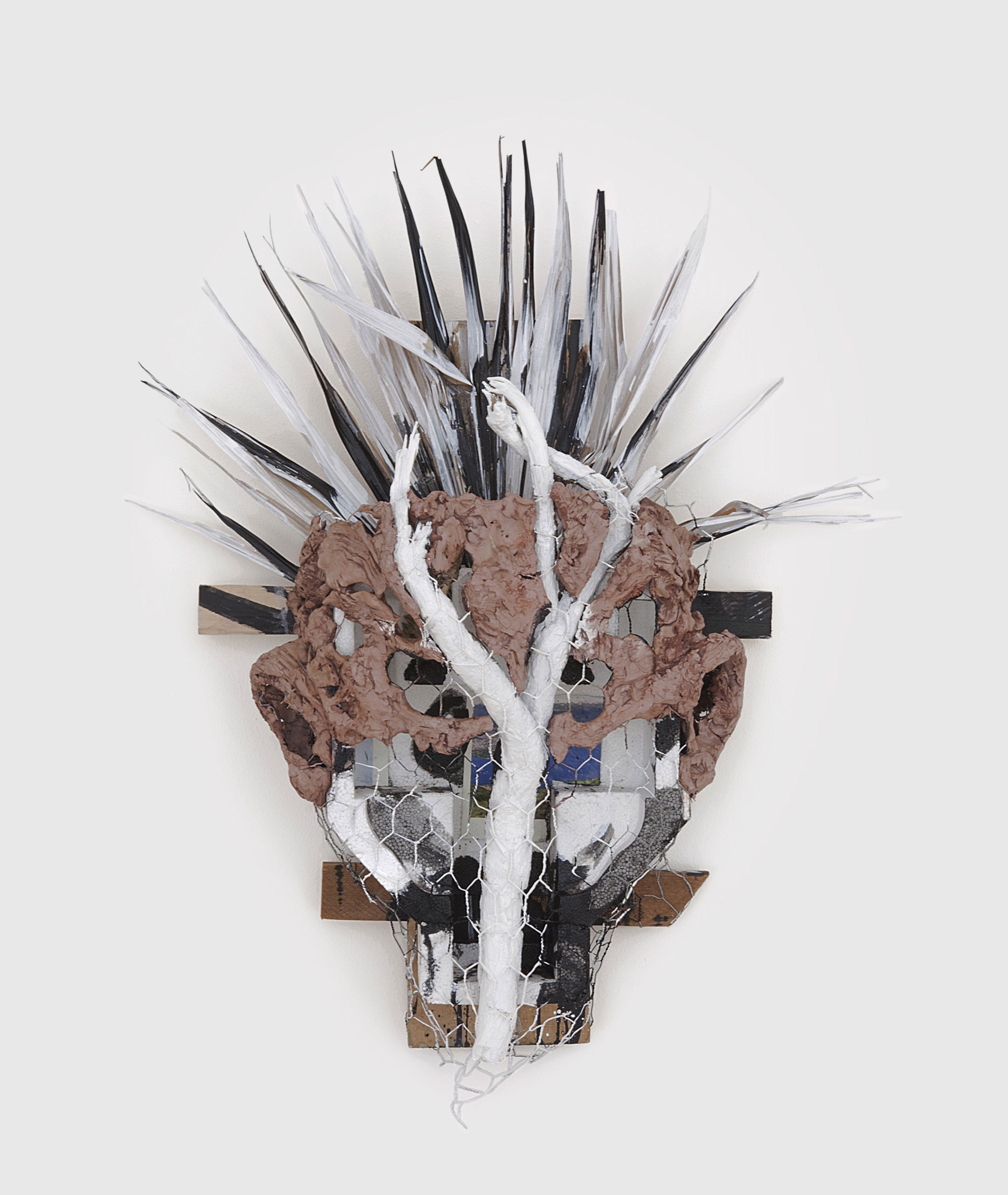Wood, Styrofoam, clay, wire, paper, acrylic paint, and palm