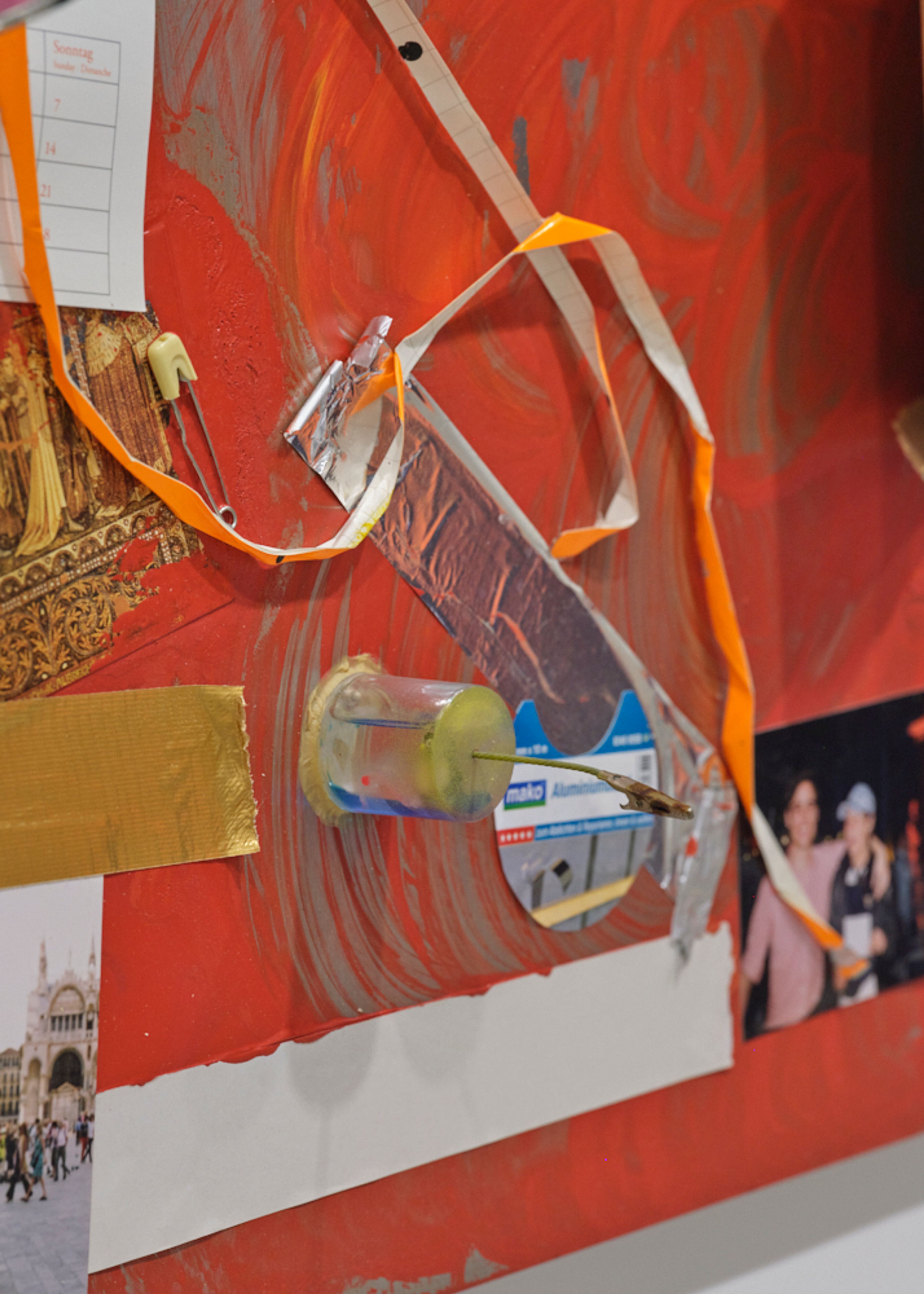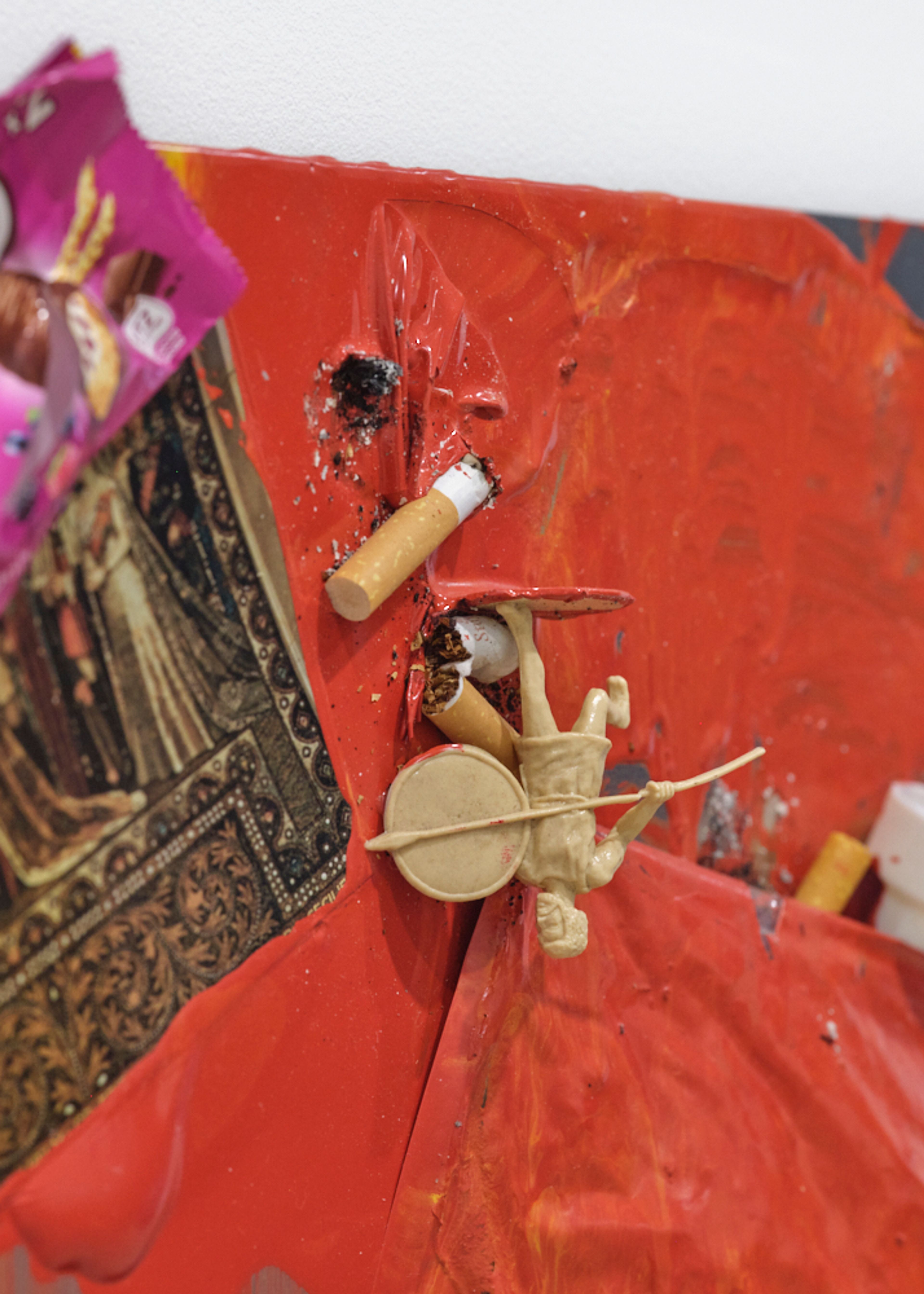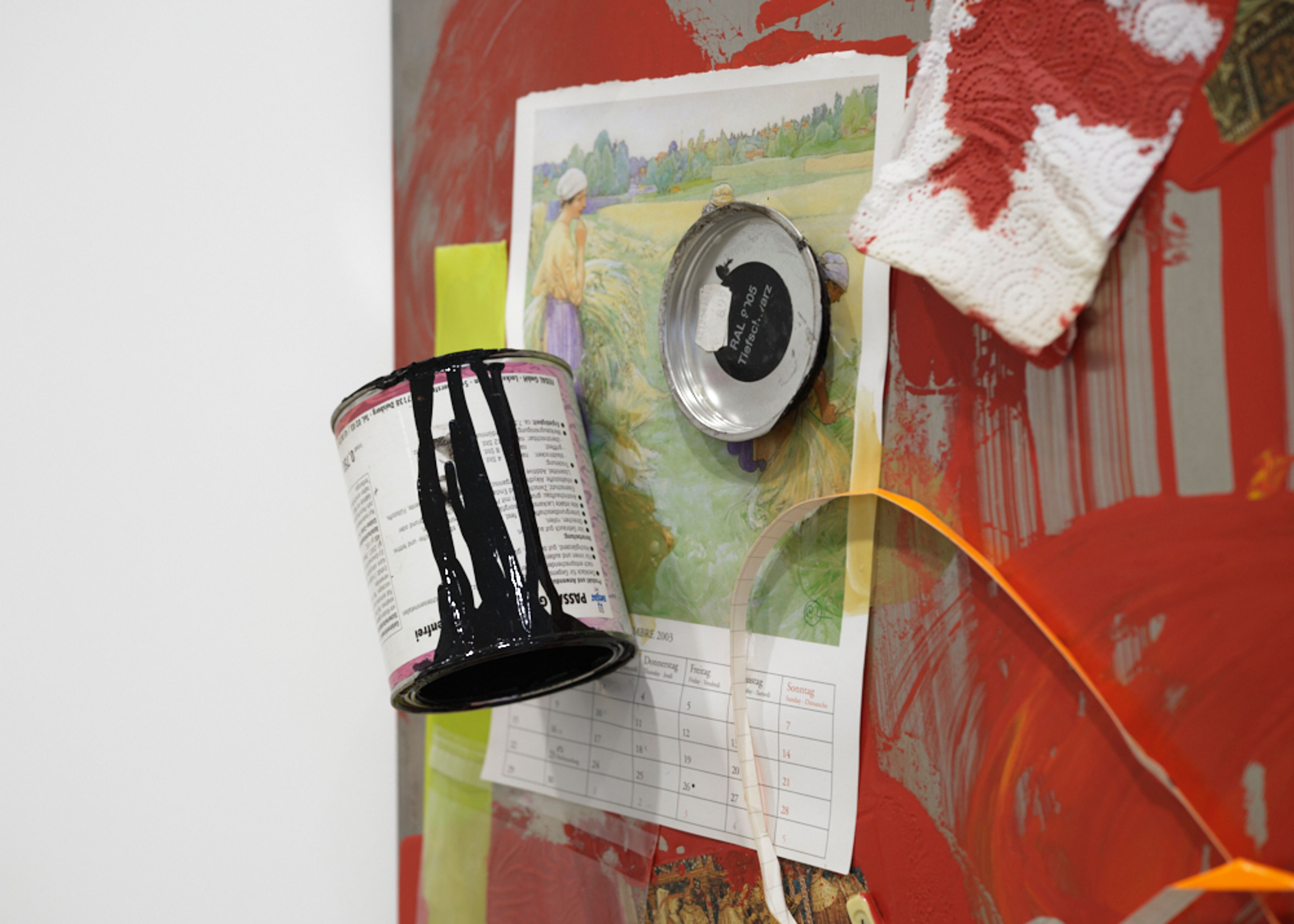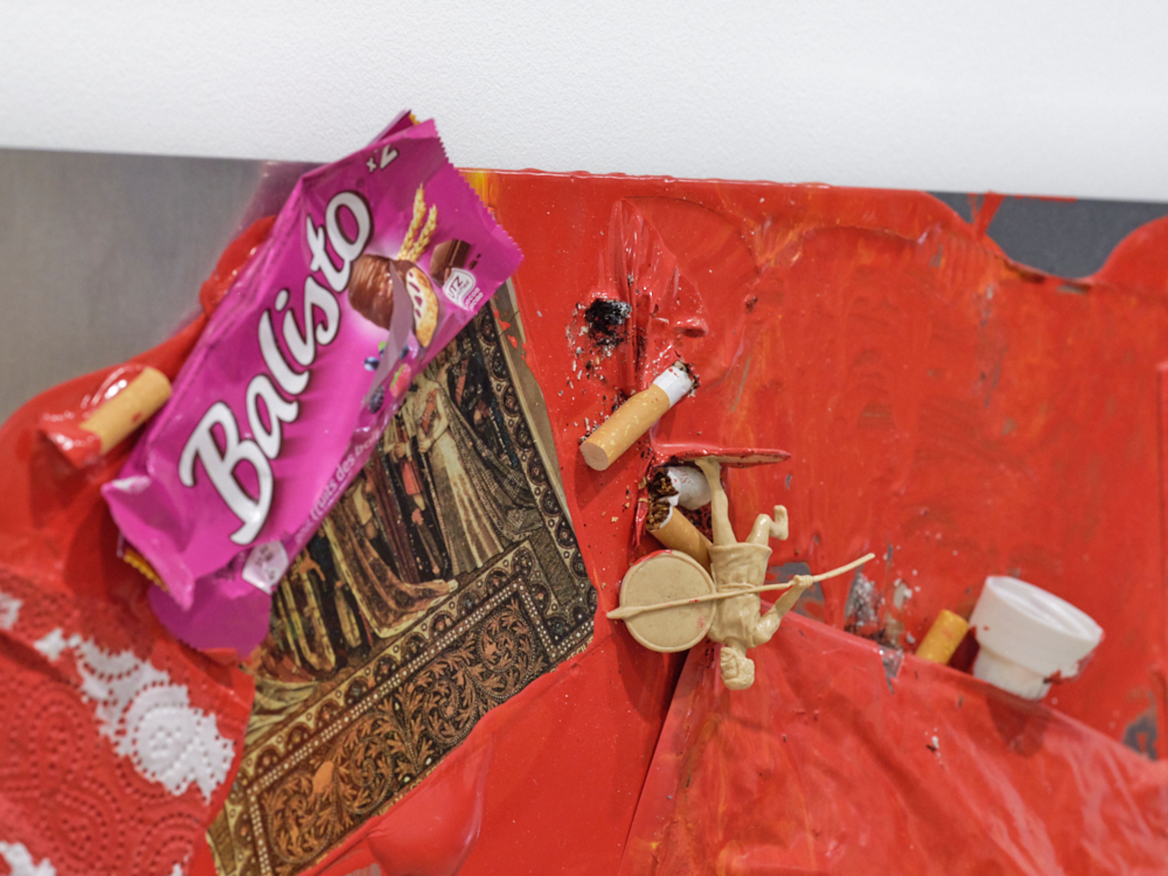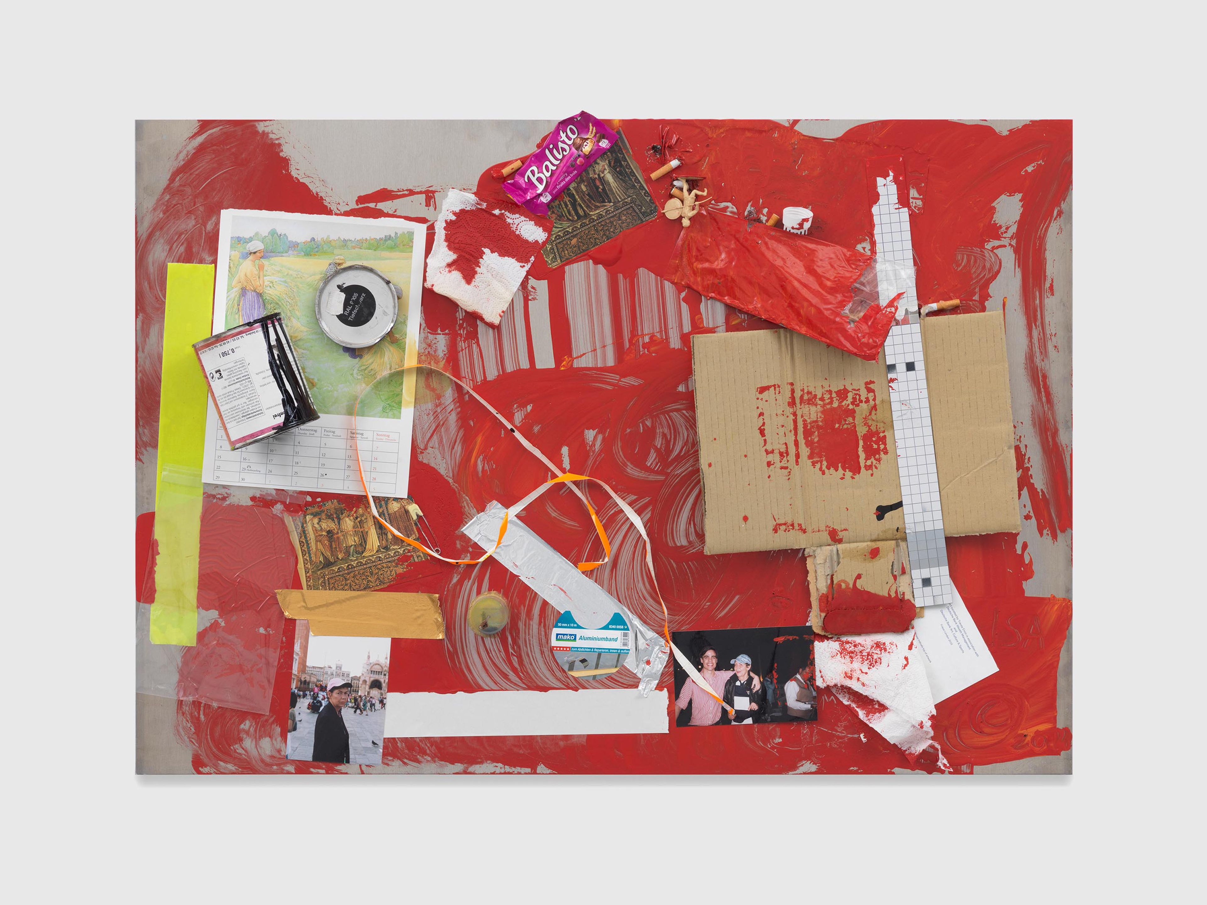 Lacquer paint, paint can, photo holder, cardboard, plastic lid, glue, ash, paper, tissue, tape, plastic foil, c-print, toy figure, cigarette, plastic wrapper, mirror foil, and sticker on aluminium panel