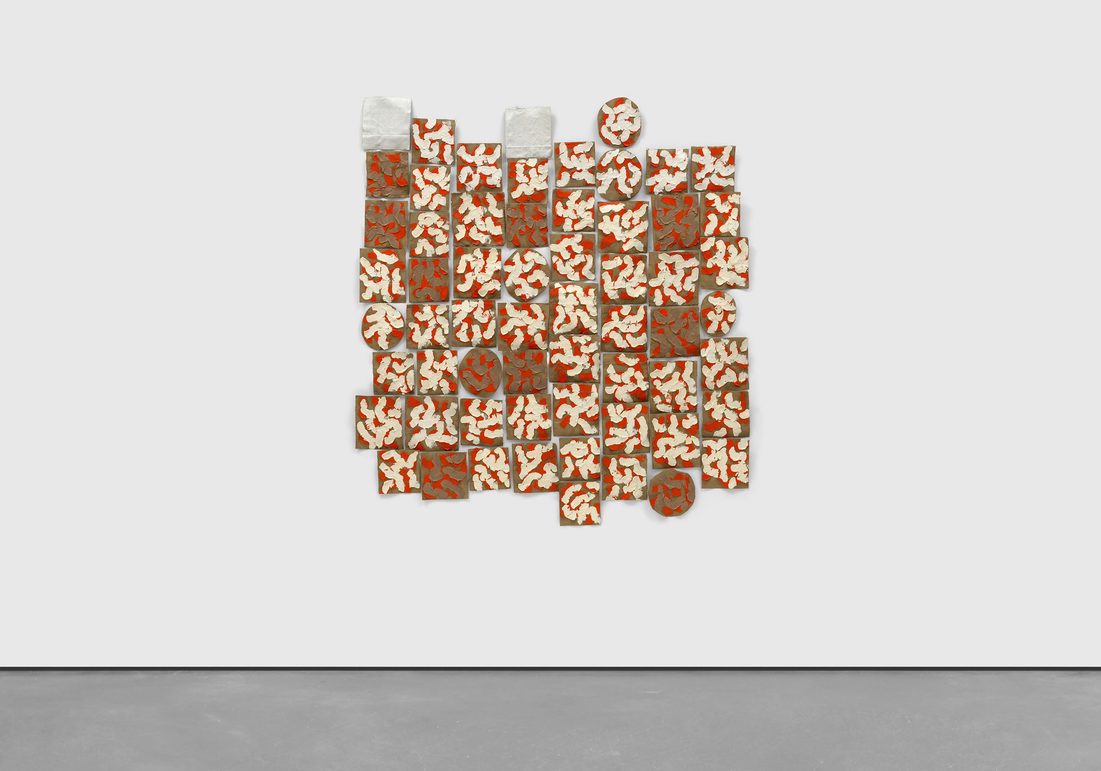 Panels, each: irregular squares: 5 3/8 x 5 3/8 inches (13.7 x 13.7 cm) Panels, each: irregular circles, diameter: 4-6 inches (10.2-15.2 cm) Overall: 64 3/4 x 59 1/2 inches (164.5 x 151.1 cm)