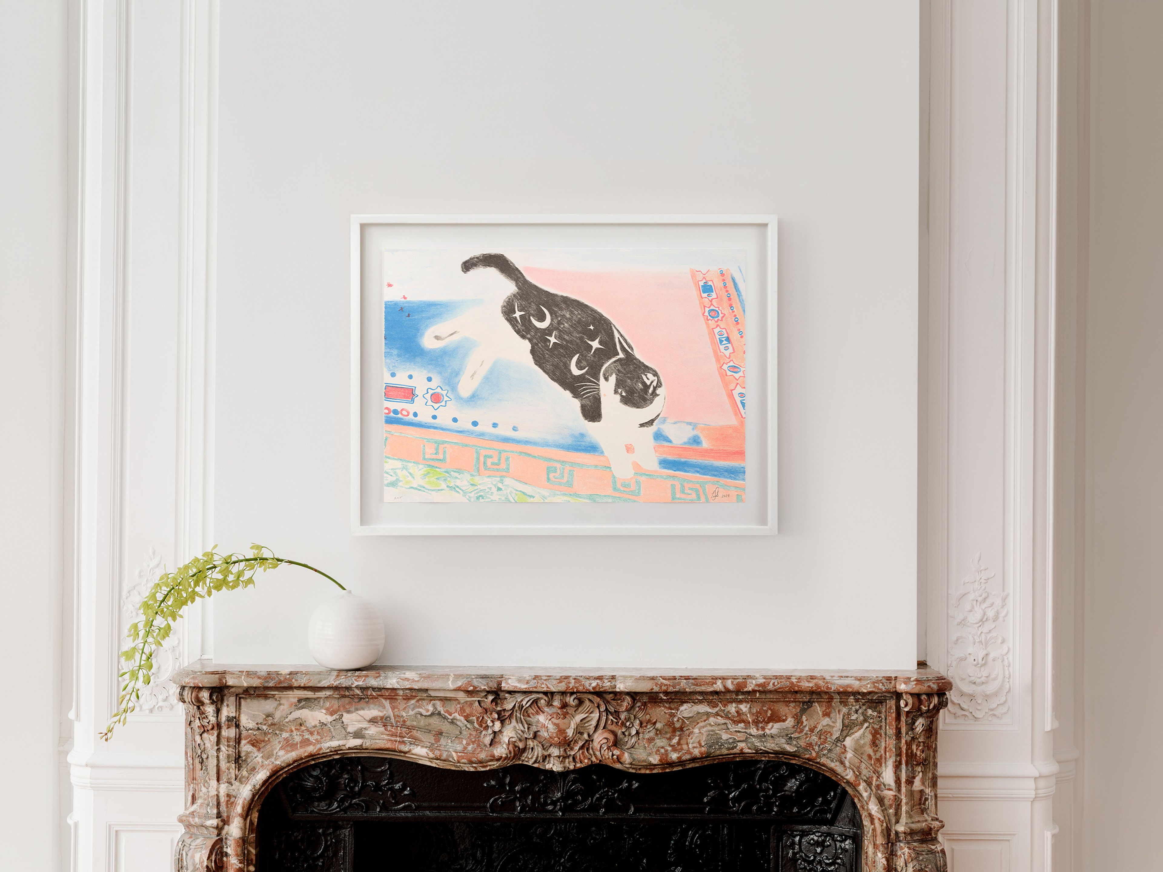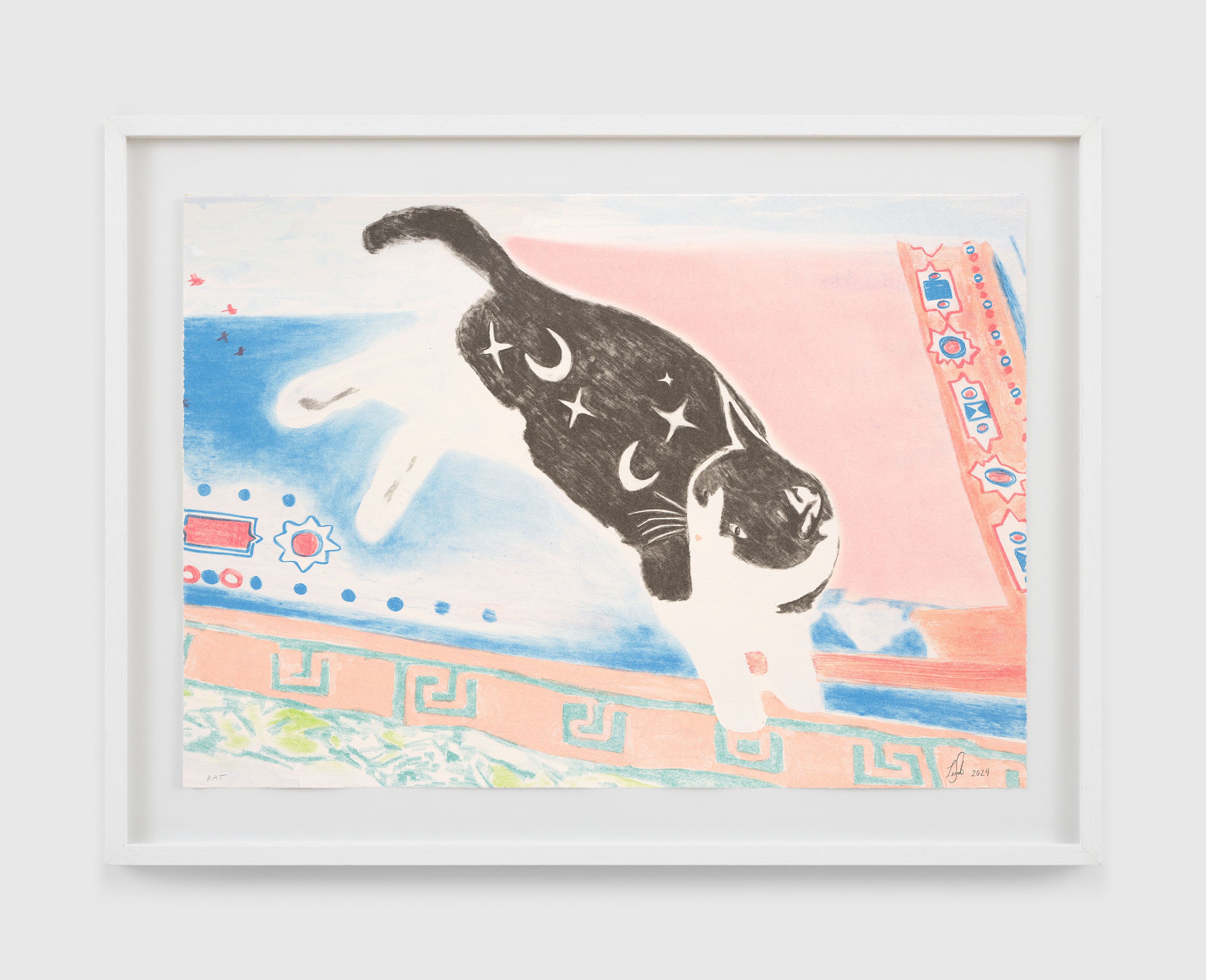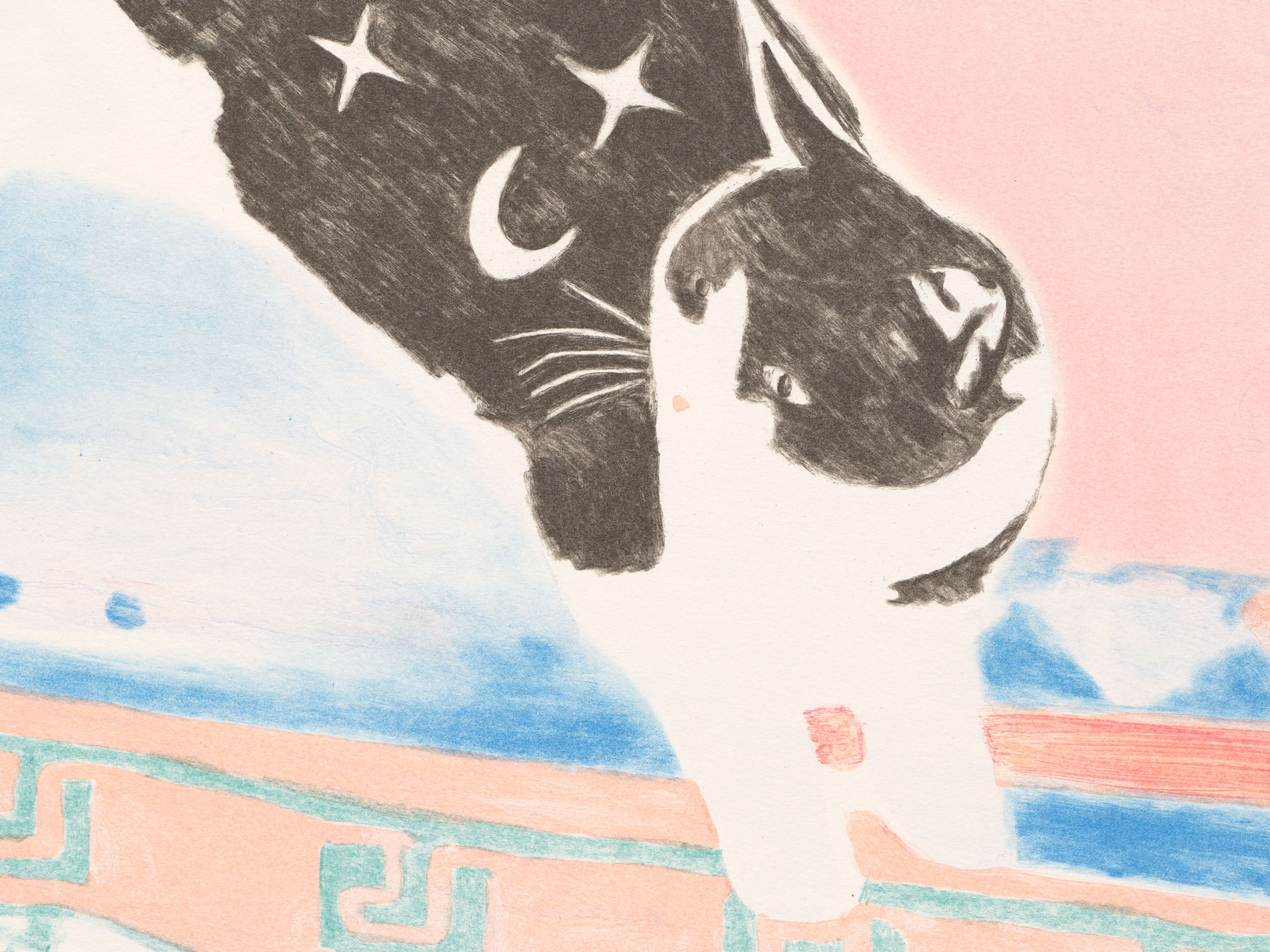 Saleh often incorporates animals into her compositions, mining their myriad associations with the human world as well as their innate unknowability. Here, she depicts a lone cat lounging on a vibrant tapestry of overlapping prayer mats, its black-and-white fur marked with a fantastical pattern of crescent moons and stars.