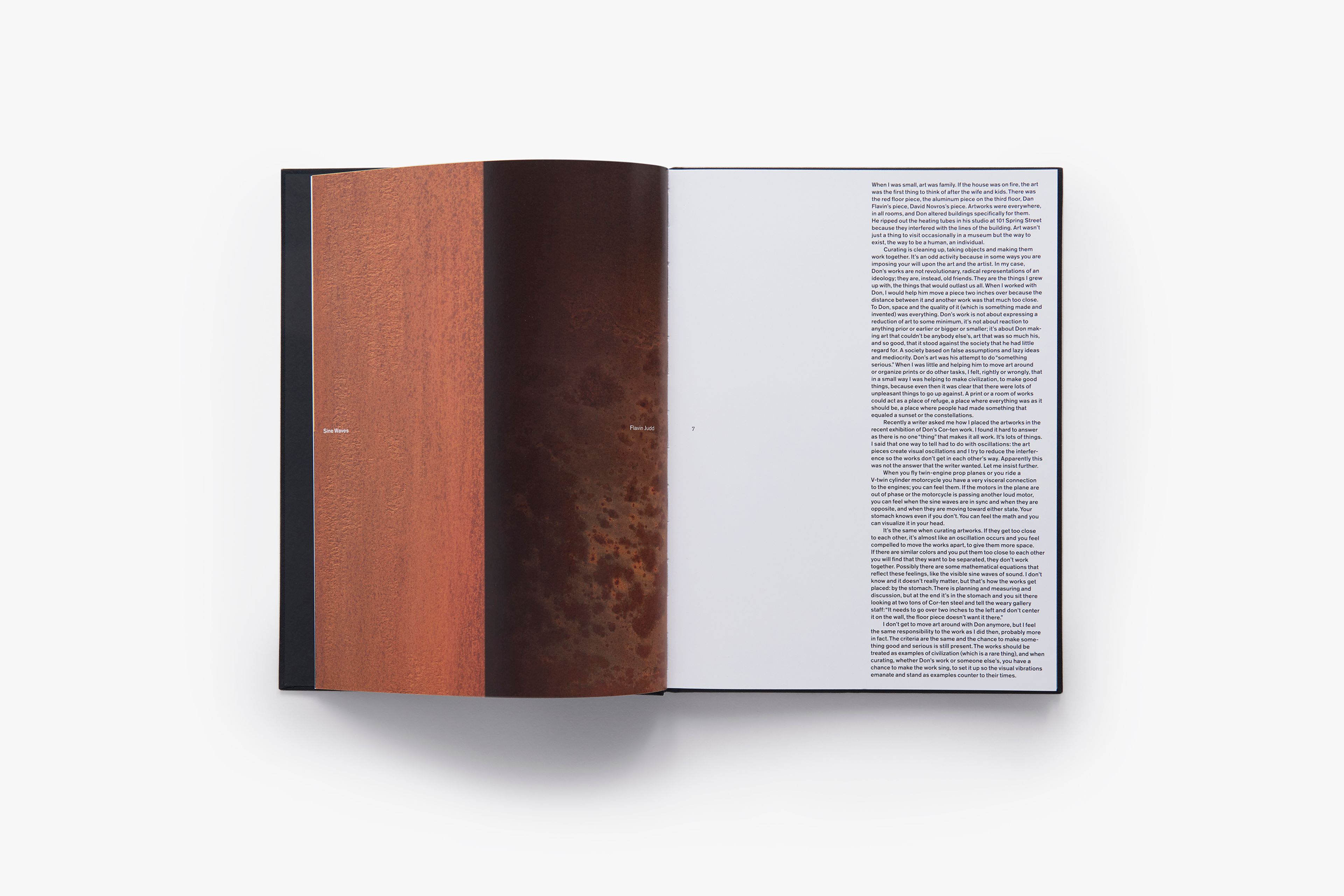 Donald Judd: Cor-ten represents the first-ever focused examination of Judd’s works in Cor-ten steel, which he began to produce in earnest in 1989 and would continue to elaborate on until his death in 1994. Cor-ten is an alloy that makes steel more resistant to corrosion, and eliminates the need for paint. With its distinctive red-brown patina, Cor-ten afforded Judd a new medium for exploring the relationship between surface and volume, as well as color and form. Prior to 1989, Judd executed a handful of works in Cor-ten primarily as outdoor commissions or site-specific works. This volume is produced on the occasion of the 2015 exhibition at David Zwirner, New York. Designed in close collaboration with Flavin Judd and Judd Foundation, Donald Judd: Cor-ten sheds new light on a body of work that represents the culmination of three decades of aesthetic output and underscores the mastery and control over material and space that characterizes Judd’s practice as a whole.