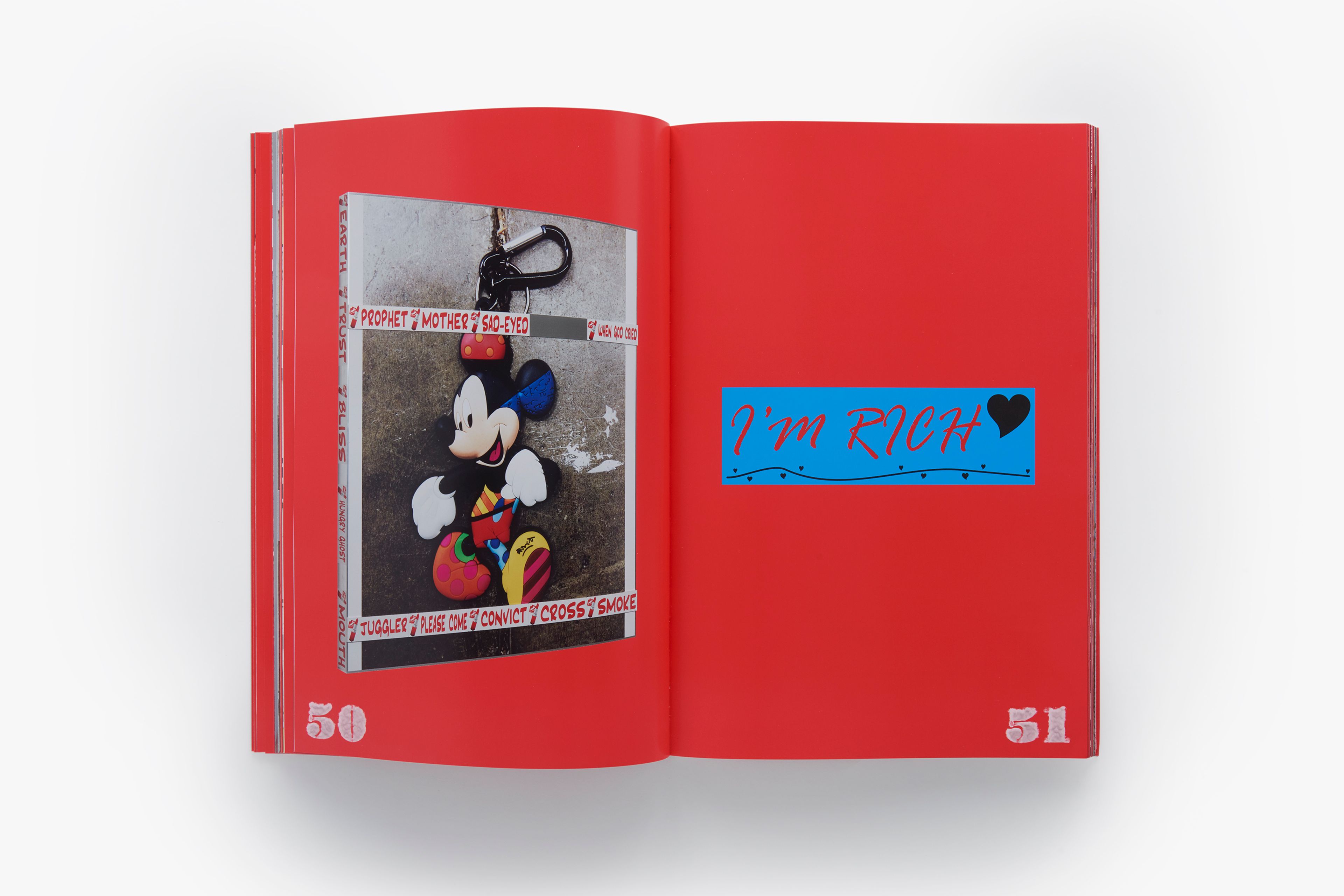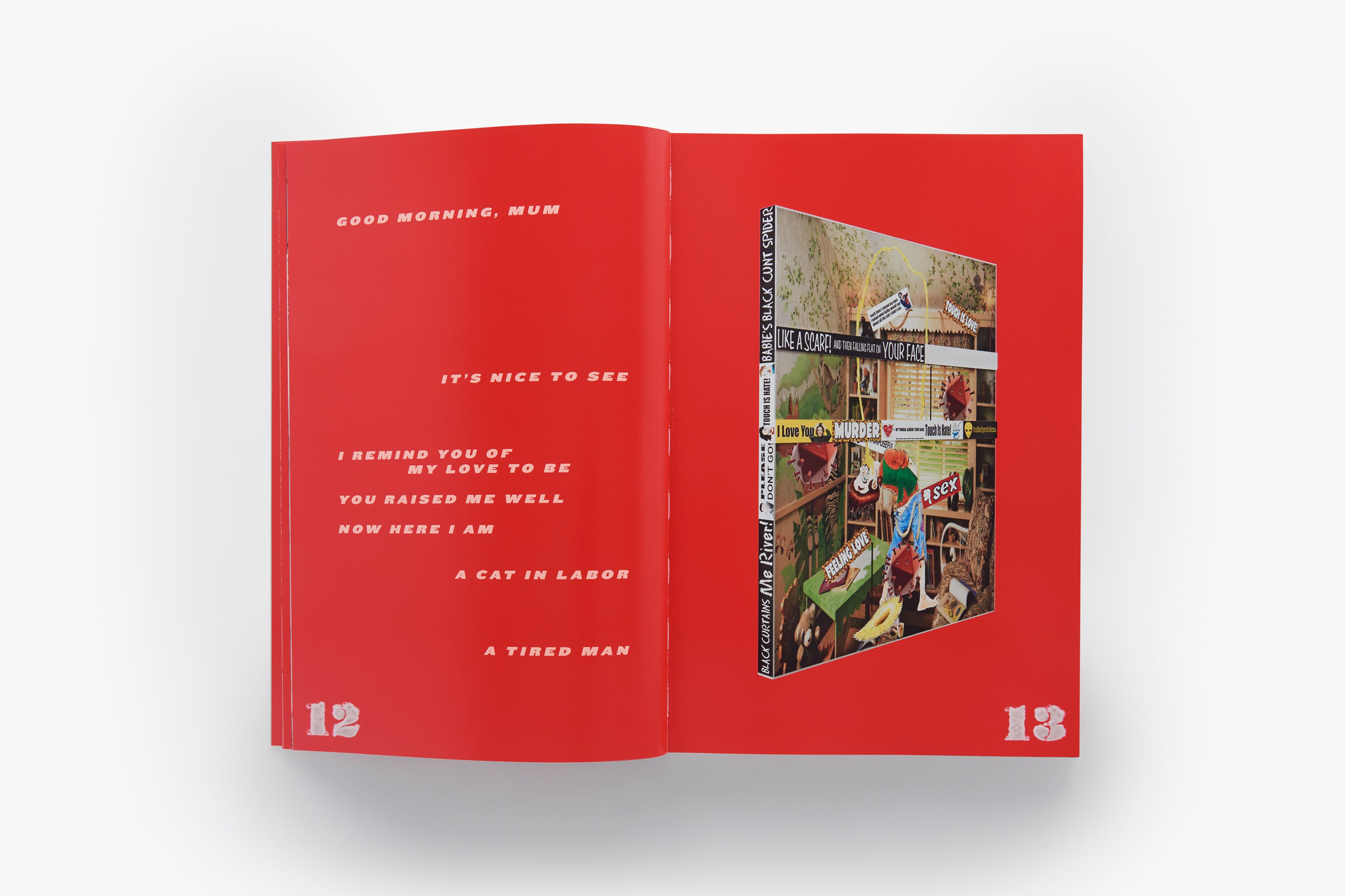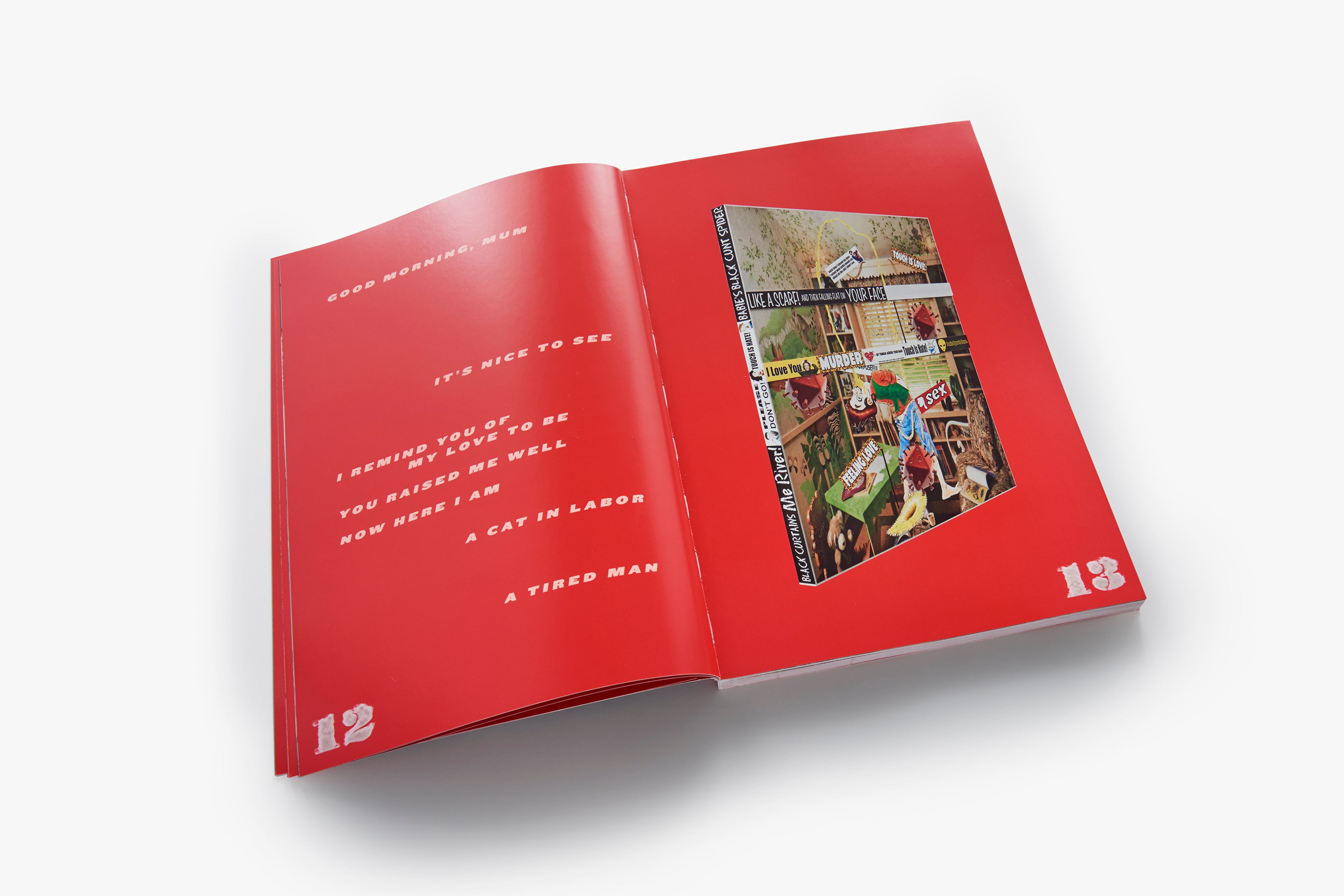 This artist’s book is the product of close collaboration between Wolfson and the book designer Joseph Logan. Initially conceived to document the artist’s 2014 exhibition at David Zwirner in New York—his first with the gallery, debuting new sculptural work, a critically acclaimed video, and a much-discussed animatronic sculpture—the publication ultimately exists as a hybrid between an exhibition catalogue and a stand-alone expression of Wolfson’s vision. Featuring a dynamic layout and large color plates, the book is anchored by extensive photo documentation of Wolfson’s bewitching (Female figure) 2014, which combines elements of installation and performance in the figure of a curvaceous, scantily clad woman covered in dirt marks and wearing a witch mask. Presented are photographs by Andreas Laszlo Konrath, who documented many aspects of the exhibition, including behind-the-scenes images of its installation. Also included are reproductions of Wolfson’s new series of wall-mounted sculptures comprised of bumper stickers overlaid on inkjet prints, candid photographs of the artist taken by Gaea Woods, and a text by the artist providing context for the visual material.