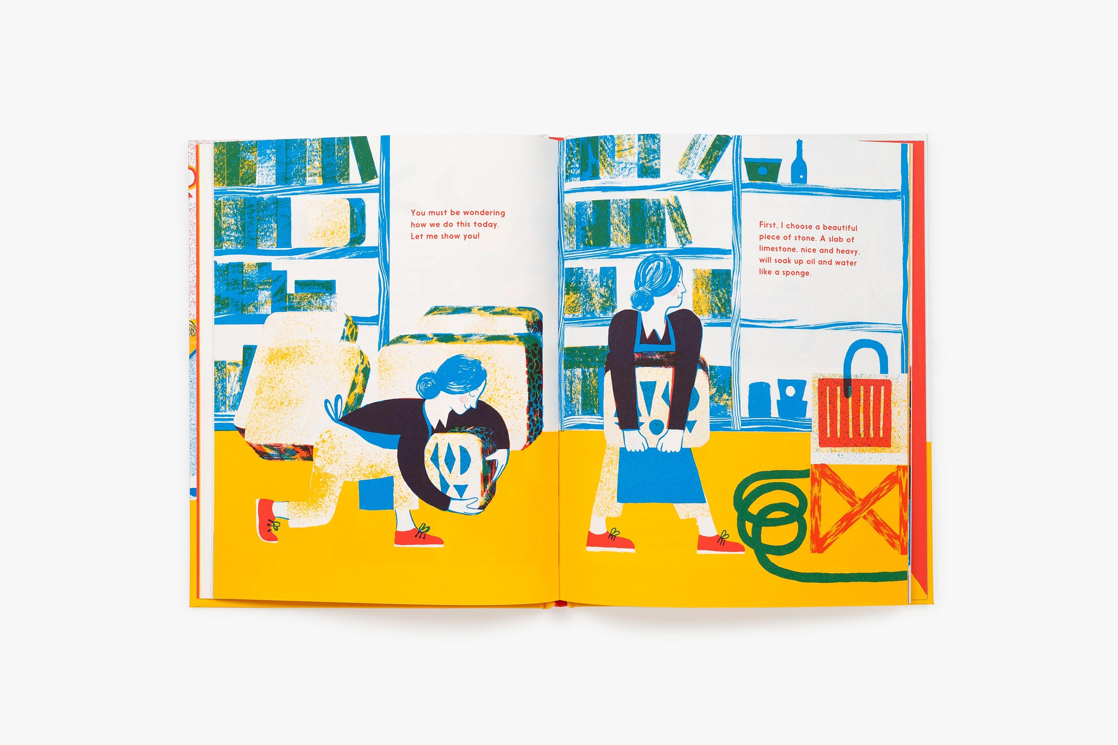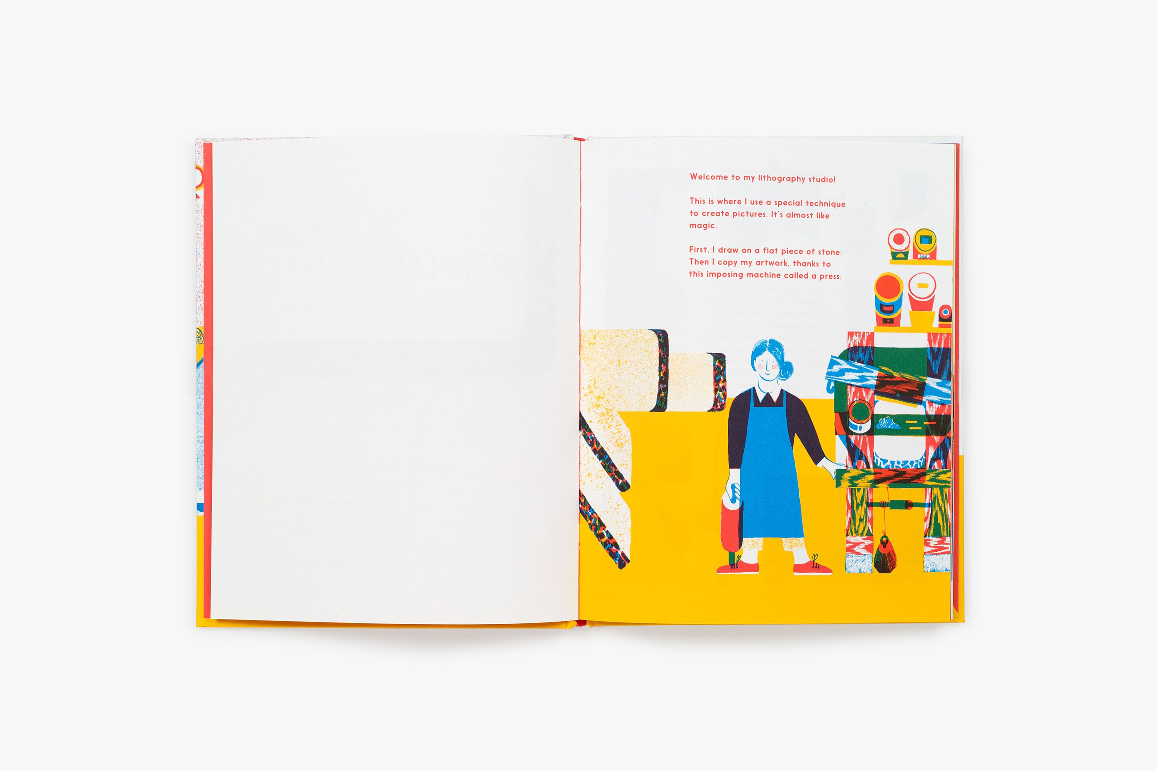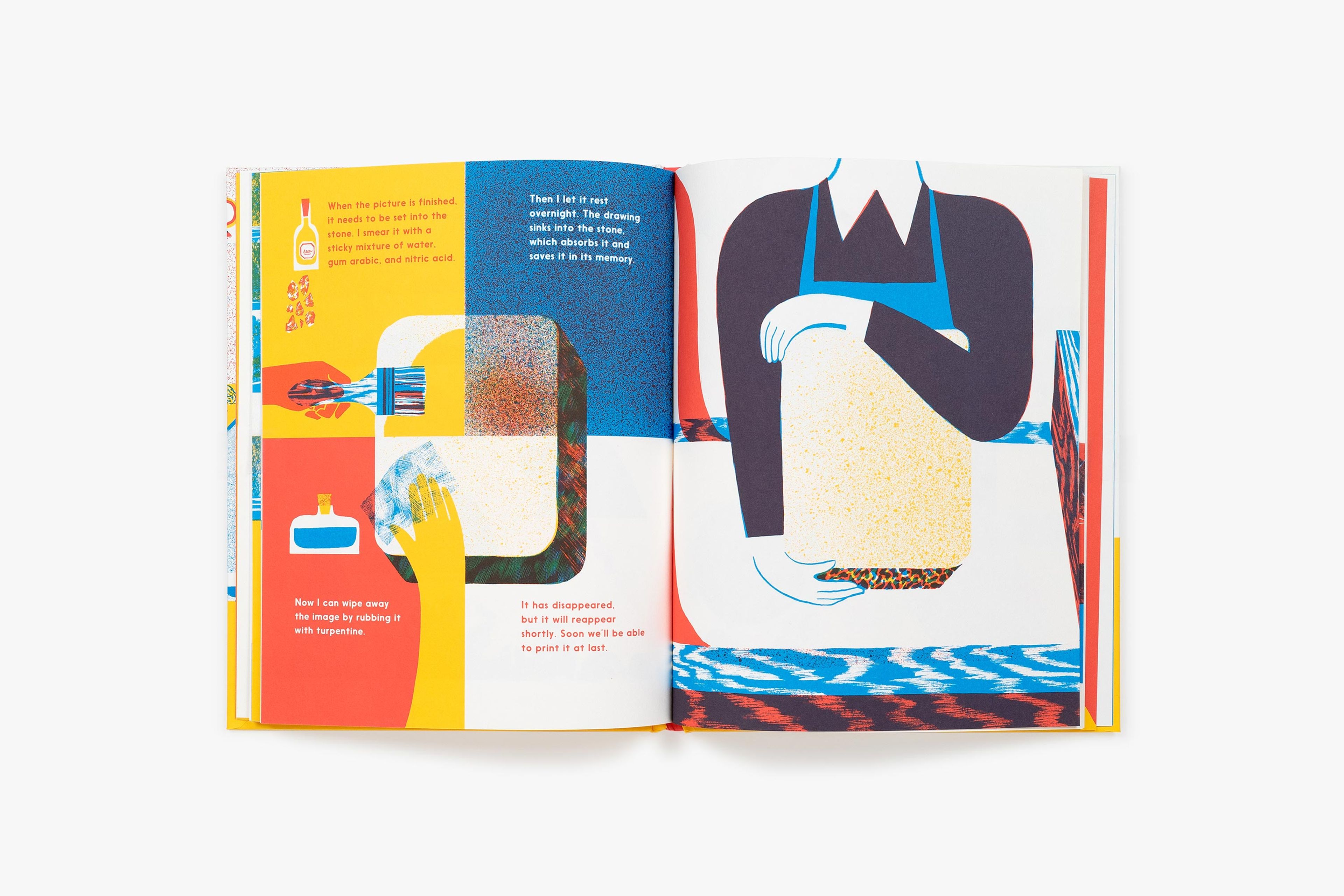 Combining science, art, and history, Meet the Lithographer showcases a centuries-old printing practice that evolved into the process used today to print books, magazines, newspapers, and posters. This enchanting behind-the-scenes tour of the lithographer’s workshop offers an inside look at the tools, techniques, and stories that define lithography. The second children’s book from David Zwirner Books, Meet the Lithographer continues our mission to illuminate different elements of the art industry. The playful illustrations, printed in three striking colors, offer a unique experience of the printed medium and showcase the magic of the lithographer’s world.