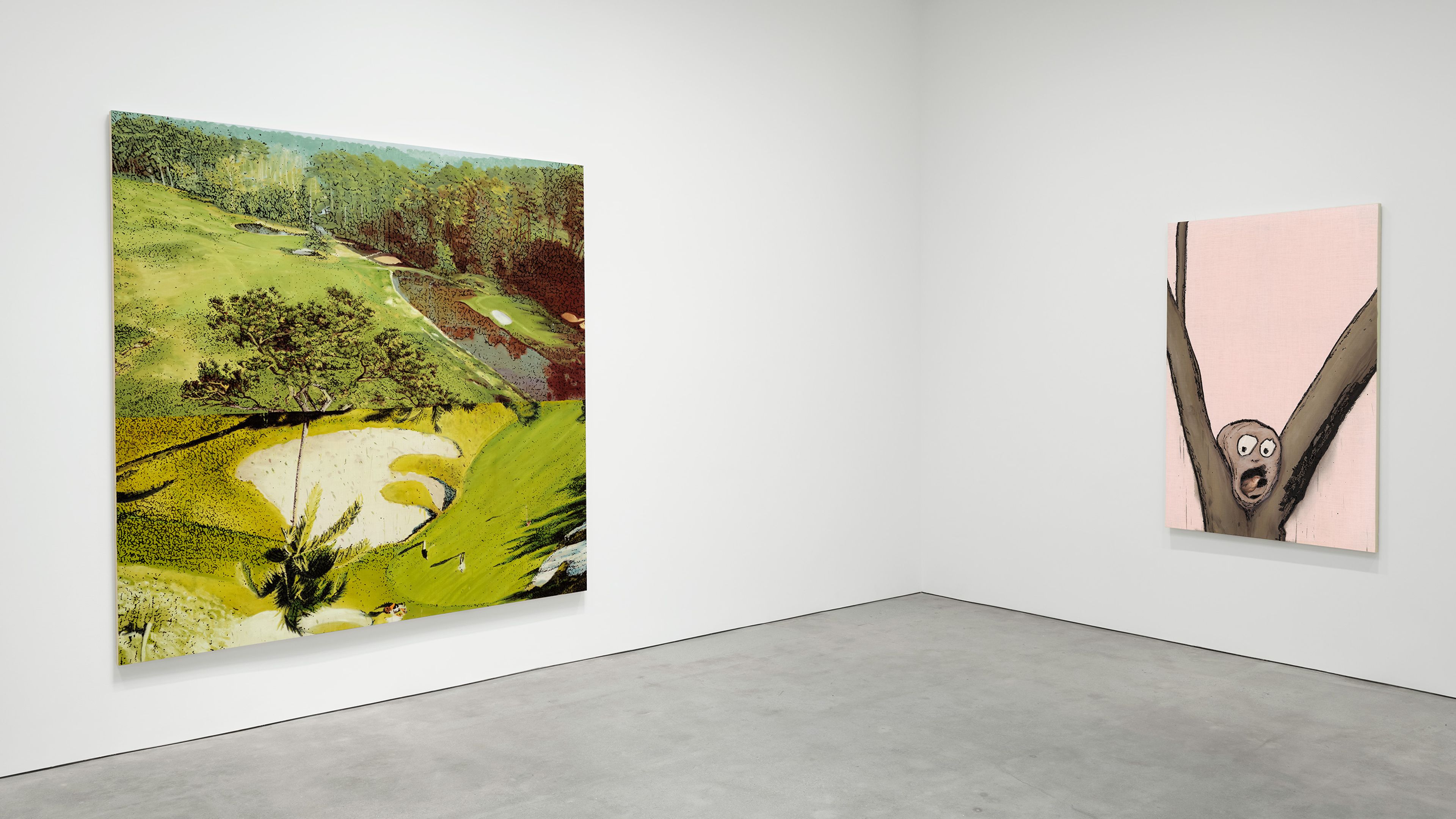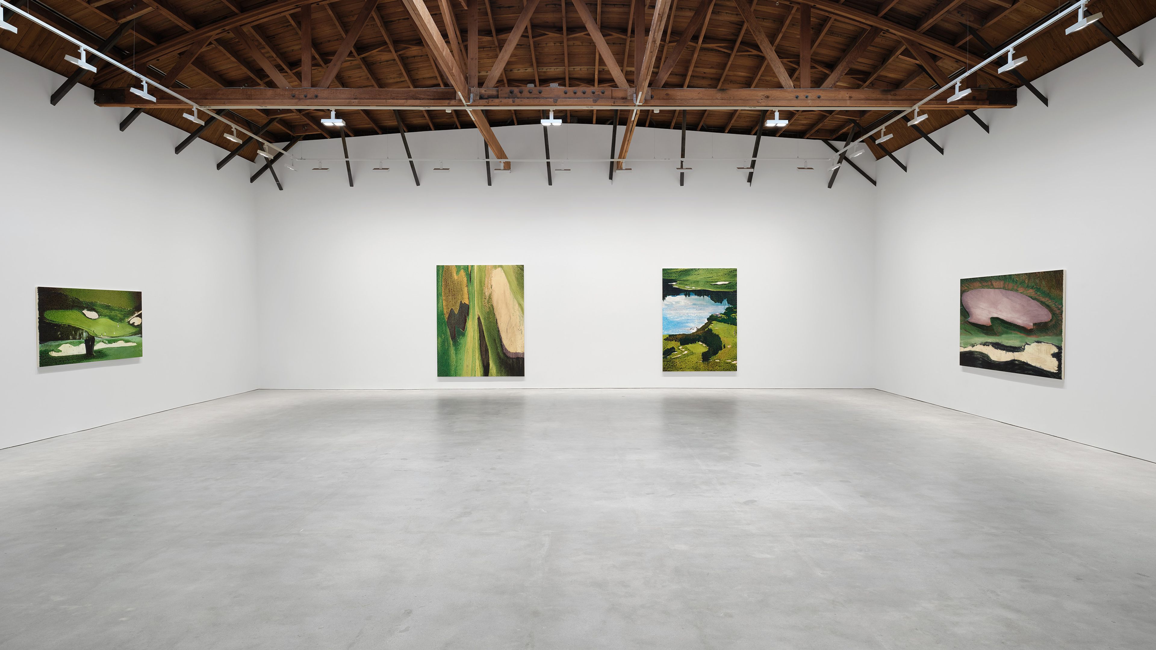 Found by the artist from various photographic sources, from recent imagery to 1970s and 80s golfing monographs, the views of distinct golf courses are merged as composite images that confound any fixed point of view and create impossible perspectives on the plane of the canvas. Lowman heightens the highly designed, rendered artificiality of the golf courses by translating this placeless imagery into paint with striking color.