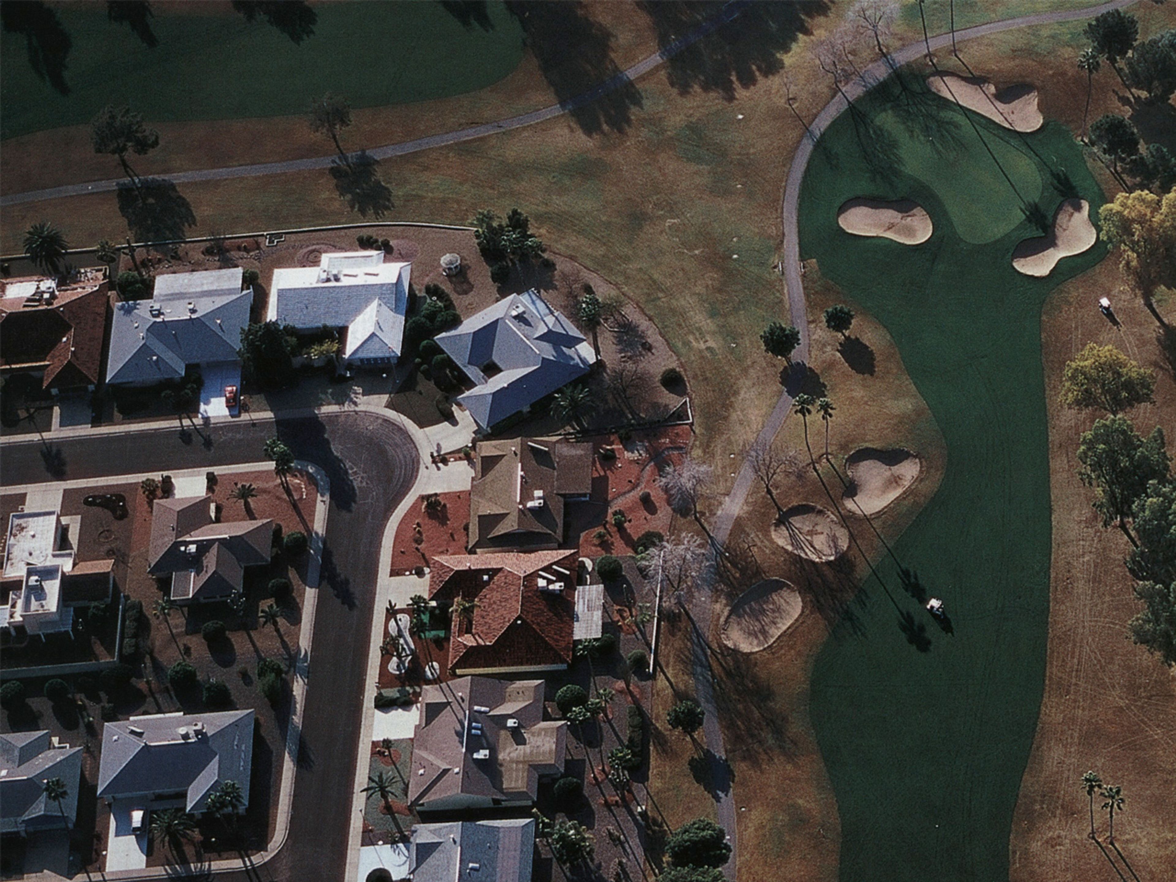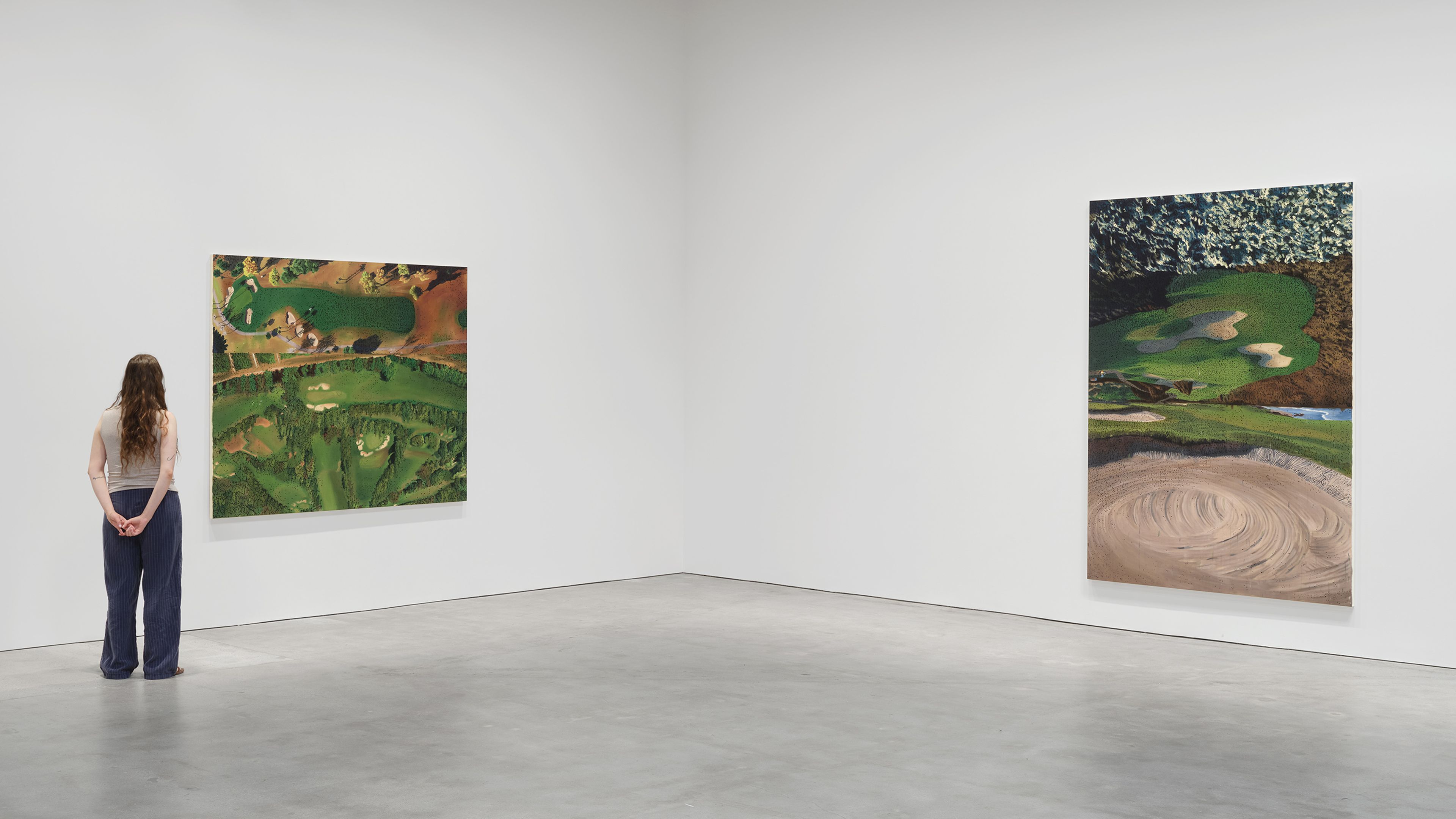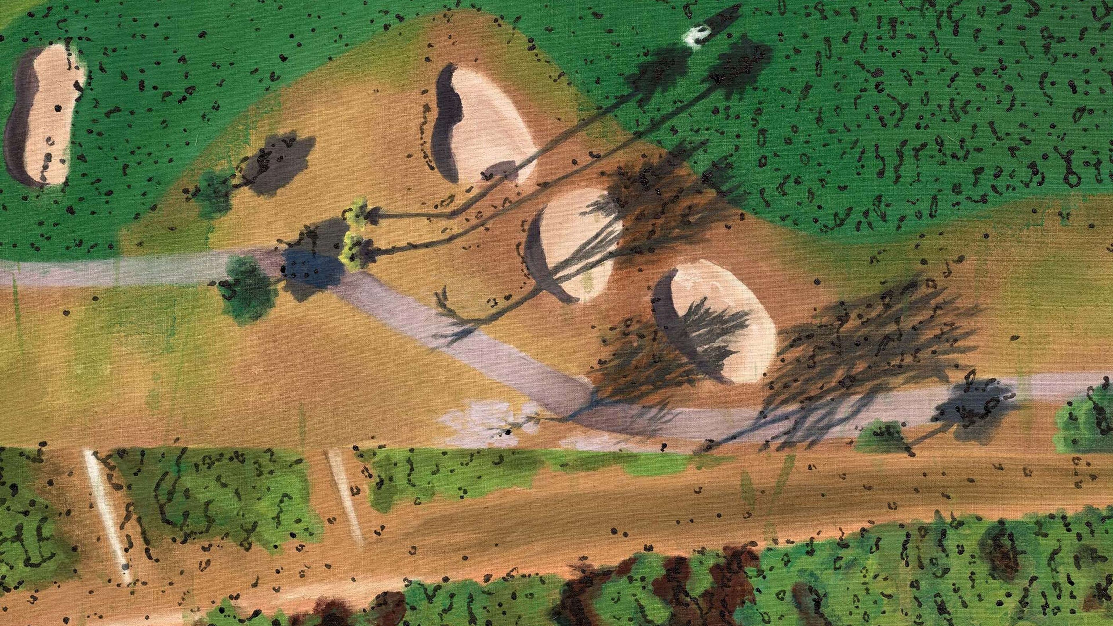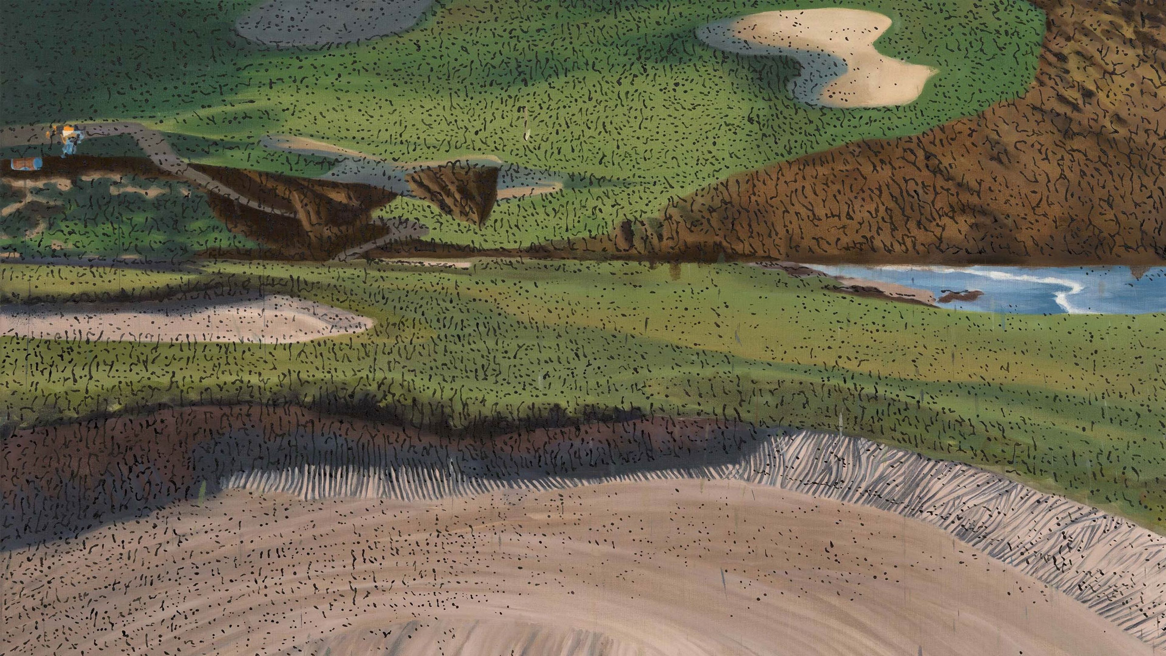 Lowman’s new paintings combine a range of opposing registers of art history, culture, and meaning. The palette and the amorphous, rounded shapes of the manicured scenery, with its contrived sand traps and the curved contrasts between turf and grass, recall nonrepresentational forms found in mid-twentieth-century abstract and surrealist art, further enhancing the hyperreal otherworldliness of the nonlandscapes they depict.