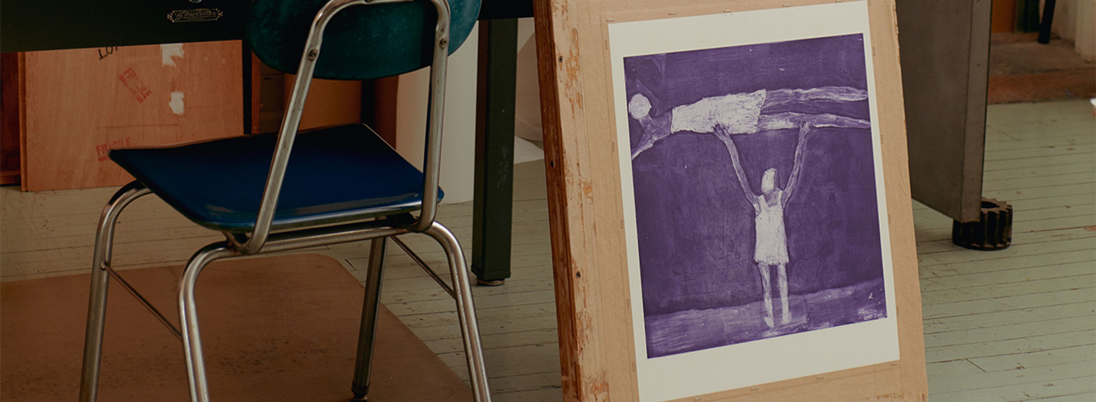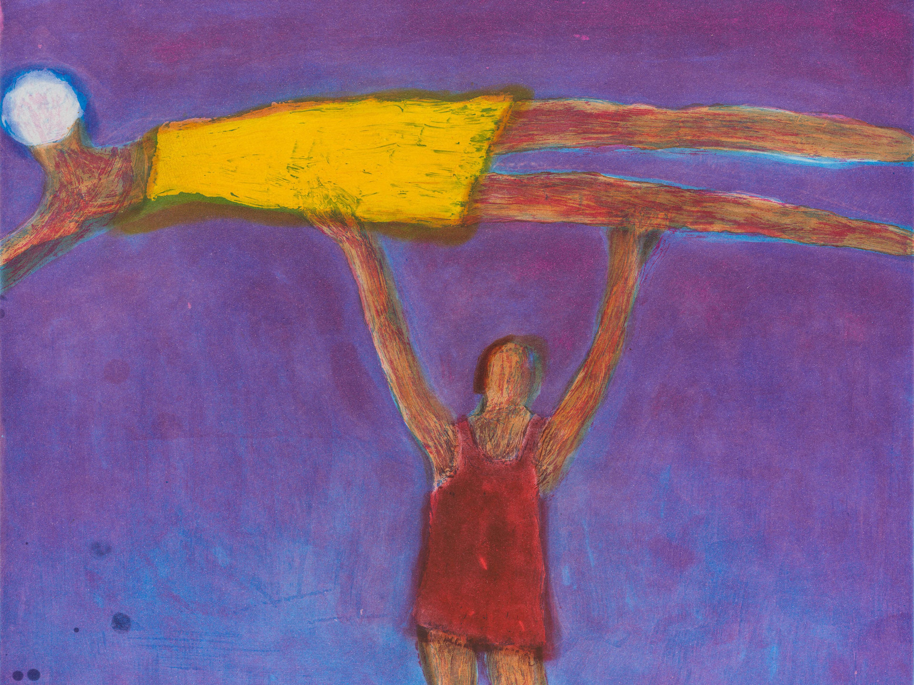 Woman Holding Woman depicts two women in colorful dresses, one holding the other high above her head in a spirit of collaboration and strength. The resulting scene is strange yet tender; its multivalent and symbolic meaning is emphasized by its descriptive title, which may also allude to pressing contemporary concerns—namely, the ongoing assault on women’s rights.