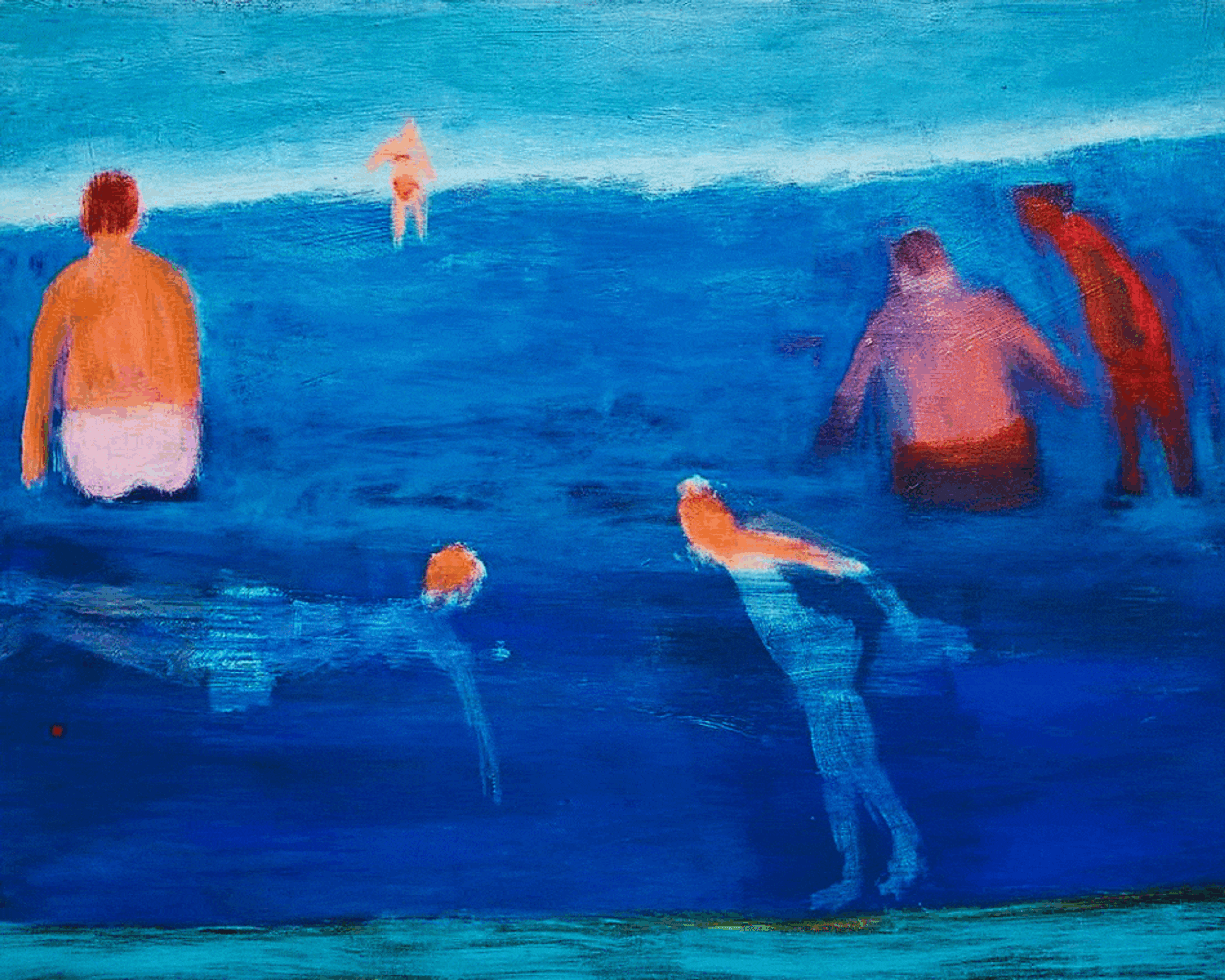 In Divers, Bradford portrays two of her signature swimsuit-clad figures diving into a pool of swirling green water, their heads and torsos obscured beneath the surface. This strange yet intimate scene reflects the artist’s ongoing exploration of transparency and the evocative image of the human body in water.