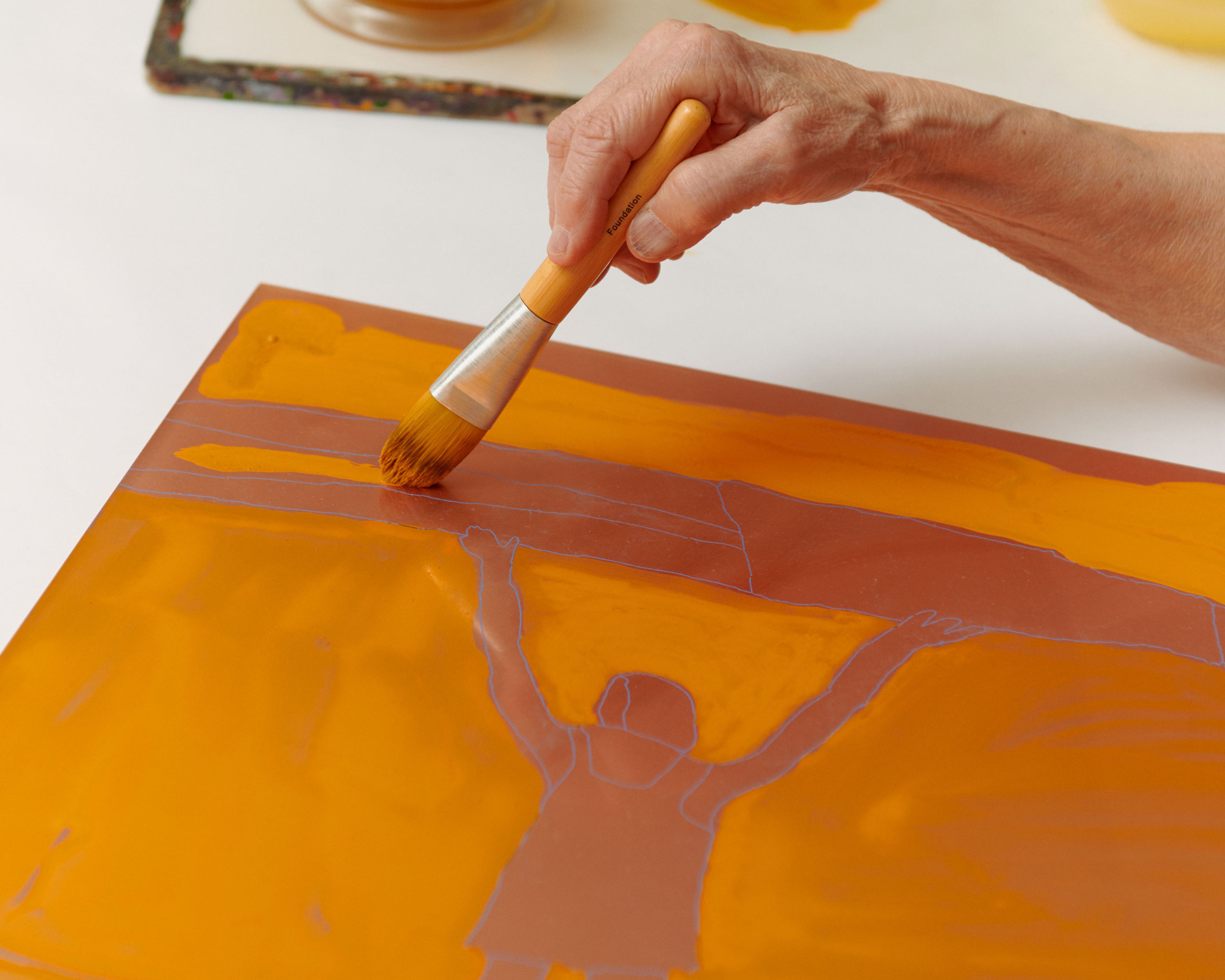 After the background and figures were printed, Bradford meticulously painted each print with acrylic paint, rendering the water and adding highlights to the figures and horizon line. As a result, each impression is unique.