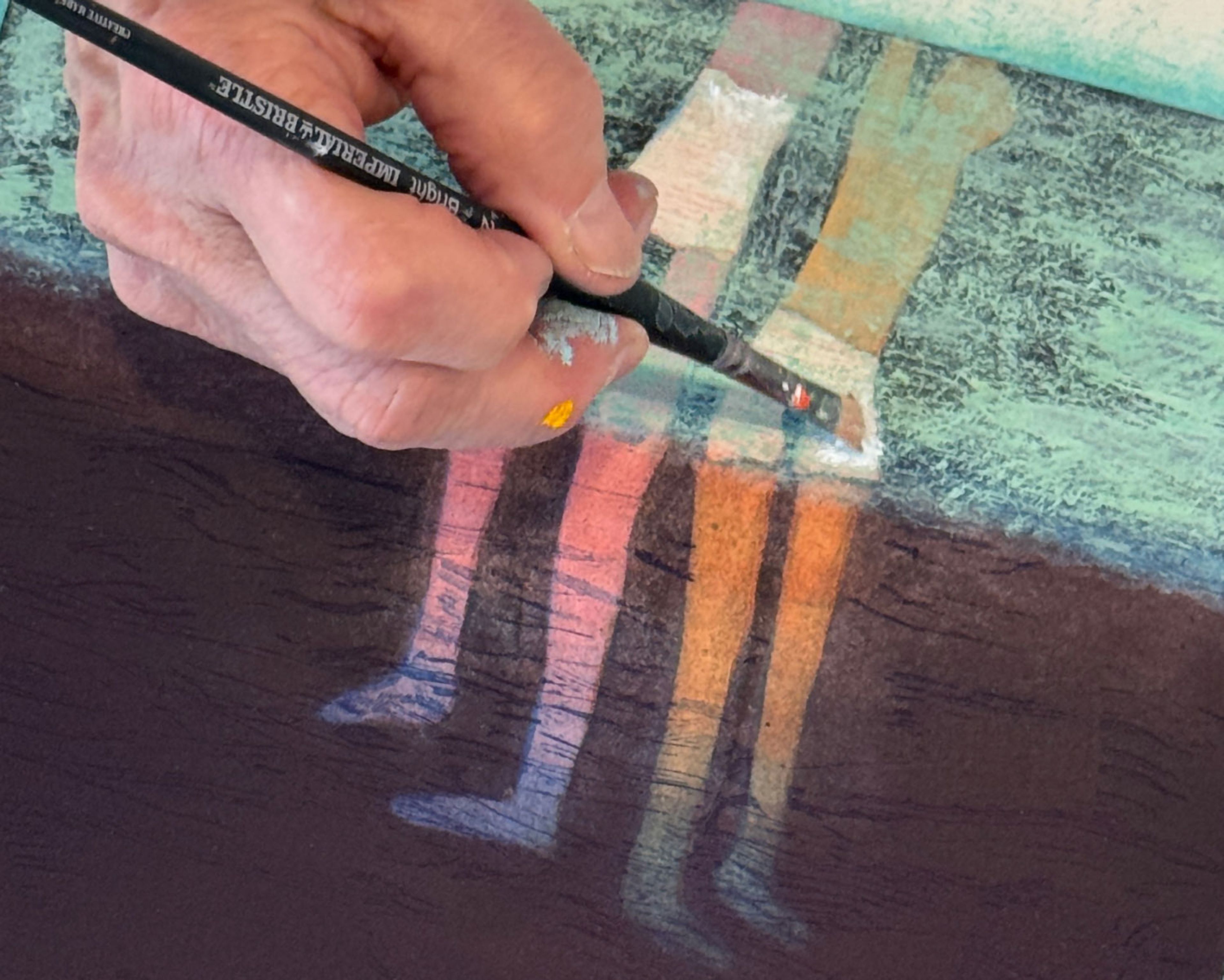 In her Brooklyn studio, Bradford finishes each print with hand-painted acrylic details, bringing the water, figures, and horizon line to life with subtle, unique variations within each print.