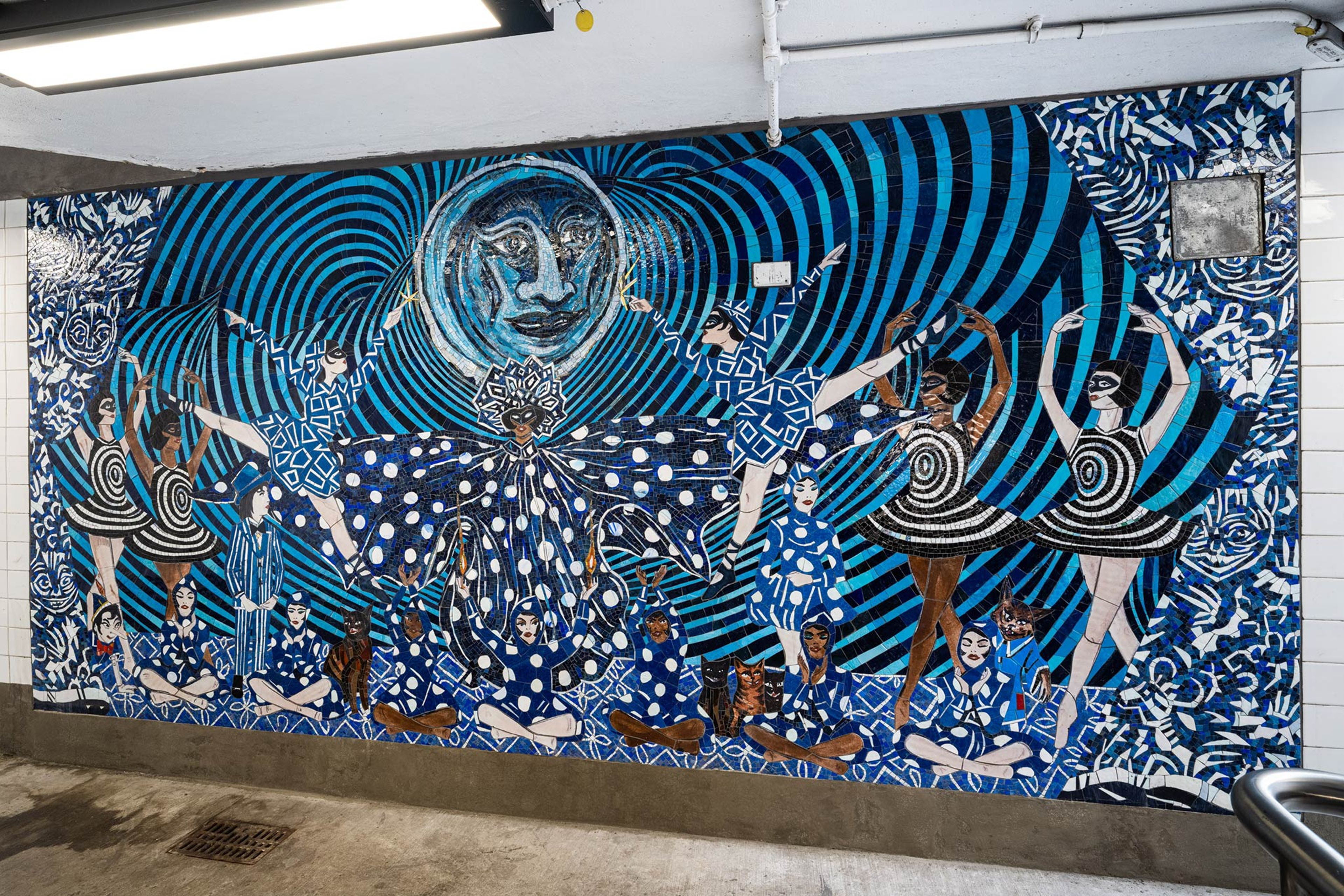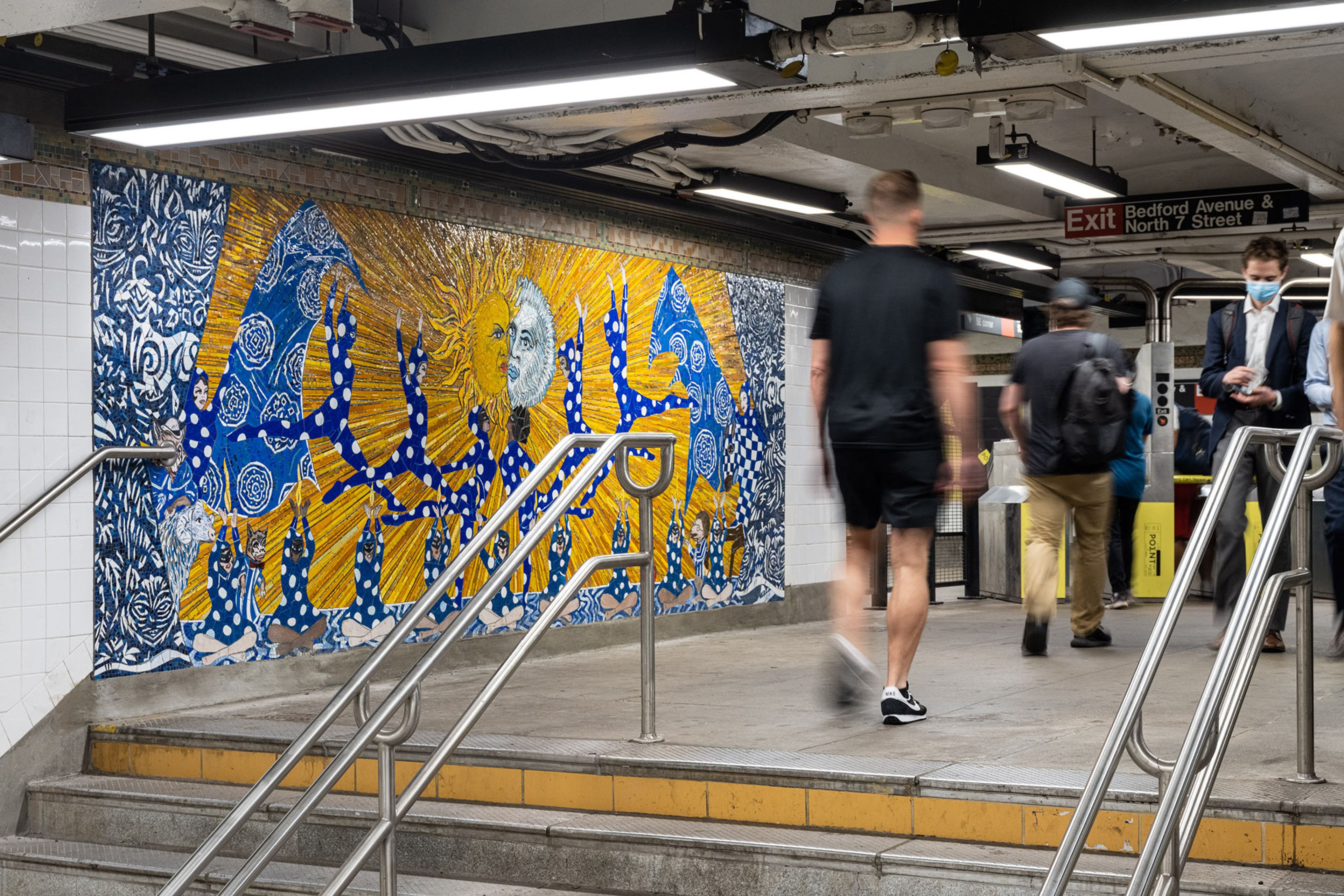 At Bedford Avenue Station, Brooklyn based artist Marcel Dzama depicts the hopeful beauty of the sun and the moon’s illuminated mysteries in four mosaic panels. Inspired by Walt Whitman's "Crossing Brooklyn Ferry", the sun and moon rise and set on the city and its constant flow of people throughout time. Depicted in radiant gold and dazzling blue, 400 square feet of glass mosaic fabricated by Mayer of Munich appear in locations at the mezzanine and new stairways at the Driggs Avenue end of the station. Marcel Dzama states “In these works it is my intention to bring the sun, the sky, and the moon to the underground. What I love most about New York is its people, and for me it was important to represent them and all of their wonderful complexities and diverse beauty in the piece. People looking and quietly observing together. In the subway, it’s always a togetherness that bonds us uniquely like no other place in the world.”