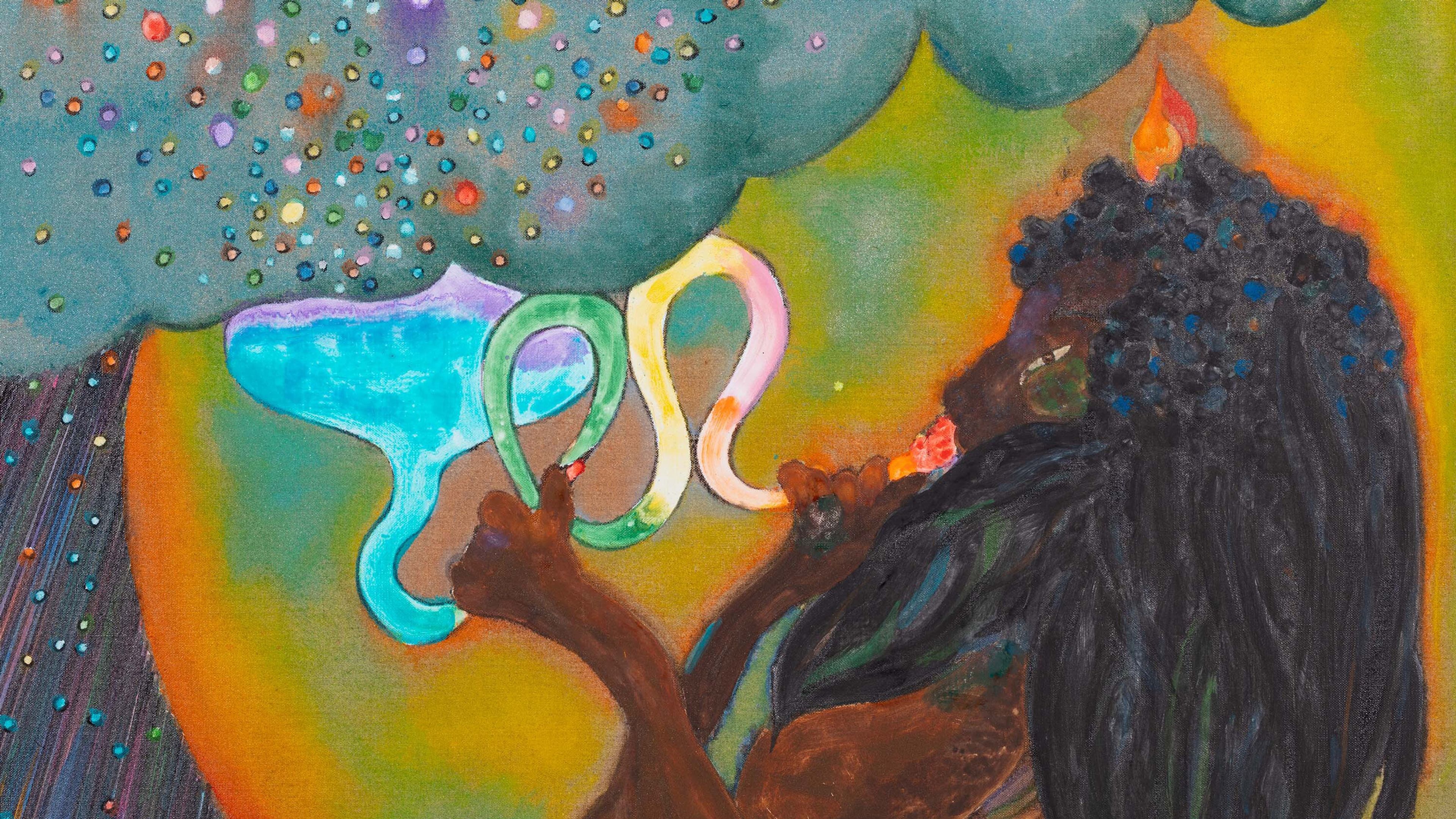 Chris Ofili (b. 1968) creates atmospheric and enigmatic paintings investigate the intersection of desire, identity, and representation. Portraying characters from a range of aesthetic and cultural sources through a kaleidoscopic visual mode that bridges abstraction and figuration, his works serve as sites for journeys of creative transformation.