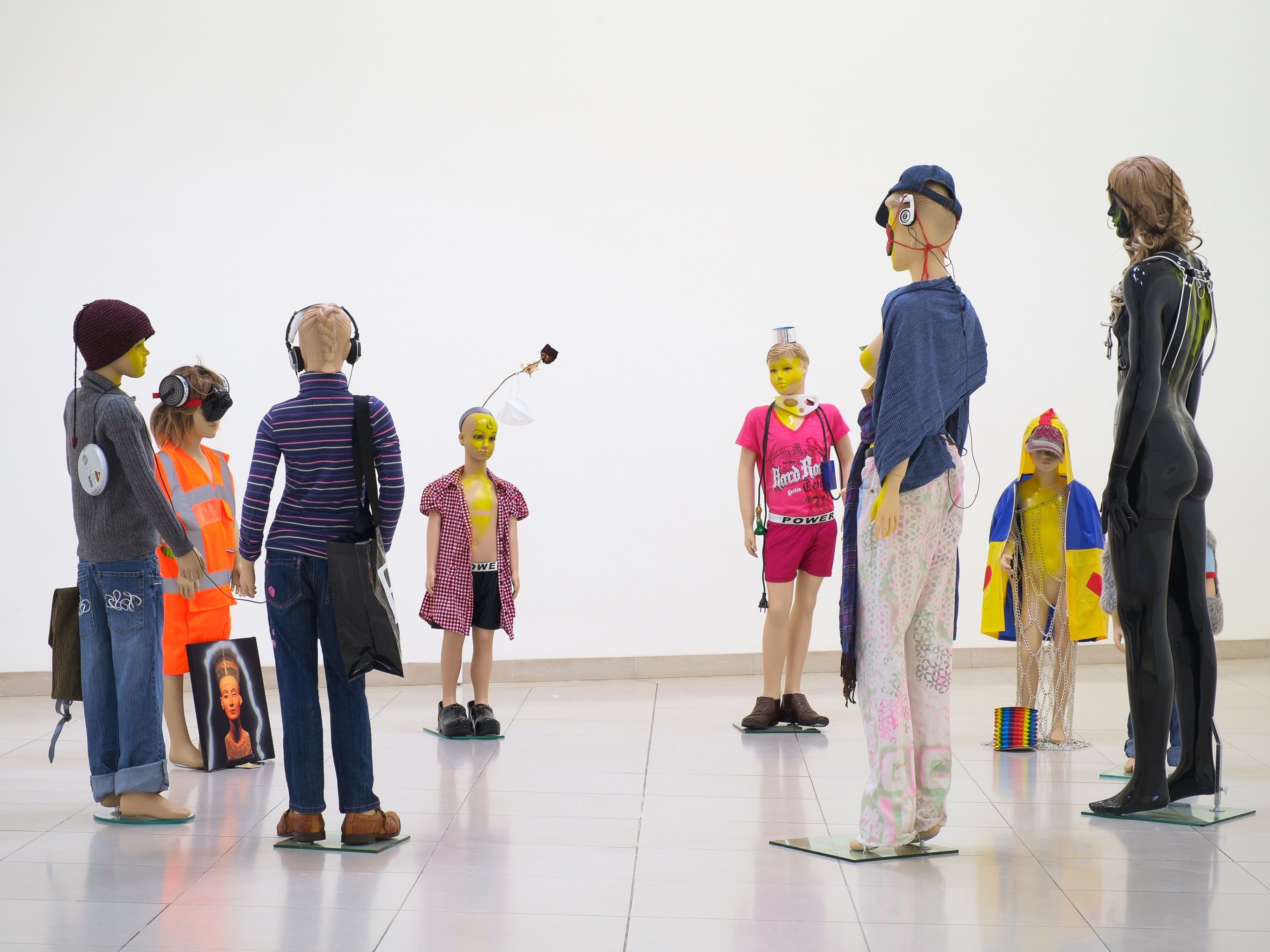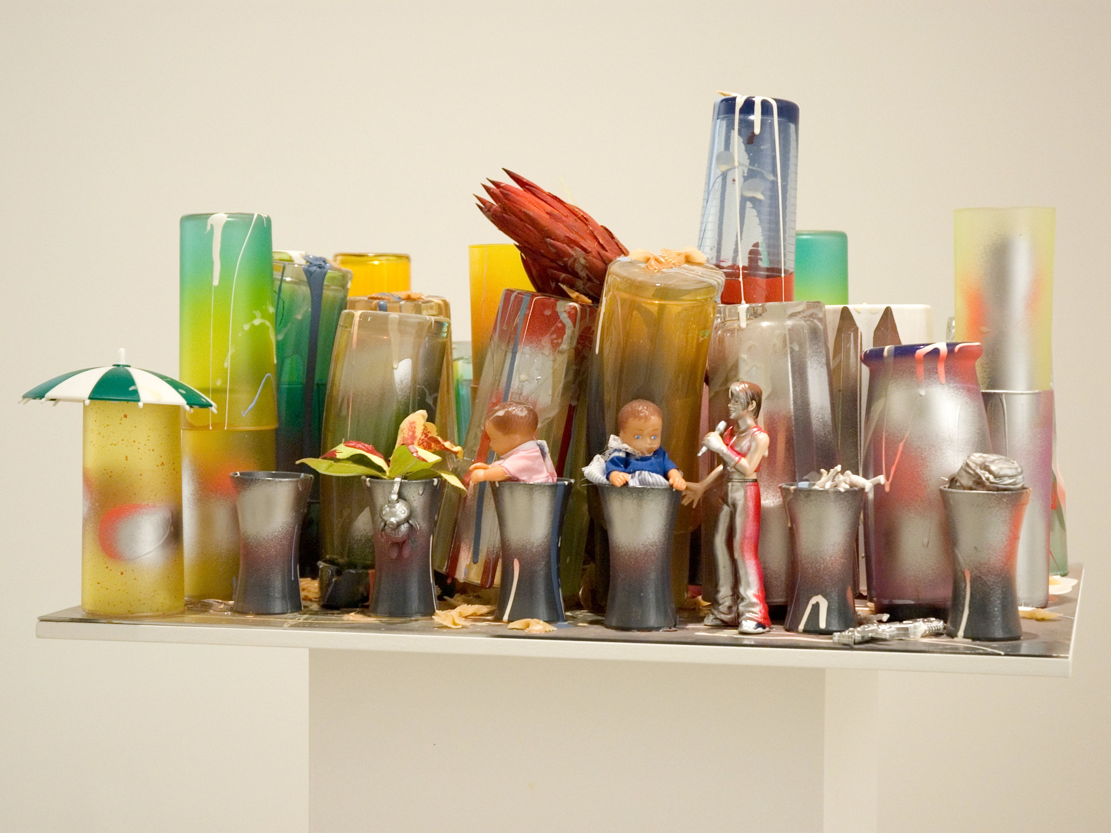 Lacquer paint, paint can, photo holder, cardboard, plastic lid, glue, ash, paper, tissue, tape, plastic foil, c-print, toy figure, cigarette, plastic wrapper, mirror foil, and sticker on aluminum panel