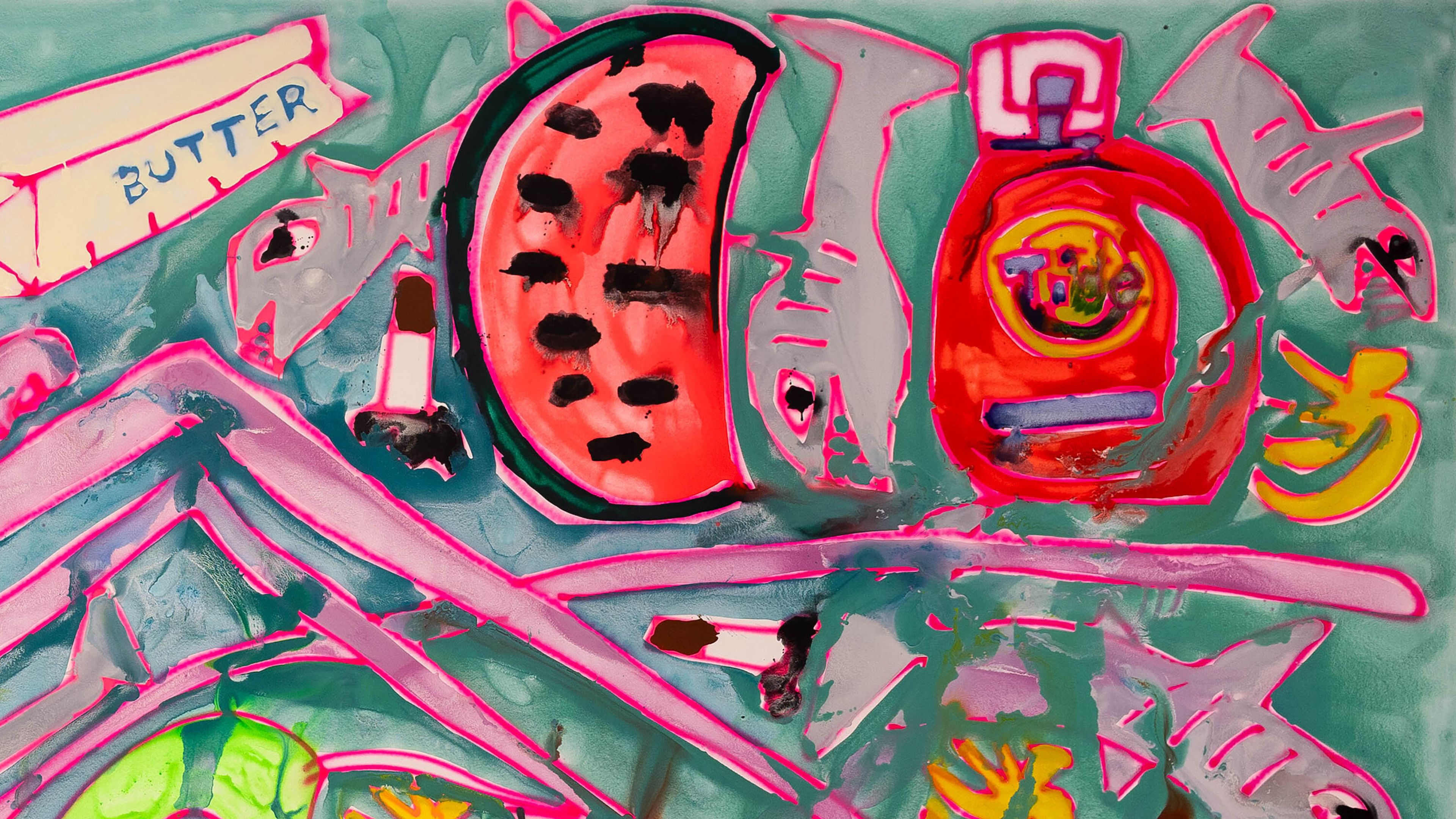 Katherine Bernhardt’s (b. 1975) boundless visual appetite has established her as one of the most energetic painters working today. Her trust in the fundamental underpinnings of painting gives her the freedom to depict anything she wants, and the democratizing surfaces of her canvases work without illusion, perspective, logical scale shifts, or atmosphere. With Bernhardt’s blunt yet lyrical approach, each painting has the feel of a complete thought that engages rich and raucous free association.