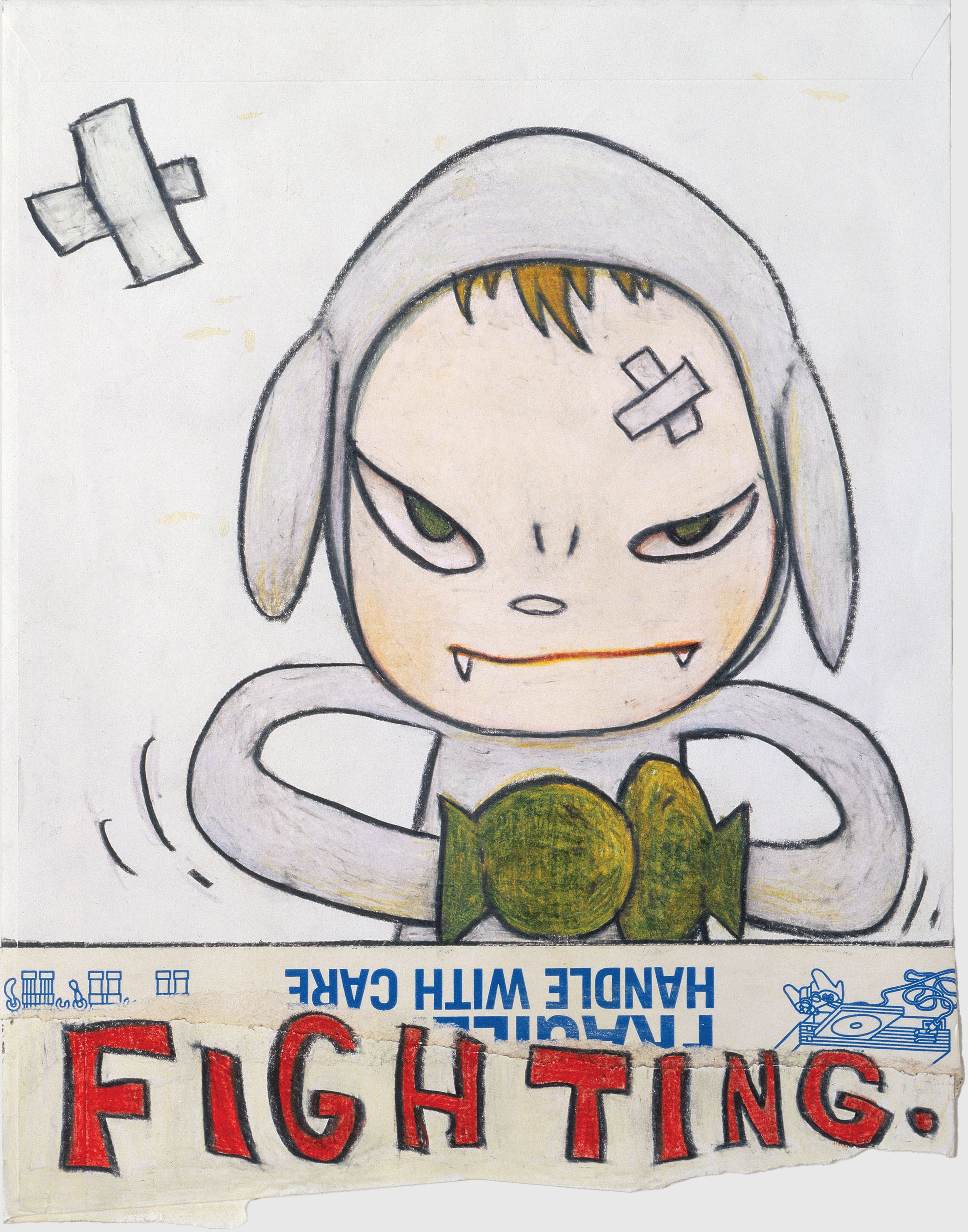 Nara has been the subject of solo exhibitions globally since the late 1980s. His first institutional solo presentation, Cup Kids, was held in 1995 at the Museum of Contemporary Art, Nagoya, Japan. In 1998, the Institute of Visual Arts at University of Wisconsin, Milwaukee, presented Nara’s first solo museum exhibition in the United States. Further significant solo exhibitions of Nara’s work include Walk On, Museum of Contemporary Art, Chicago (2000); Lullaby Supermarket, Santa Monica Museum of Art, Los Angeles (2000); and I DON’T MIND, IF YOU FORGET ME., Yokohama Museum of Art, Kanagawa (2001).