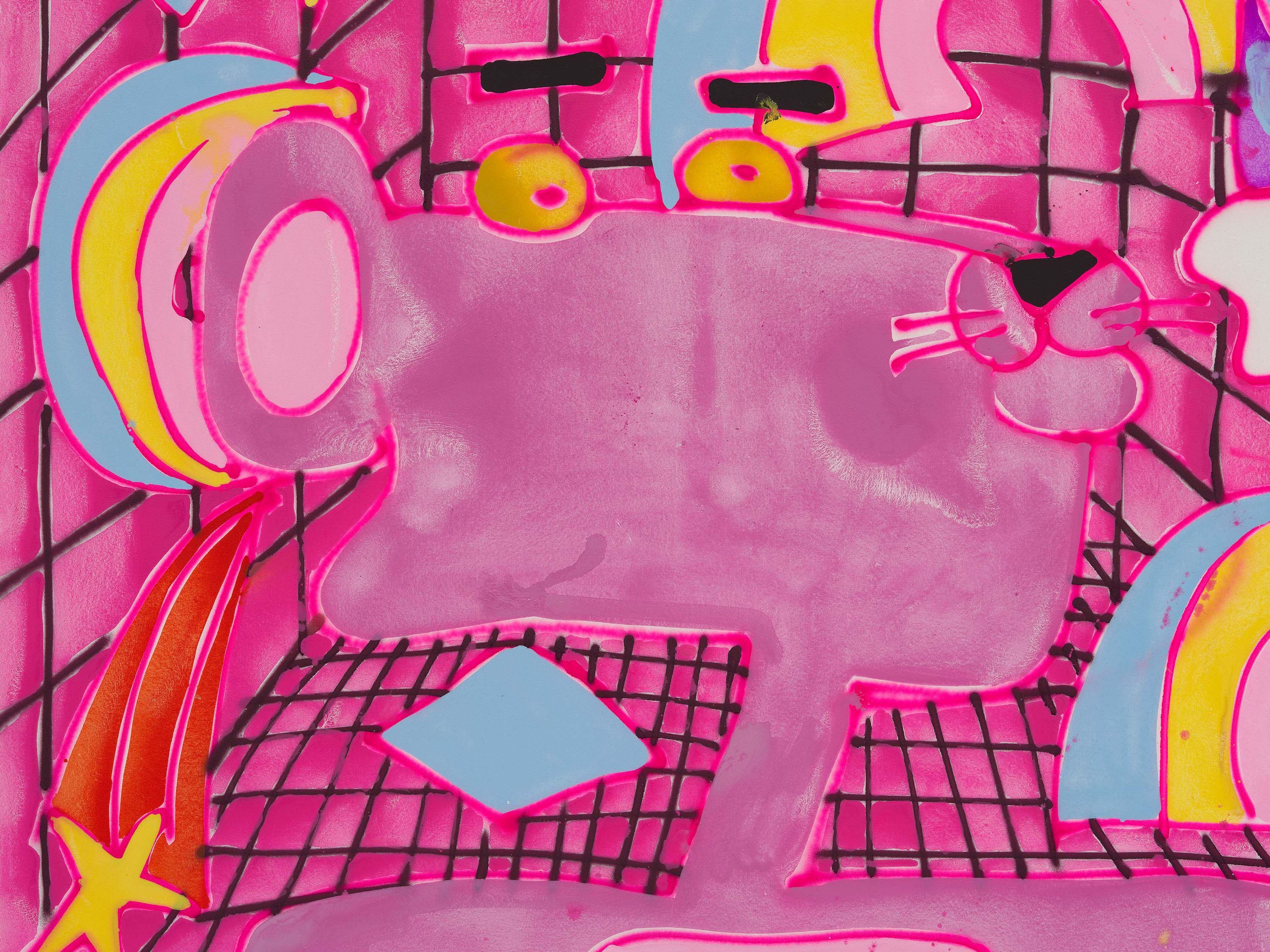 A detail from a painting by Katherine Bernhardt, titled Shihab, dated 2024.