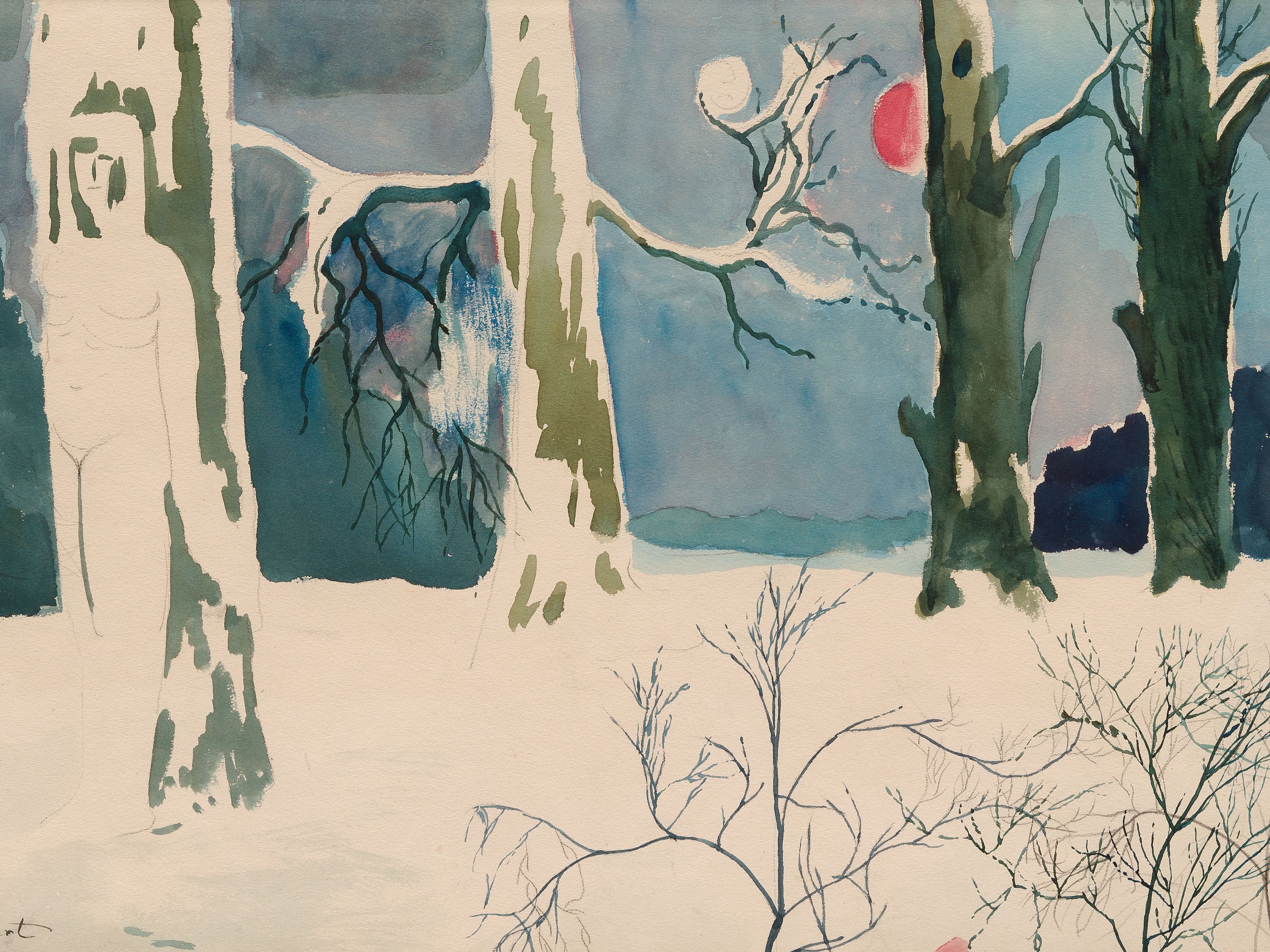 Léon Spilliaert Nu féminin sous des arbres enneigés au clair de lune rouge (Female Nude under Snowy Trees with Red Moon), 1917