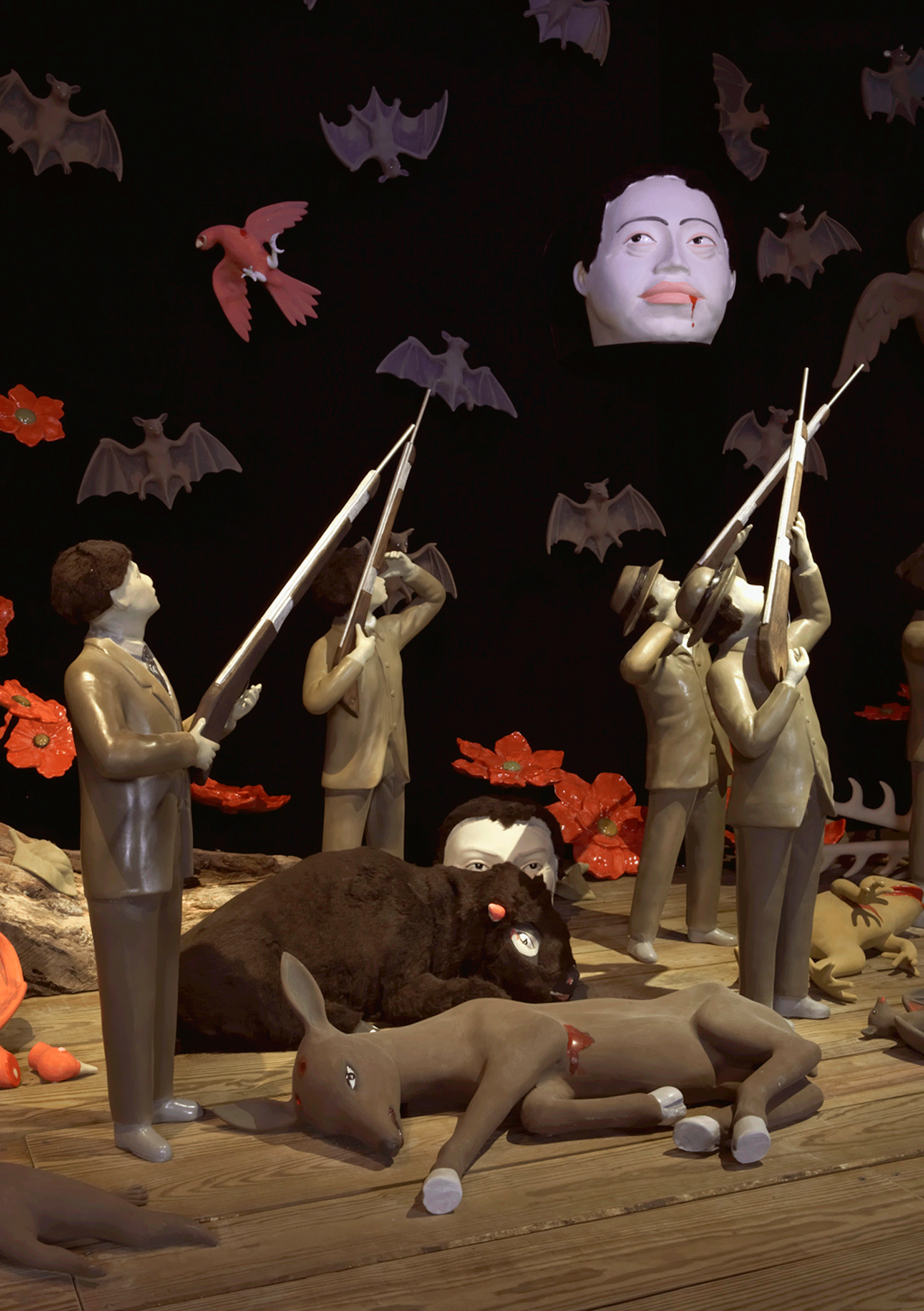 Diorama: wood, glazed ceramic sculptures, metal, fabric
