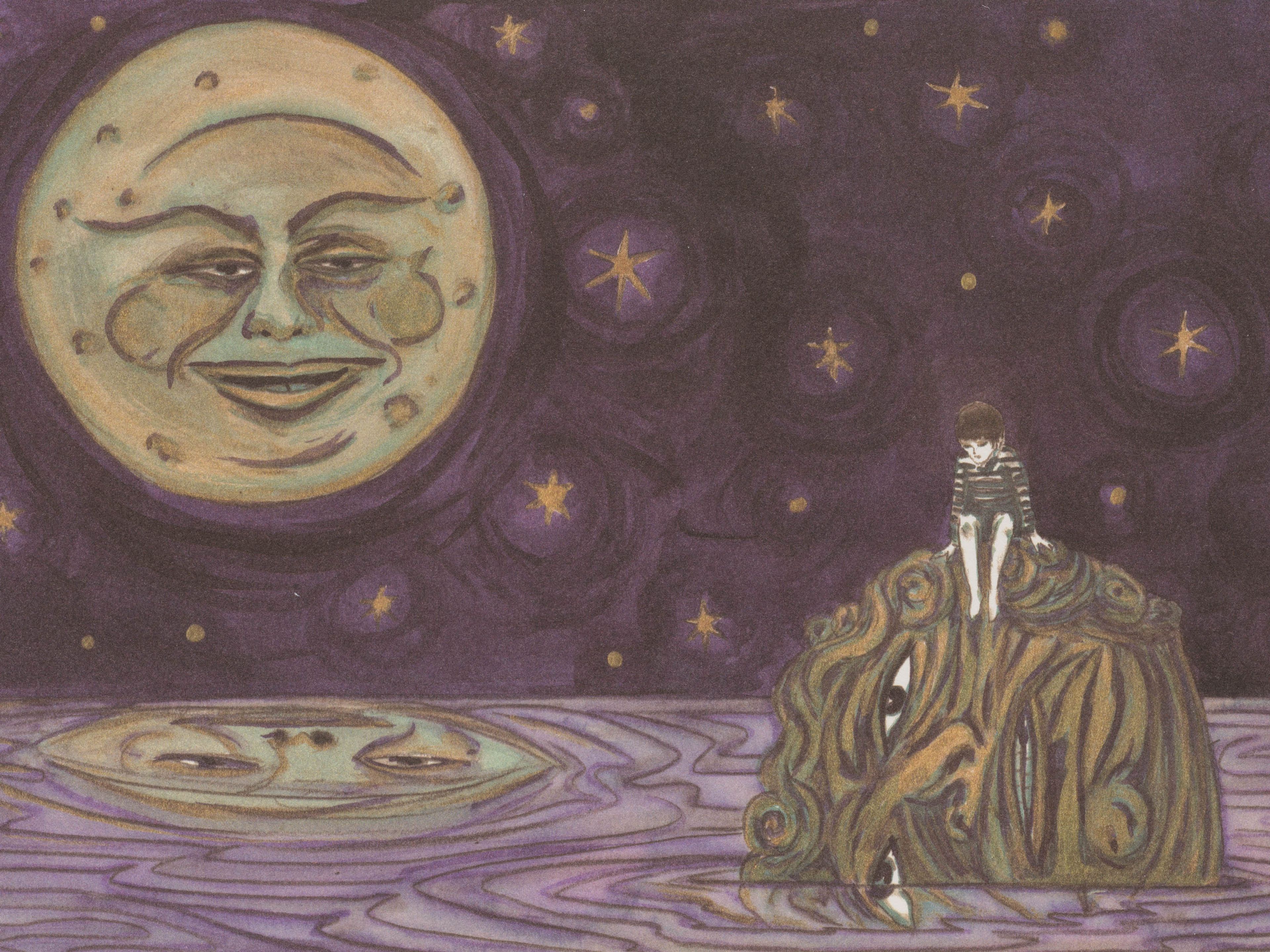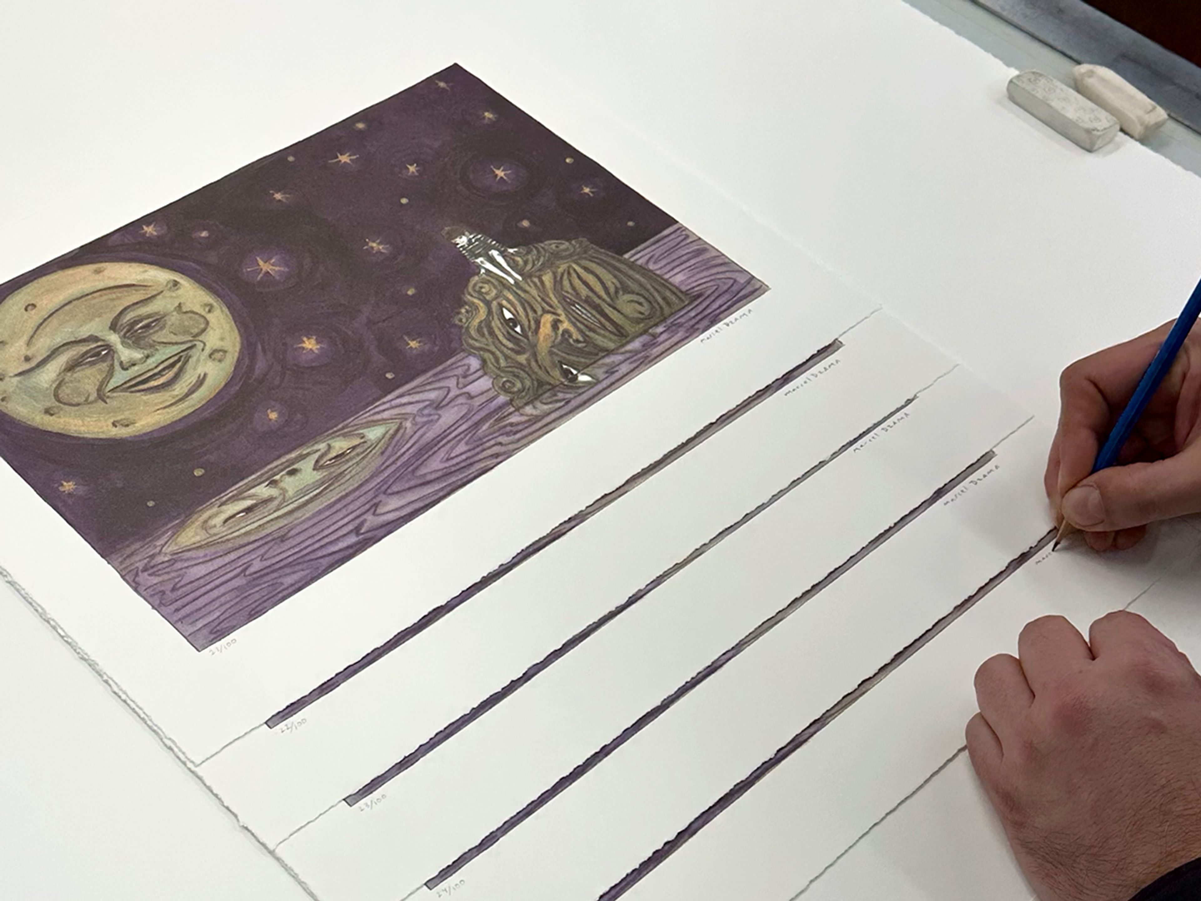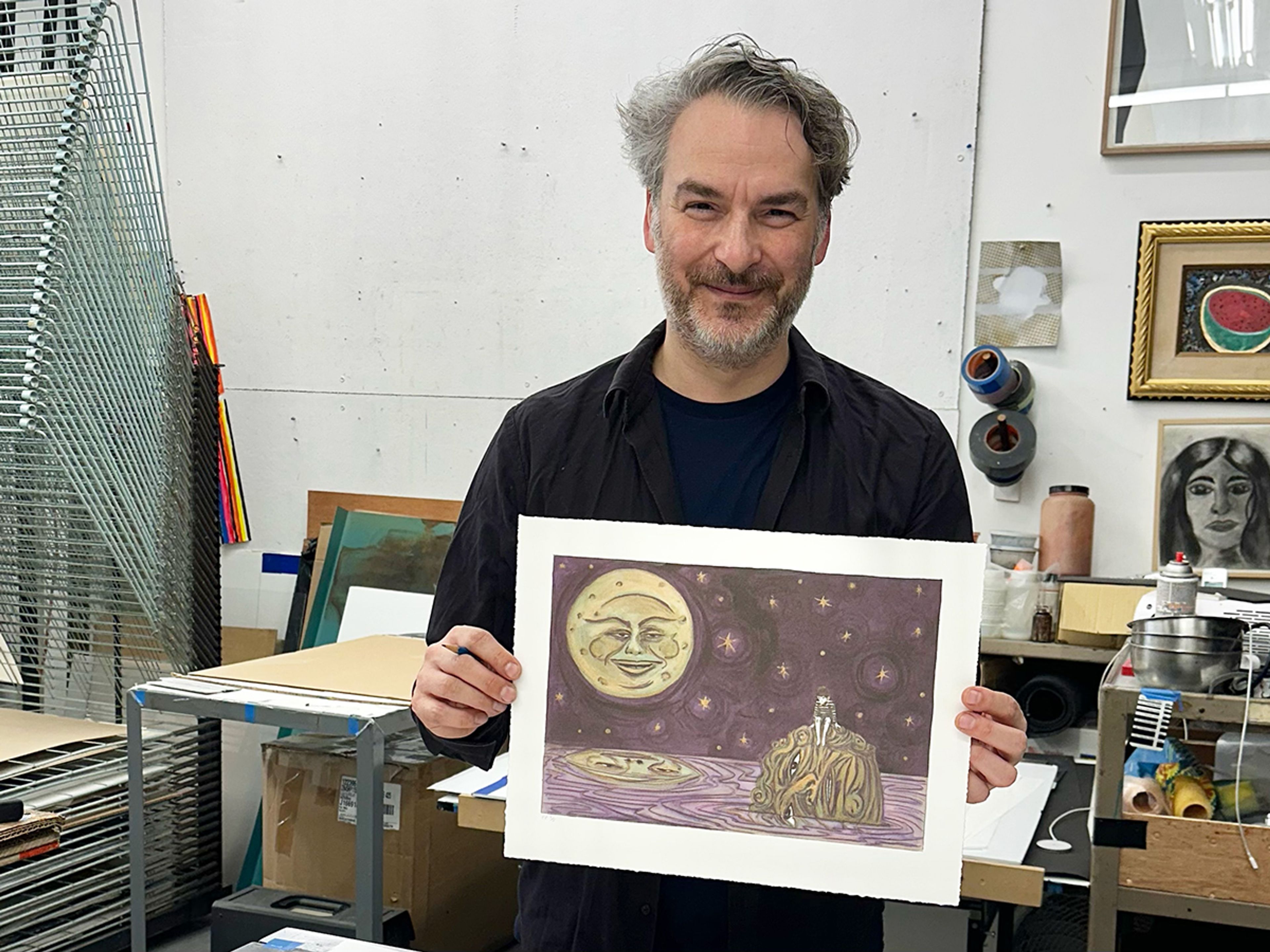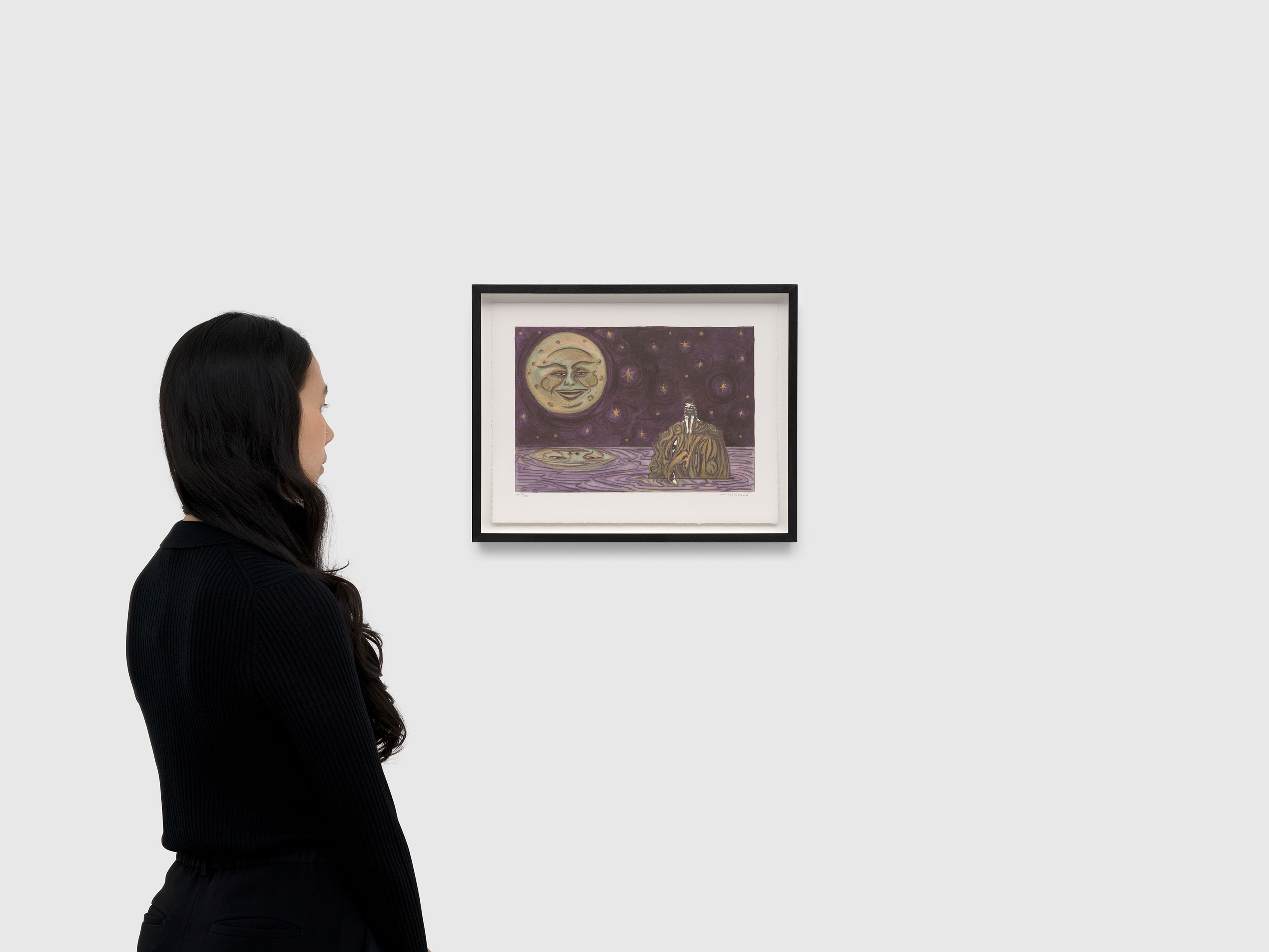 In this lithograph, a solitary boy sits atop the head of a statuesque goliath, which floats in a purple sea. In the sky above, a smiling moon—reminiscent of the iconic lunar face in Georges Méliès’s 1902 film A Trip to the Moon—casts its gaze upon the scene. This work relates to The end of gods and monsters (2024), a drawing featured in the artist's 2025 solo exhibition at David Zwirner Los Angeles. The show presented works depicting fantastical visions of a world where animals, anthropomorphized creatures, and dancing figures appear against dense junglescapes and expansive skies. This print and the drawing use allegory as a critical means of commenting on growing threats to democracy and human rights. Evoking a sense of joy and wonder, these scenes suggest hope and possibility during times of unrest. All proceeds from the sale of Redemption in Moonlight (2025) go to Performa, a New York–based organization dedicated to supporting the performing arts. In 2023, Dzama was commissioned by Performa to create a film and performance; the resulting work, To live on the Moon (For Lorca), premiered at that year's Performa Biennial at the Abrons Art Center in New York.