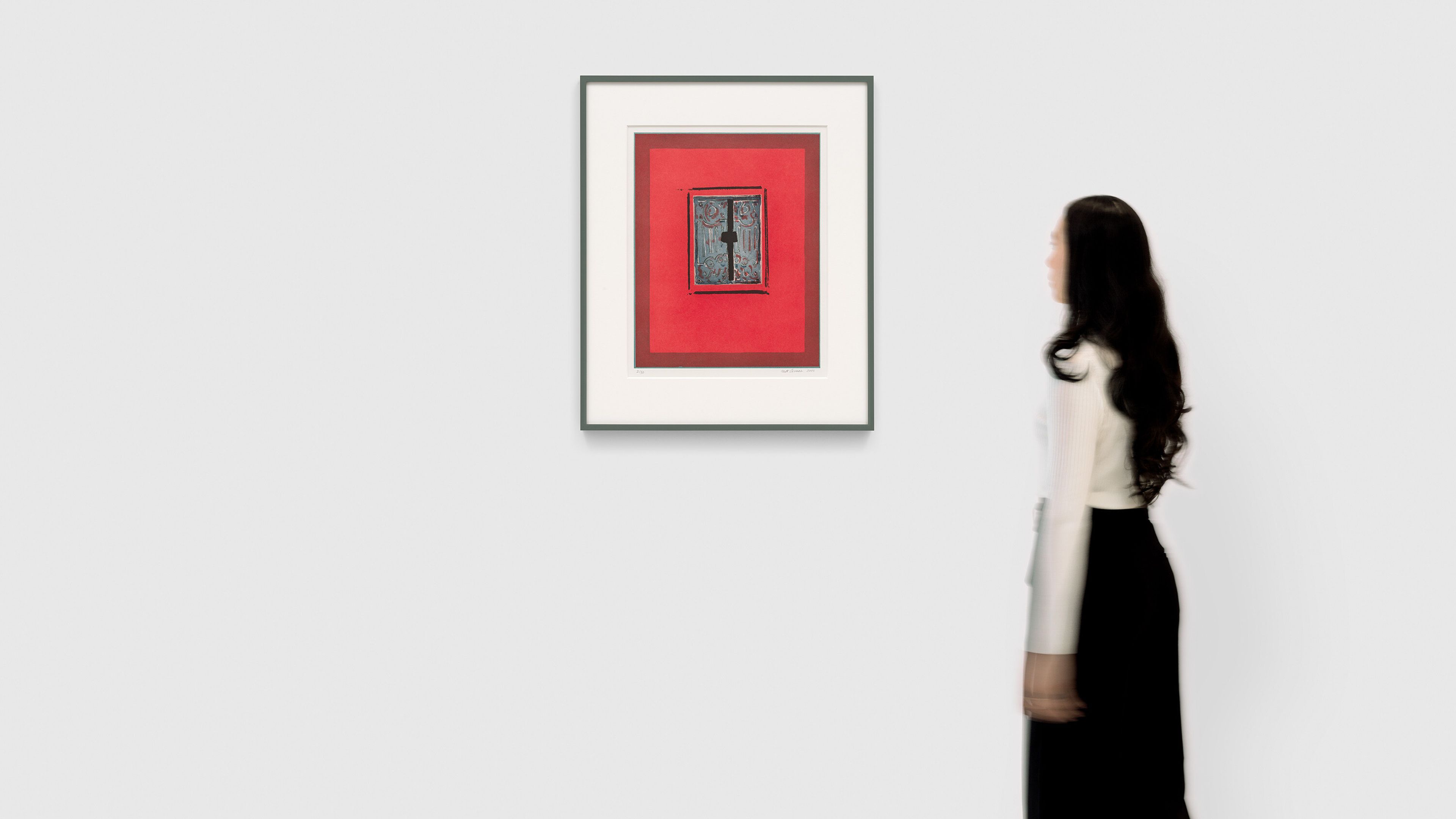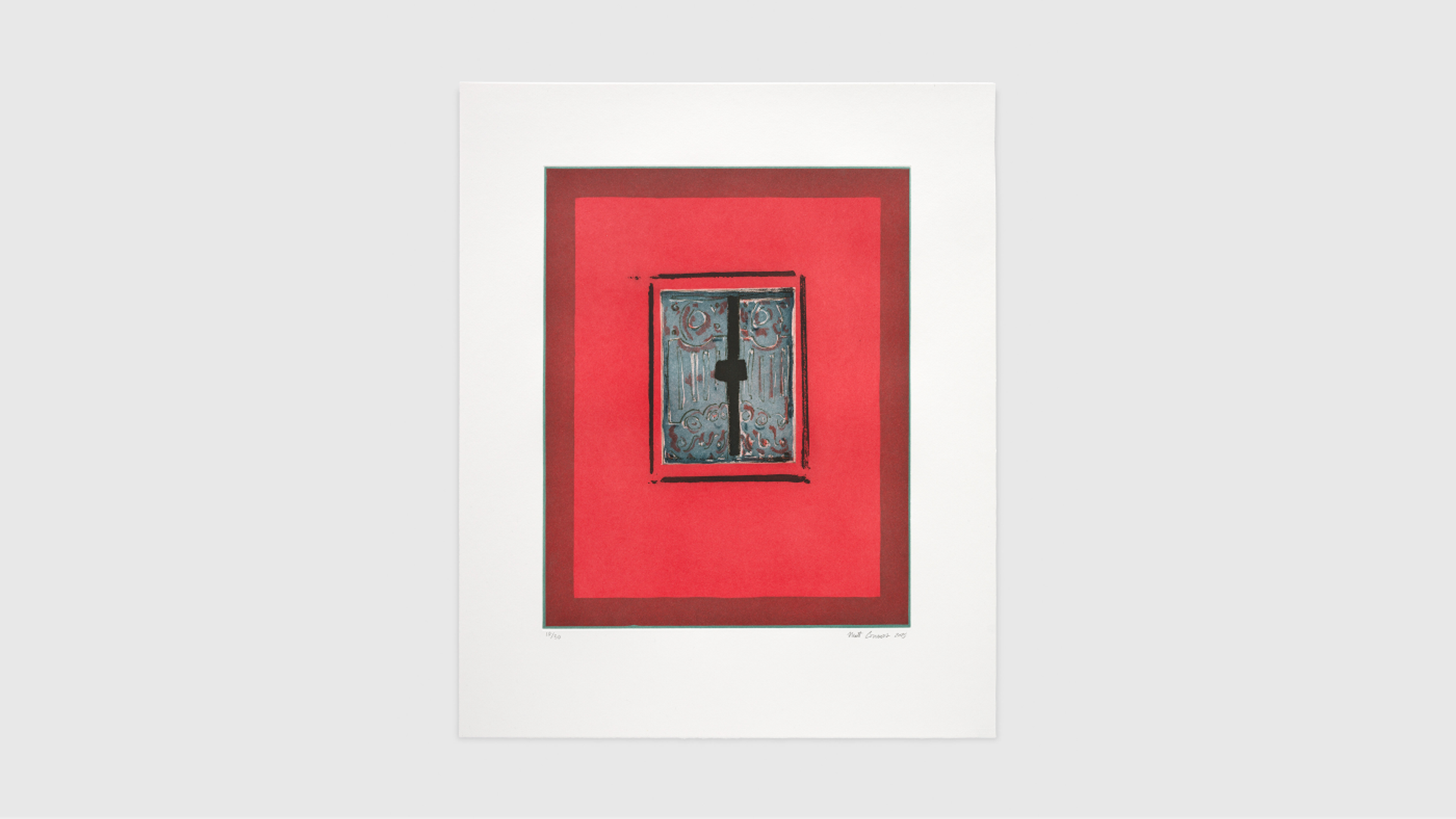 In creating his abstractions, Connors often works from such images of objects or objects themselves as a starting point. The compositional source of the present etching is a photograph of the doors of a wood-burning cast-iron stove, which has also served as the basis for drawings and paintings the artist has made, including Impressed Wet Heater (2025). Working with master printer Sarah Madden, Connors used aquatint to explore the nuance and depth of layered color in the etching process. The print also speaks to his interest in the concept of mise en abyme ("picture within a picture"), as the various color fields overlap and produce a sequence of parallel borders and edges, here furthered by the unique frame selected by the artist that responds chromatically to the green edge of the image composition. Connors remarks, "I've recently been looking to the artist Man Ray, who is best known for his 'rayographs,' a camera-less photographic image made by placing objects directly onto light-sensitive paper and exposing it to light. Ray's paintings were equally materially direct and at times involved a process of impressing a painted surface onto another surface in order to create an image. The swiftness and material honesty of all of Man Ray's work inspired the method of this approach to the subject in question.”