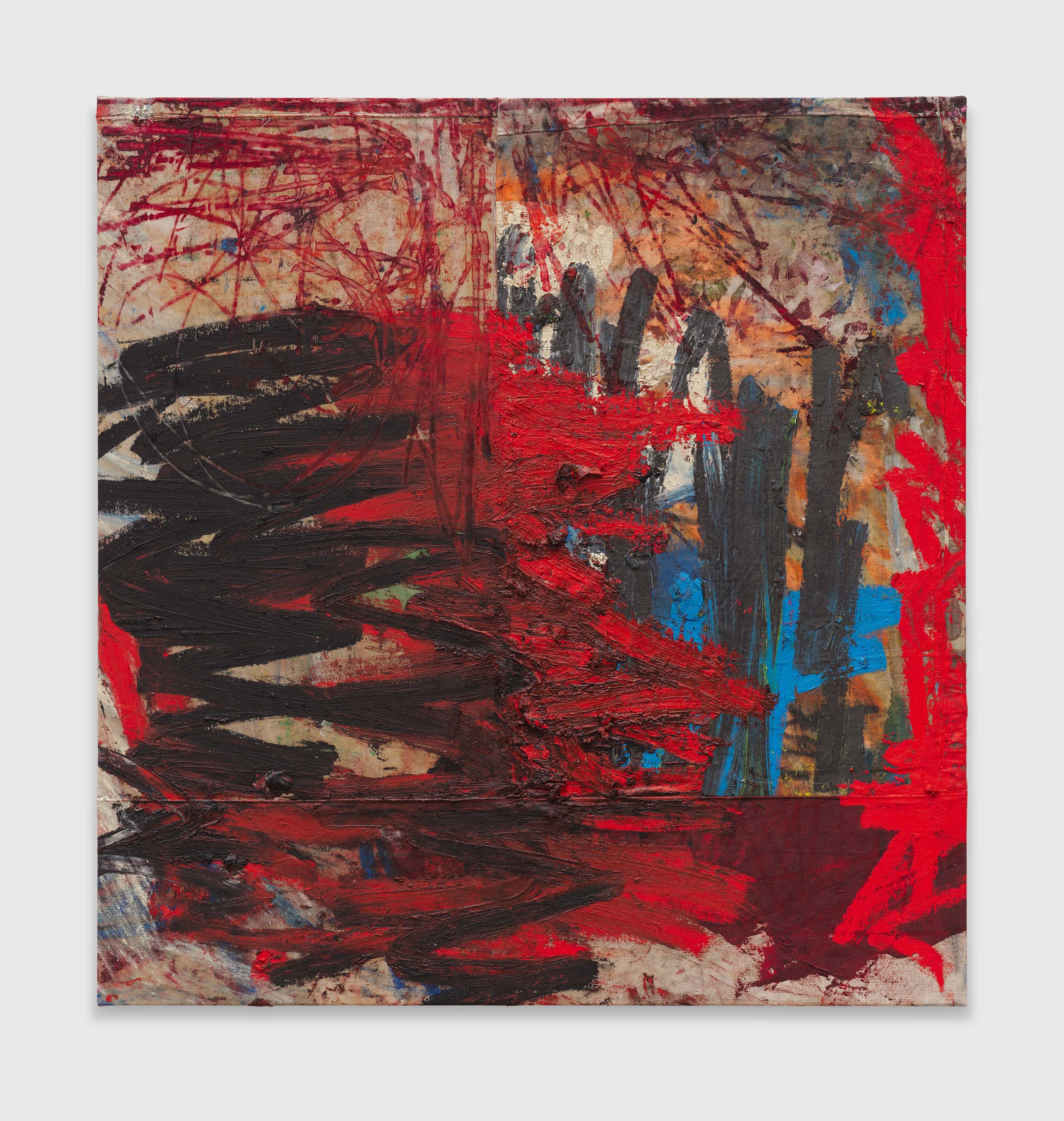 Oil, oil stick, spray paint, dirt, and graphite on canvas and linen