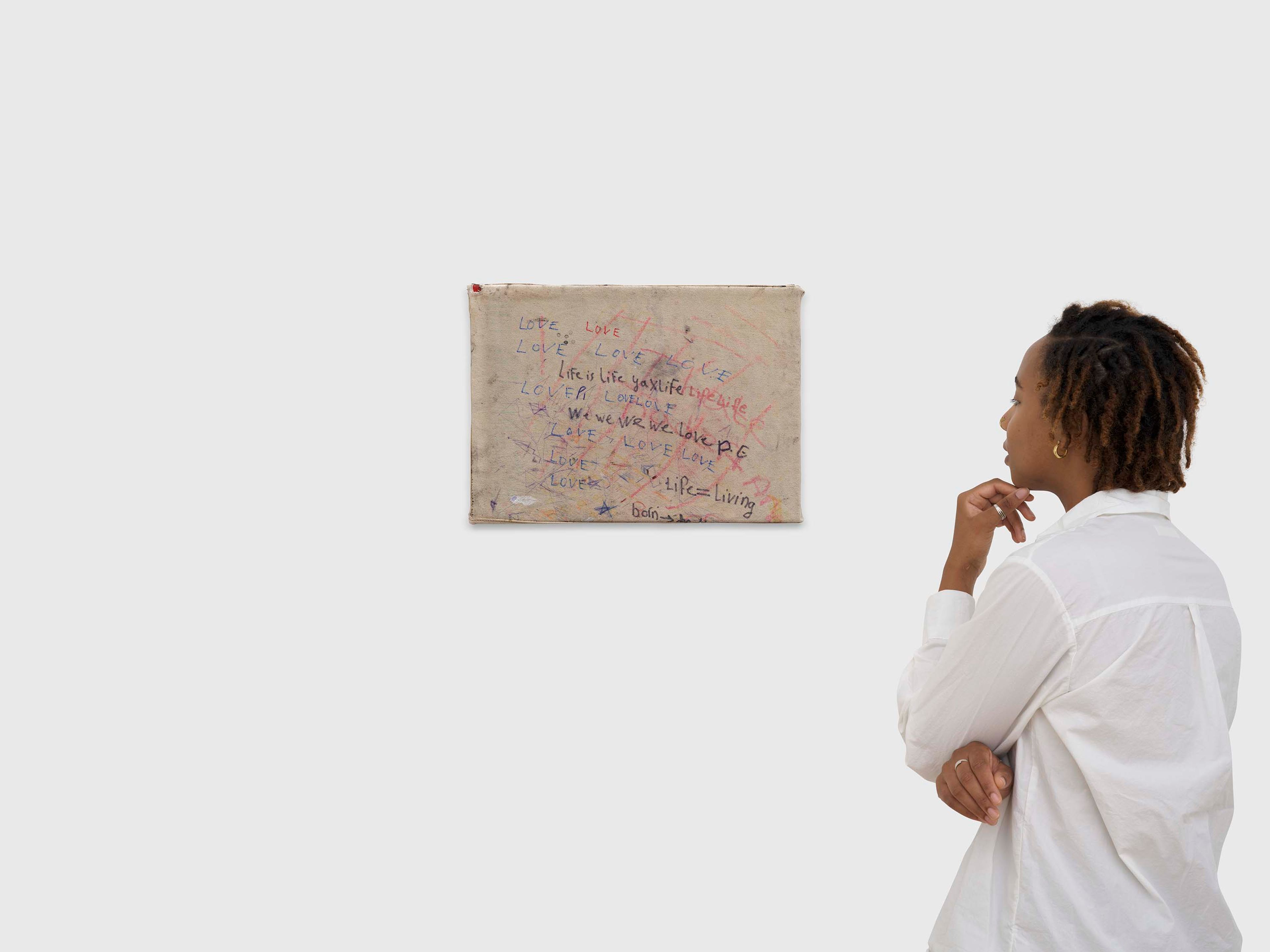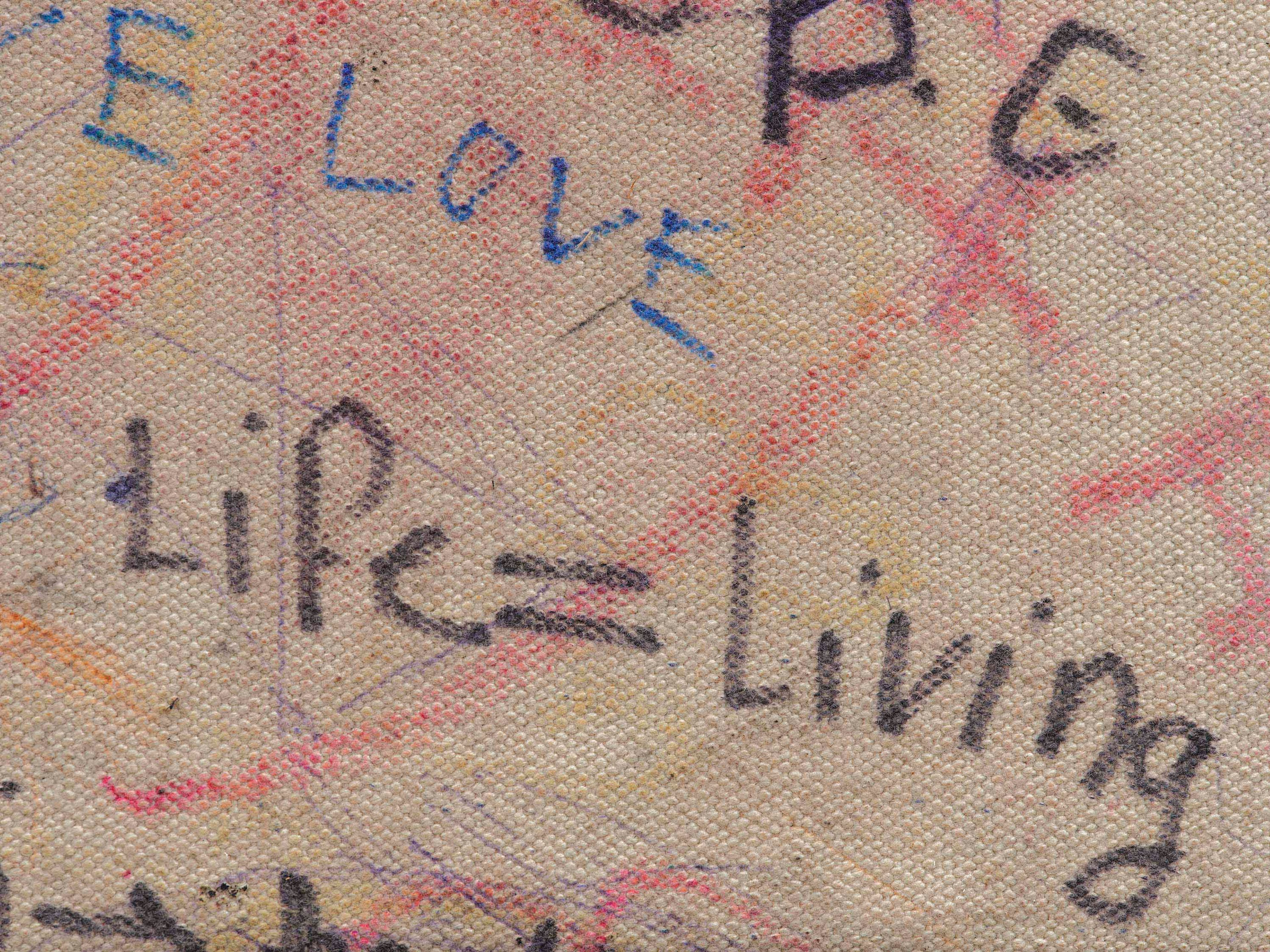 Oil stick, ballpoint pen, fountain pen, felt tip pen, highlighter pen, permanent marker, paint, crayon, staples, natural pigments, debris and other mixed media on canvas