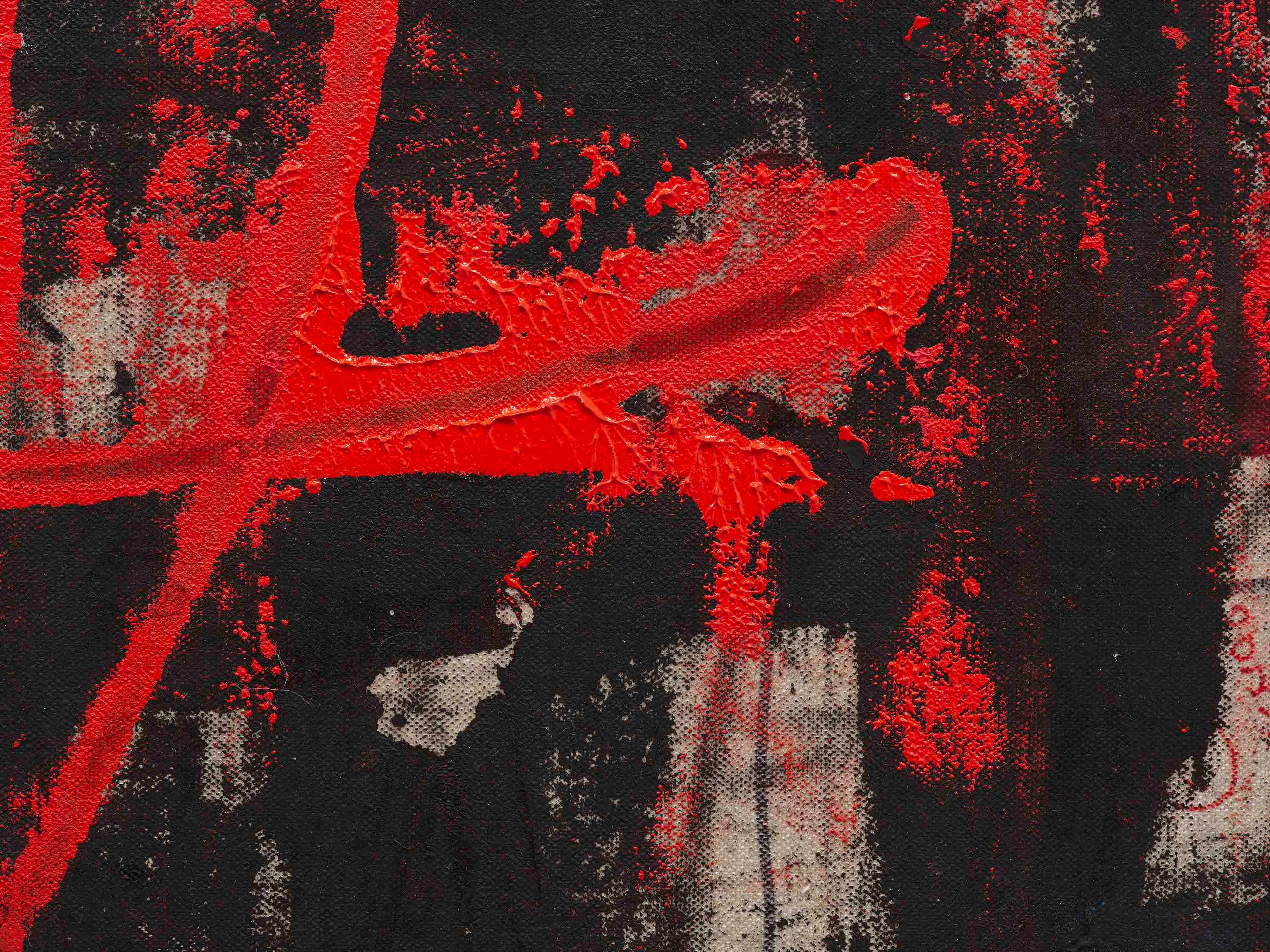 Oil, oil stick, ballpoint pen, fountain pen, graphite, felt tip pen, highlighter pen, permanent marker, paint, crayon, staples, natural pigments, debris and other mixed media on canvas