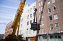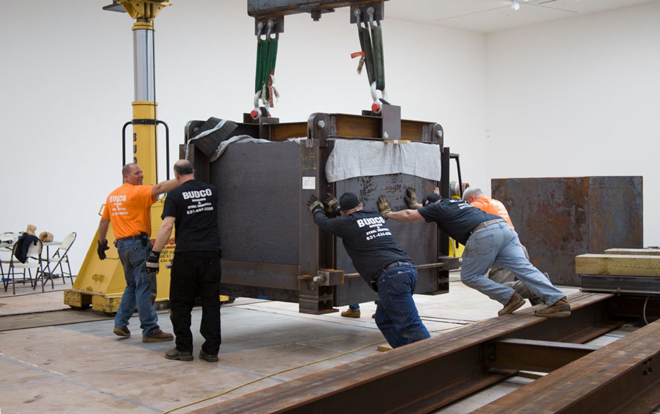 Richard Serra's Equal (2015) being installed in 537 West 20th Street, New York, for Richard Serra: Equal, 2015. As Vulture noted, "The artist's latest work, Equal, a series of paired 40-ton stacked steel cubes now on display at David Zwirner's West 20th Street gallery, required master riggers, hydraulic gantries, and a custom runway just to be installed in a building itself expressly designed to accommodate artists' big ideas."