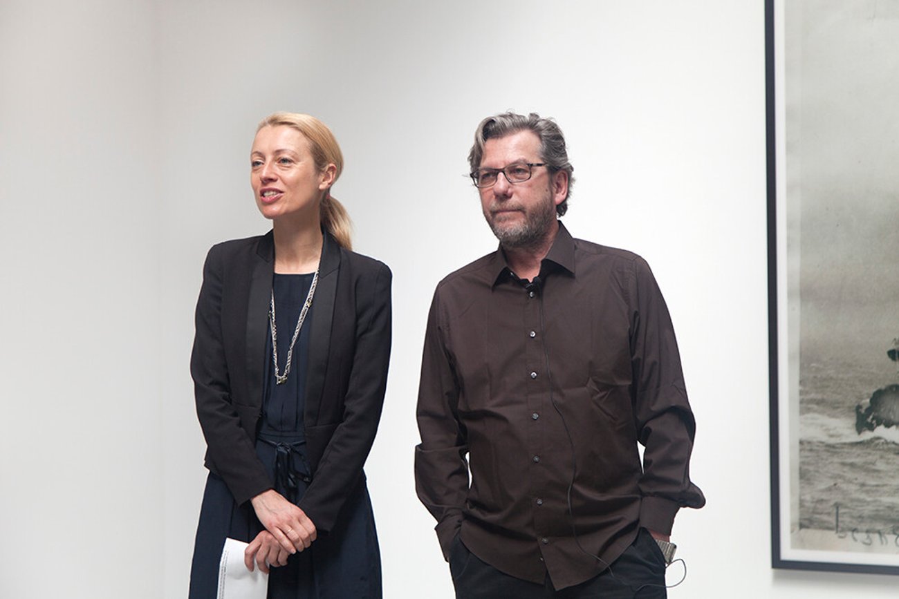 Veronique Ansorge, Director, and Thomas Ruff at the opening of Thomas Ruff: press++, 533 West 19th Street, New York, 2016