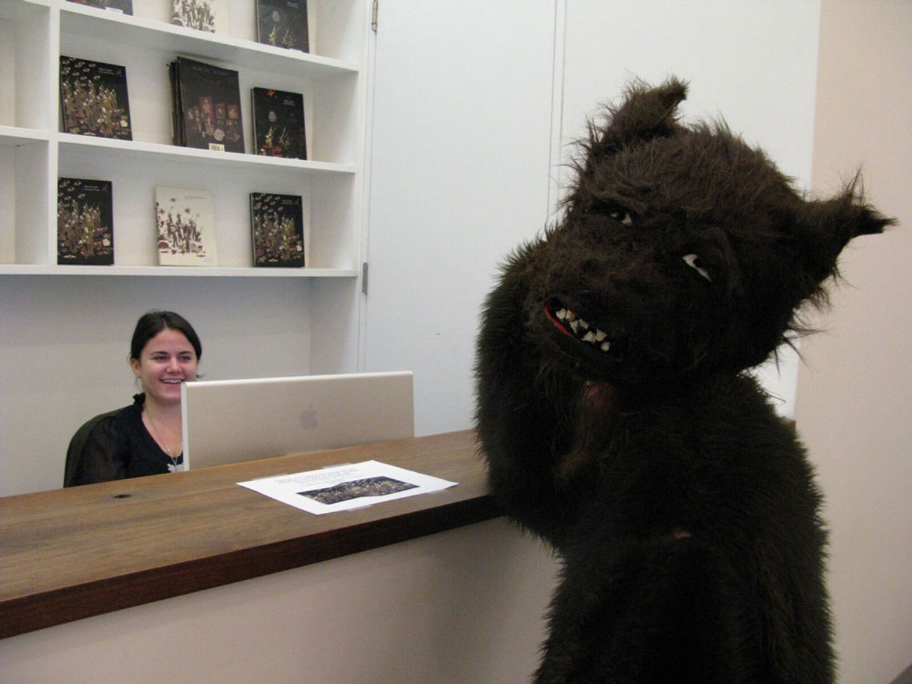 Marcel Dzama incognito at the book signing for the catalogue published on the occasion of his gallery solo show Marcel Dzama: Even the Ghost of the Past, 519 West 19th Street, New York, 2008. TimeOut's reporter recalled, "[Spike] Jonze assured me that a real live bear, borrowed from the Central Park Zoo, would be joining us for the book signing."