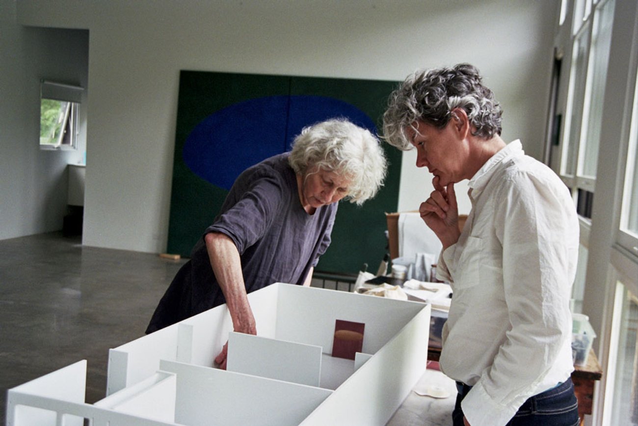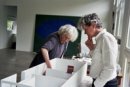 Suzan Frecon and Bellatrix Hubert laying out the artist's 2017 solo exhibition Suzan Frecon: recent oil paintings at her studio in upstate New York, 2017