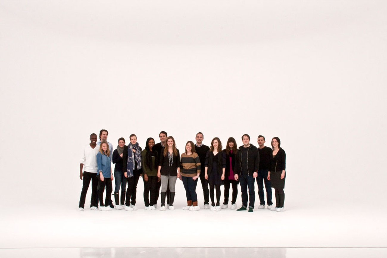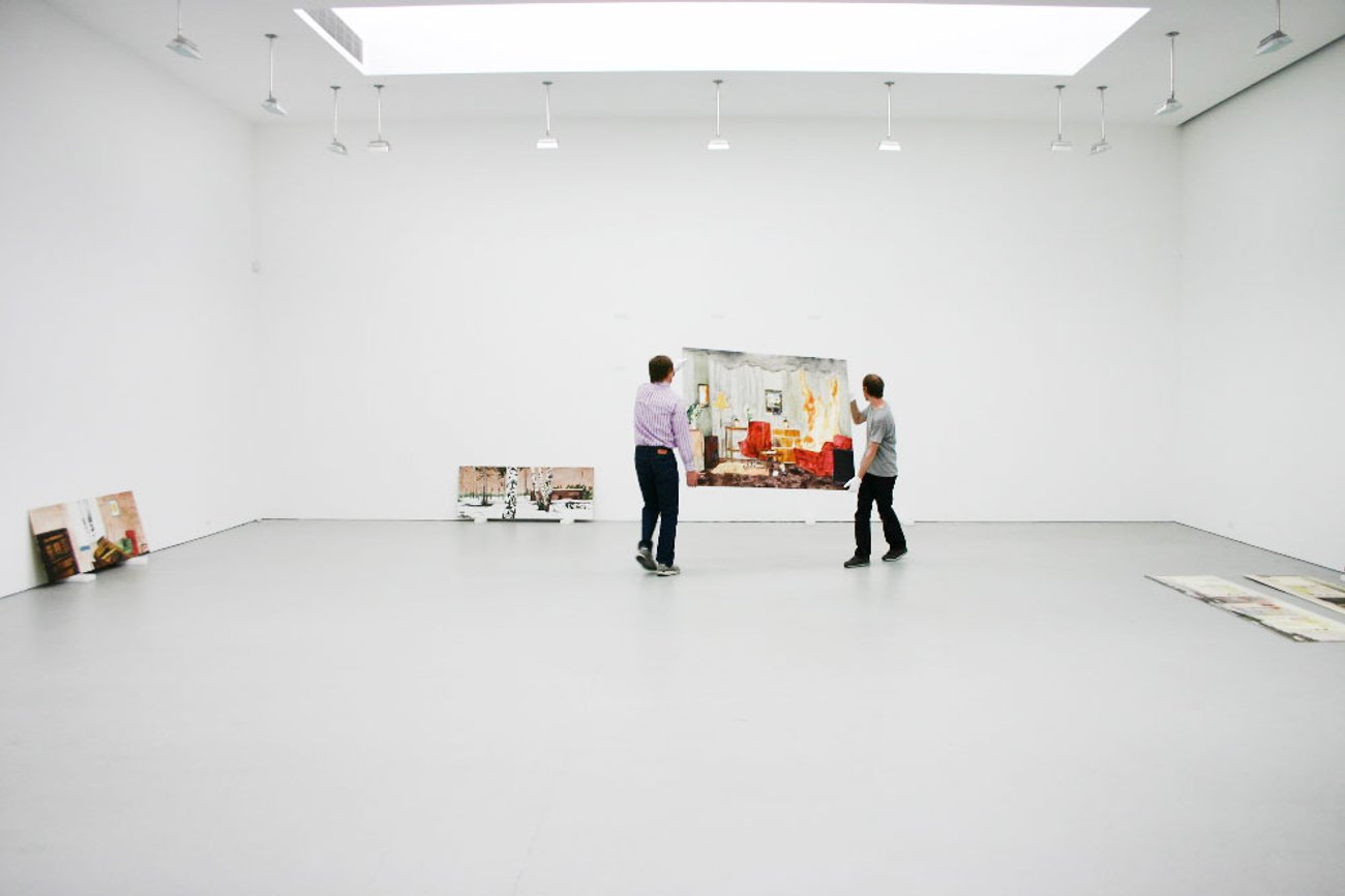 Artists during the installation of People Who Work Here, 519 West 19th Street, New York, 2012. This exhibition devoted to artists on staff was curated by Rawson Projects, whose then co-directors James Morrill and Chris Rawson also work at David Zwirner (in the Accounts and Archive departments, respectively).