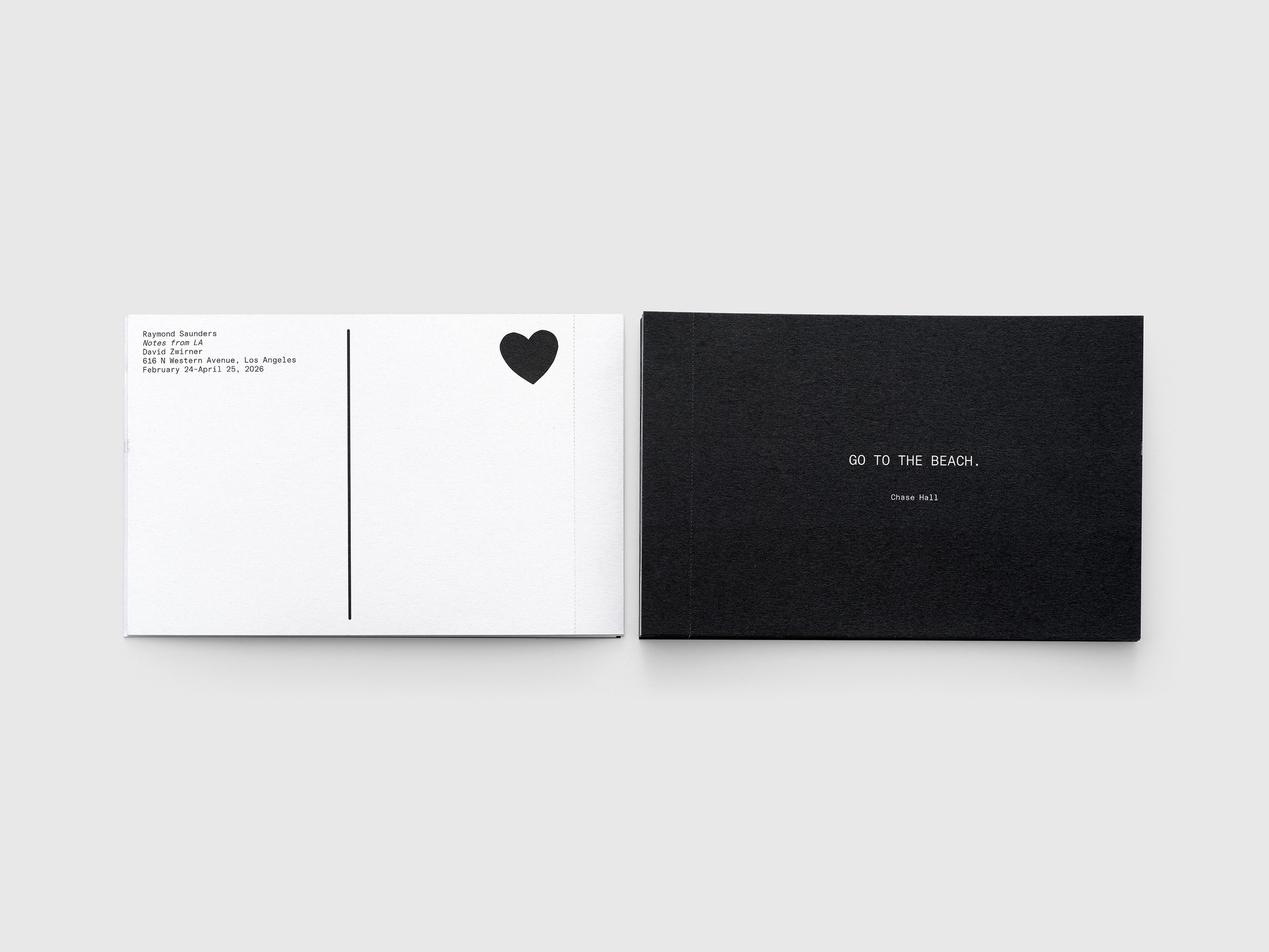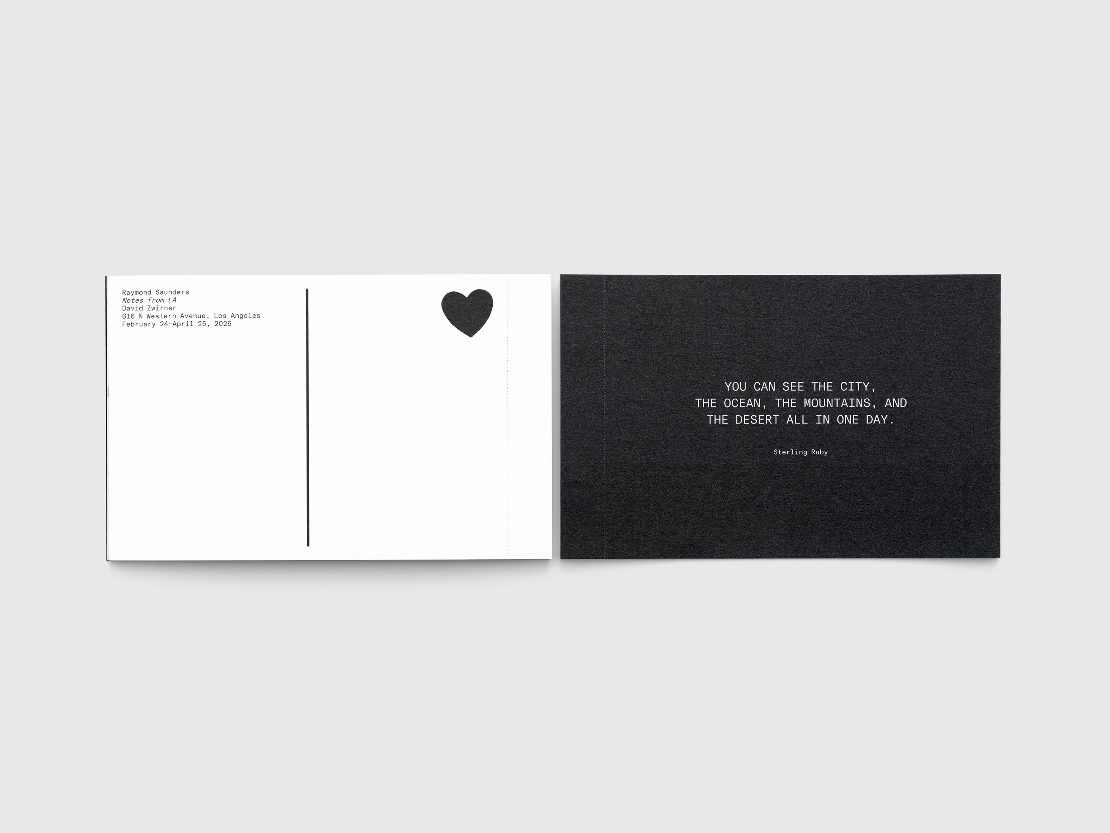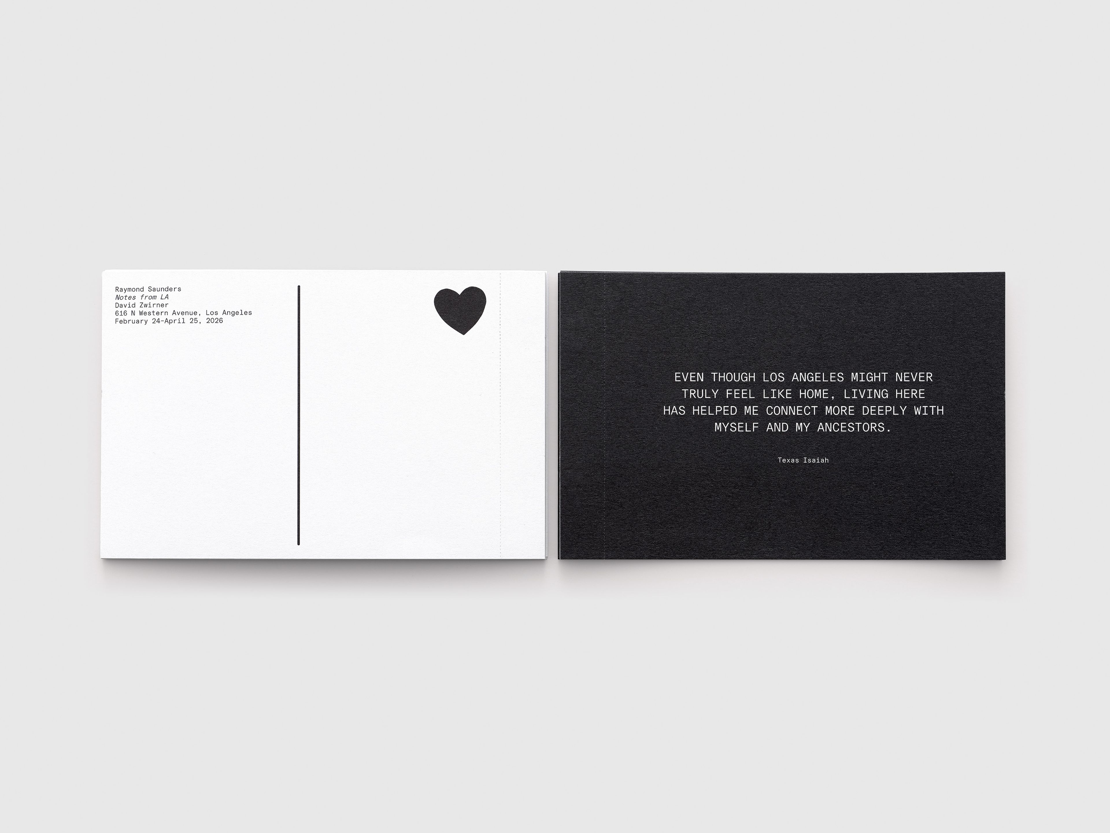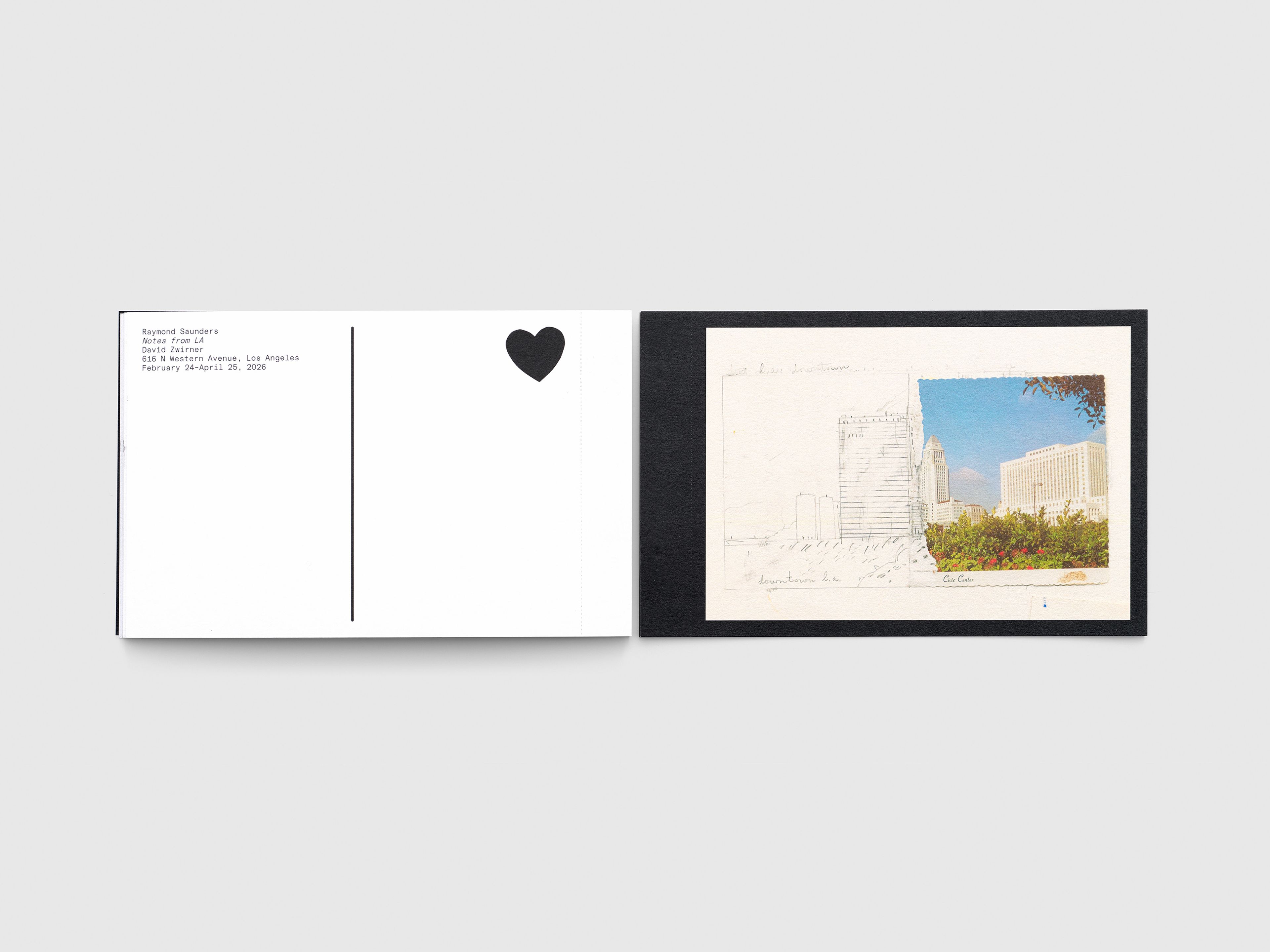 Produced in conjunction with Raymond Saunders’s solo exhibition, Notes from LA, at David Zwirner Los Angeles, this collection of tearaway postcards feature artists’ responses on the frontside and exhibition information on the reverse with space to write a note of one’s own.