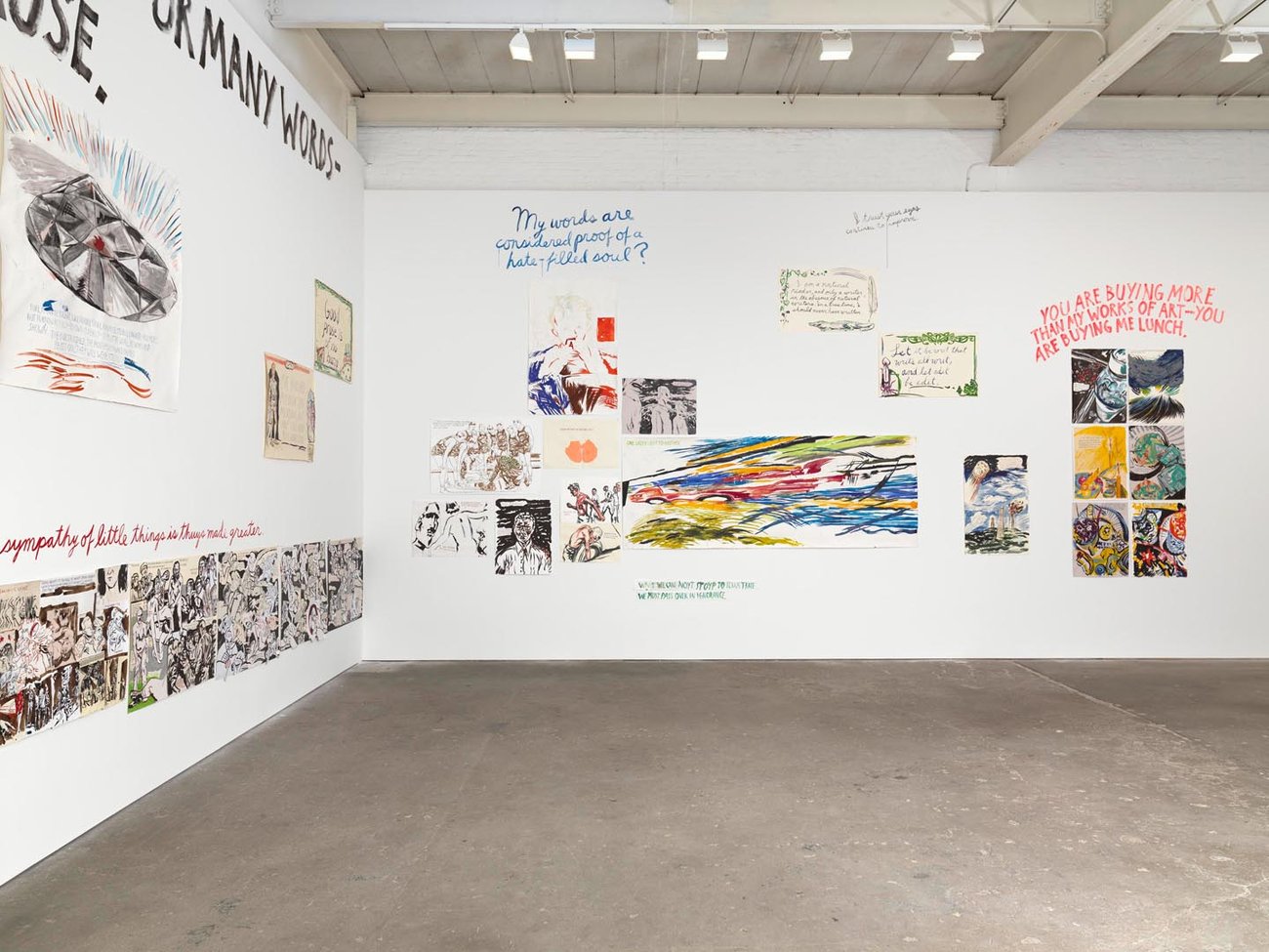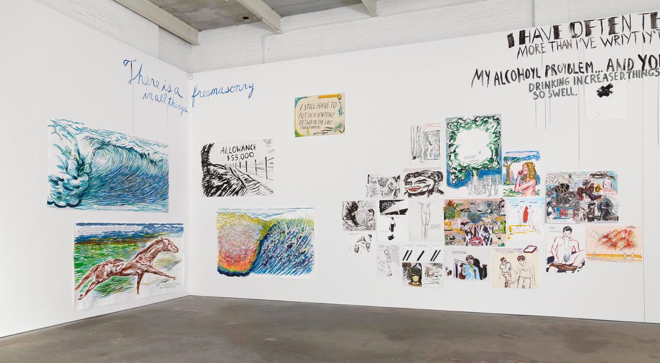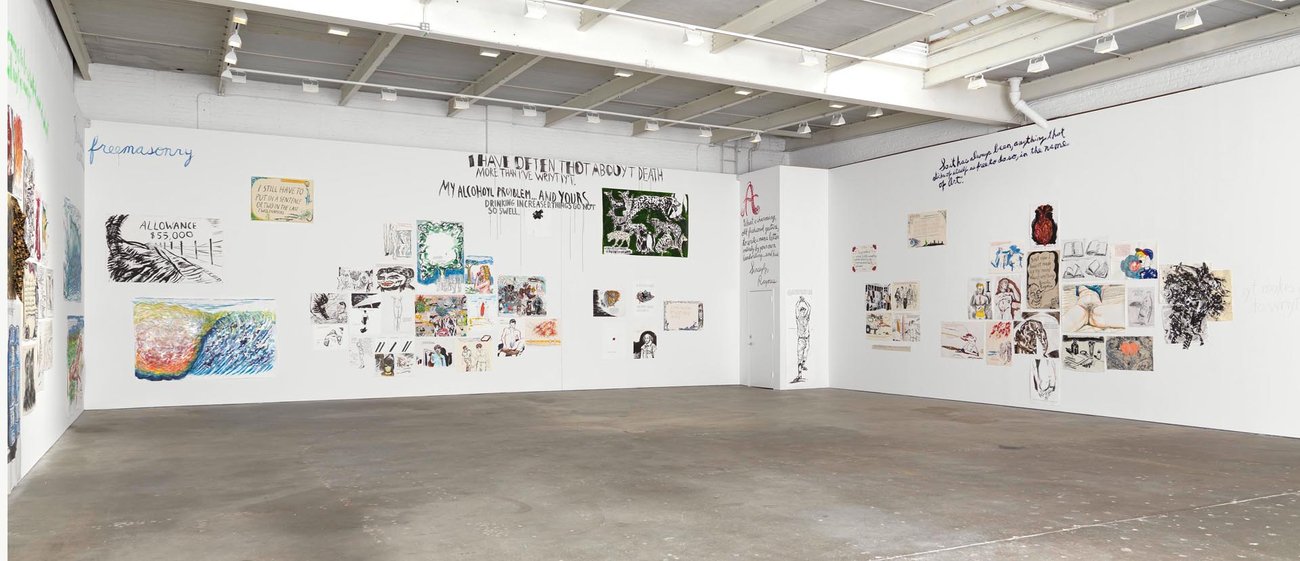 Installation view of the exhibition Raymond Pettibon: To Wit, at David Zwirner in New York, dated 2013.