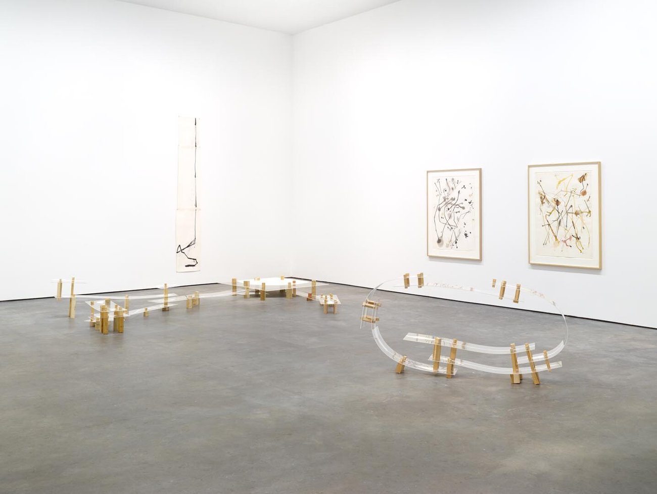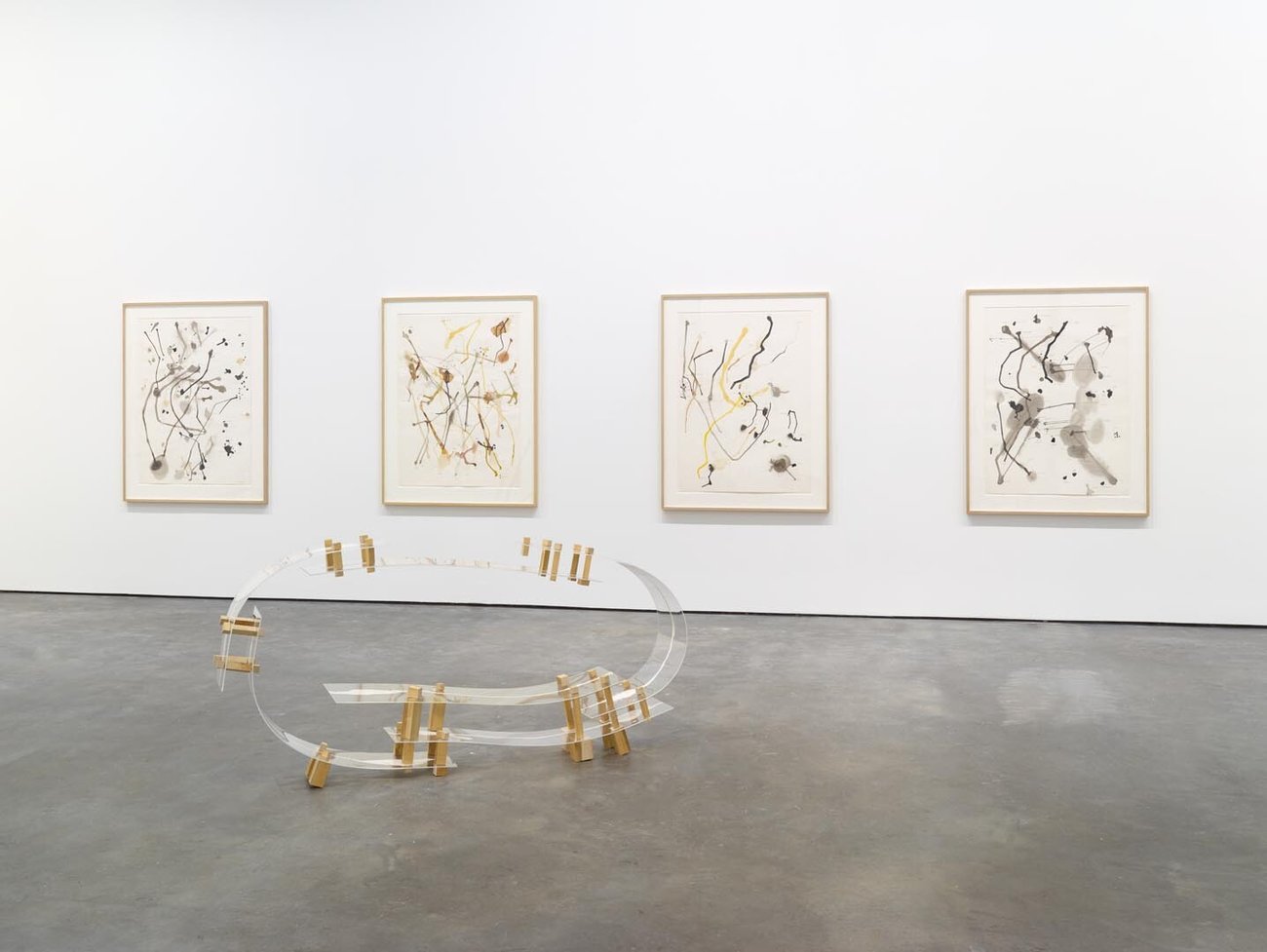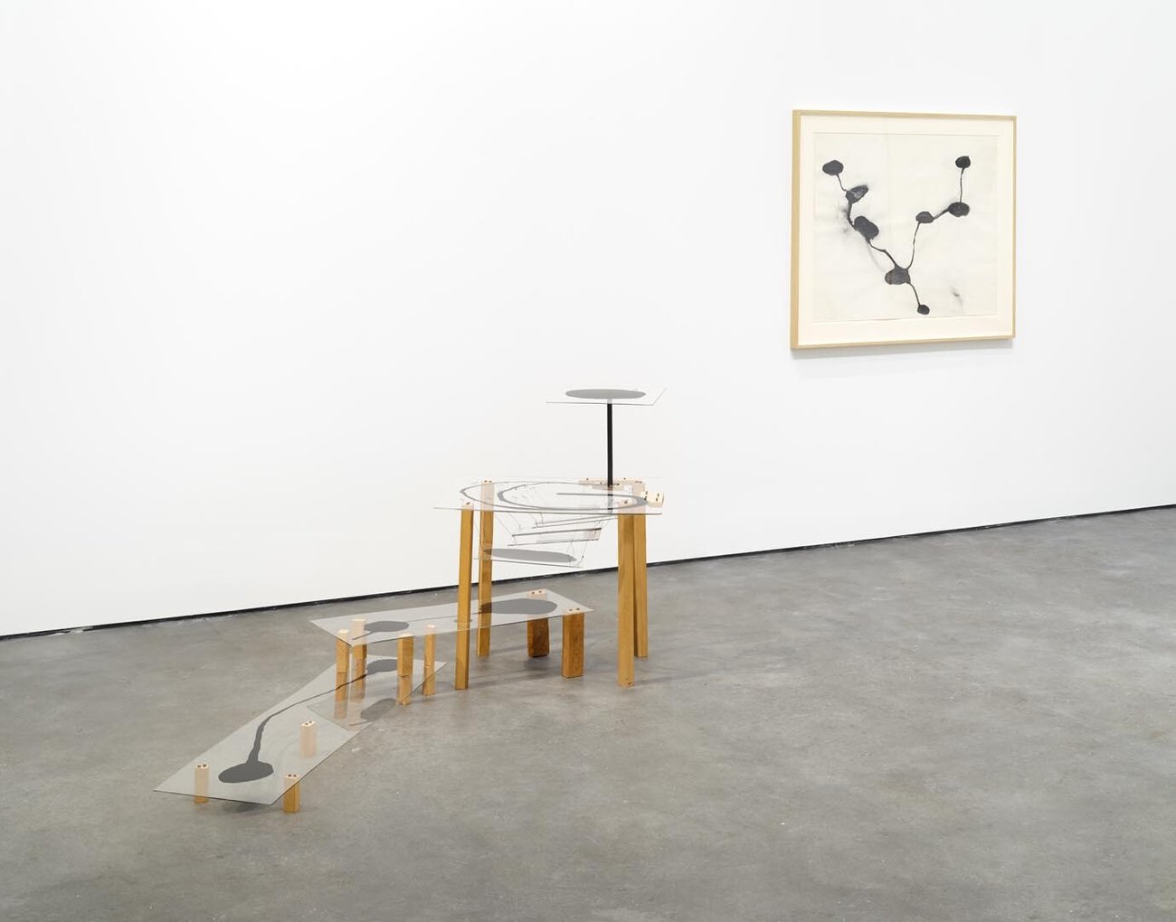In the fluid and lyrical drawings and constructions on view from Taylor's Pet Stains and Puddles series, the artist used his observations of everyday street puddles and pavement stains as a jumping-off point to explore states of liquidity altered by the passage of time. To construct the three-dimensional works he collectively titled Pet Stain Removal Devices, Taylor utilized Plexiglas as a painting surface (conjoined in tiers on wood blocks or suspended from wires), which allowed him to play with the space occupied by the constructions and focus on the illusionary fracturing or spreading of opaque paint seen through the transparent planes. By providing multiple vantage points, the trails of paint applied to each plane sometimes appear to be continuous, and at other times, broken.