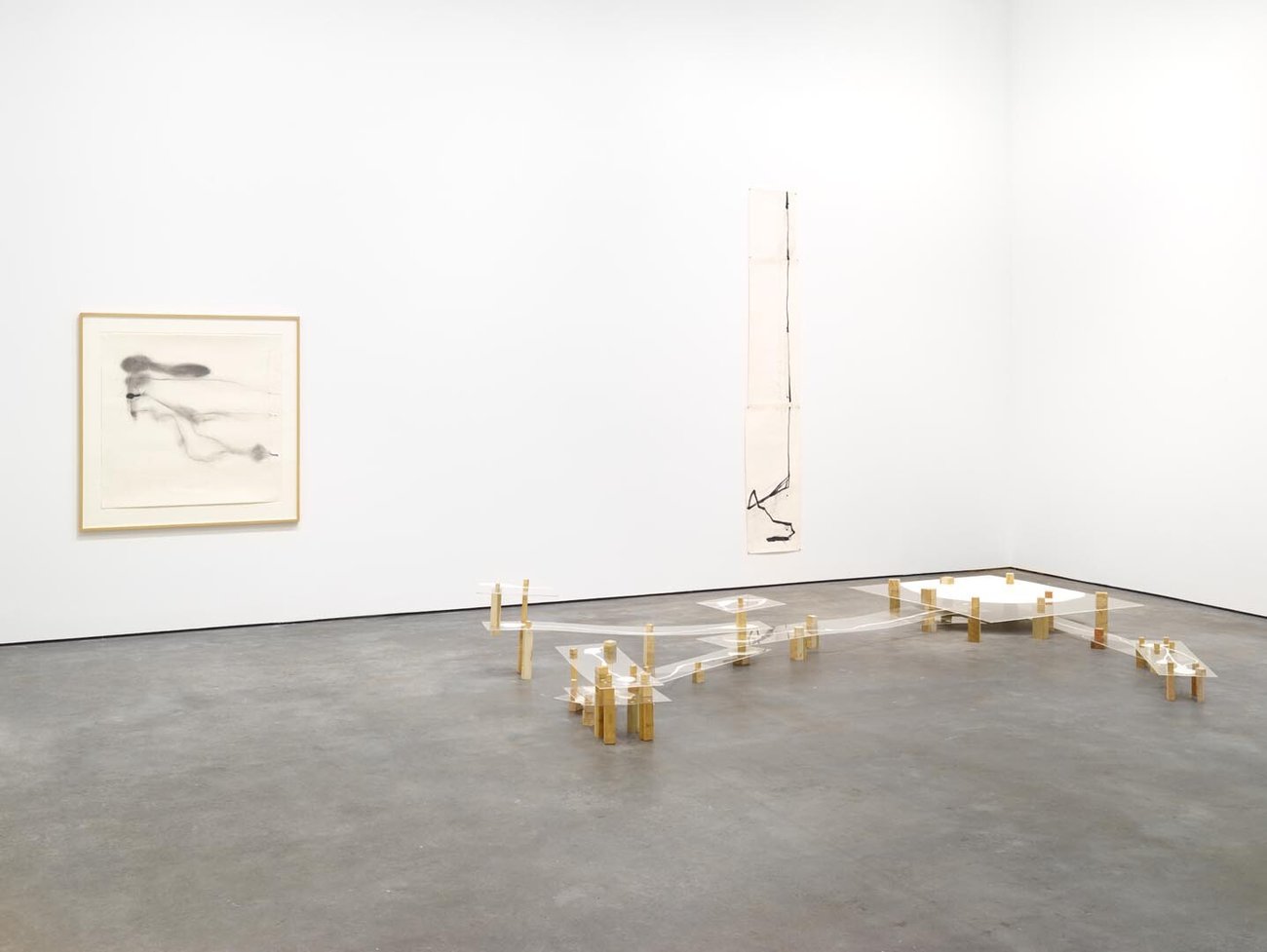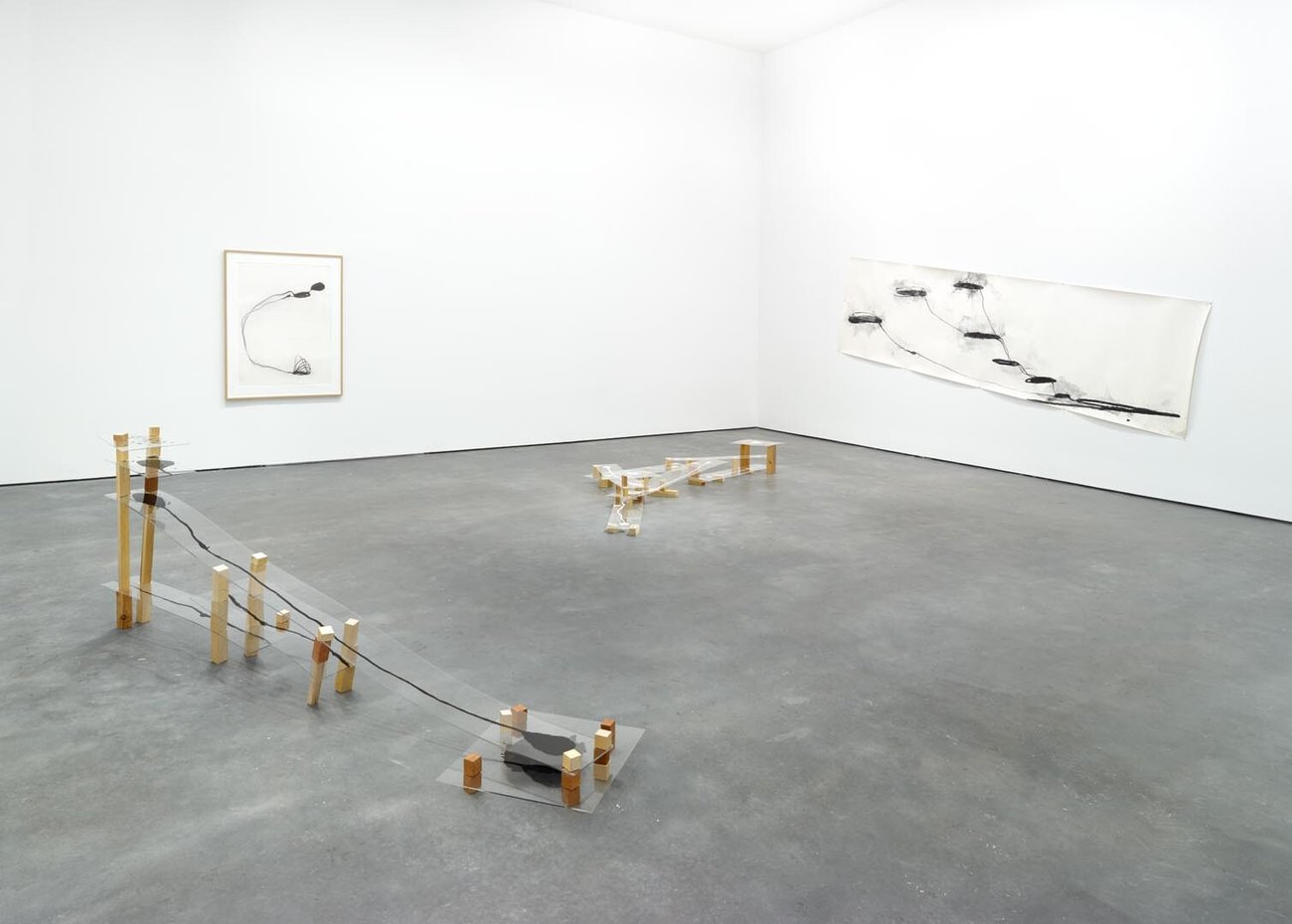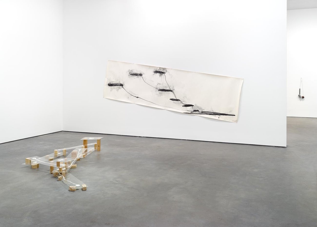 In the fluid and lyrical drawings and constructions on view from Taylor's Pet Stains and Puddles series, the artist used his observations of everyday street puddles and pavement stains as a jumping-off point to explore states of liquidity altered by the passage of time. To construct the three-dimensional works he collectively titled Pet Stain Removal Devices, Taylor utilized Plexiglas as a painting surface (conjoined in tiers on wood blocks or suspended from wires), which allowed him to play with the space occupied by the constructions and focus on the illusionary fracturing or spreading of opaque paint seen through the transparent planes. By providing multiple vantage points, the trails of paint applied to each plane sometimes appear to be continuous, and at other times, broken.