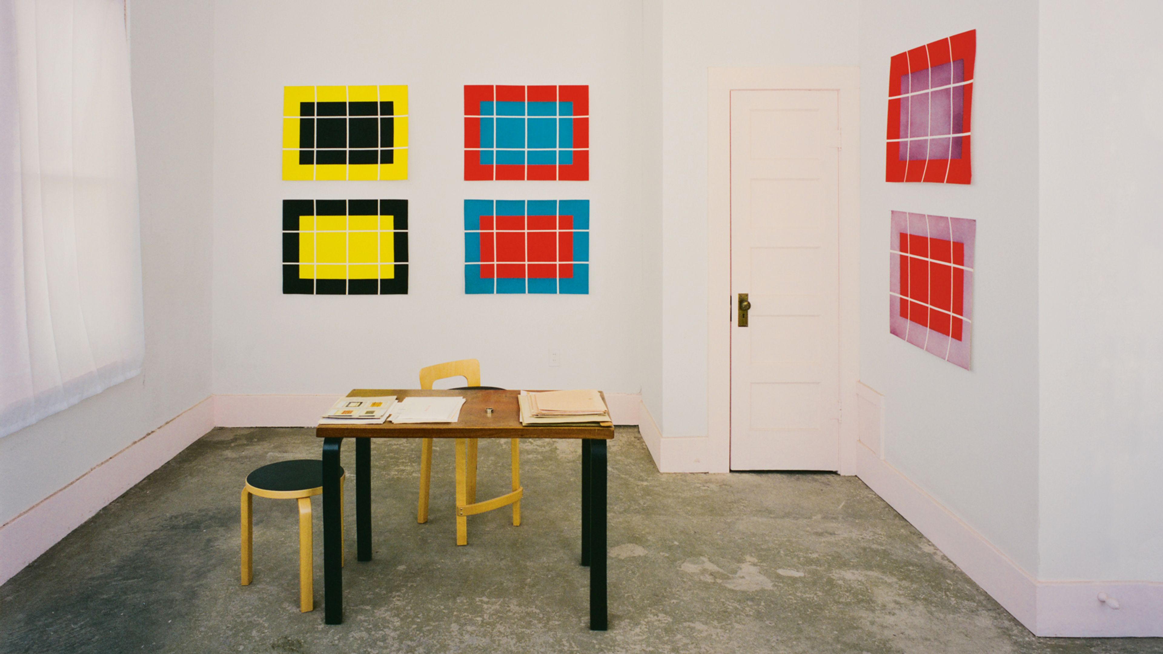 In this series, each pair includes one impression with a printed frame of color and another where the same color is reversed and printed in the interior space of the frame. The dividing vertical and horizontal lines are specific to each pair, creating proportions of 1:2, 1:3, 1:4, and 1:5.