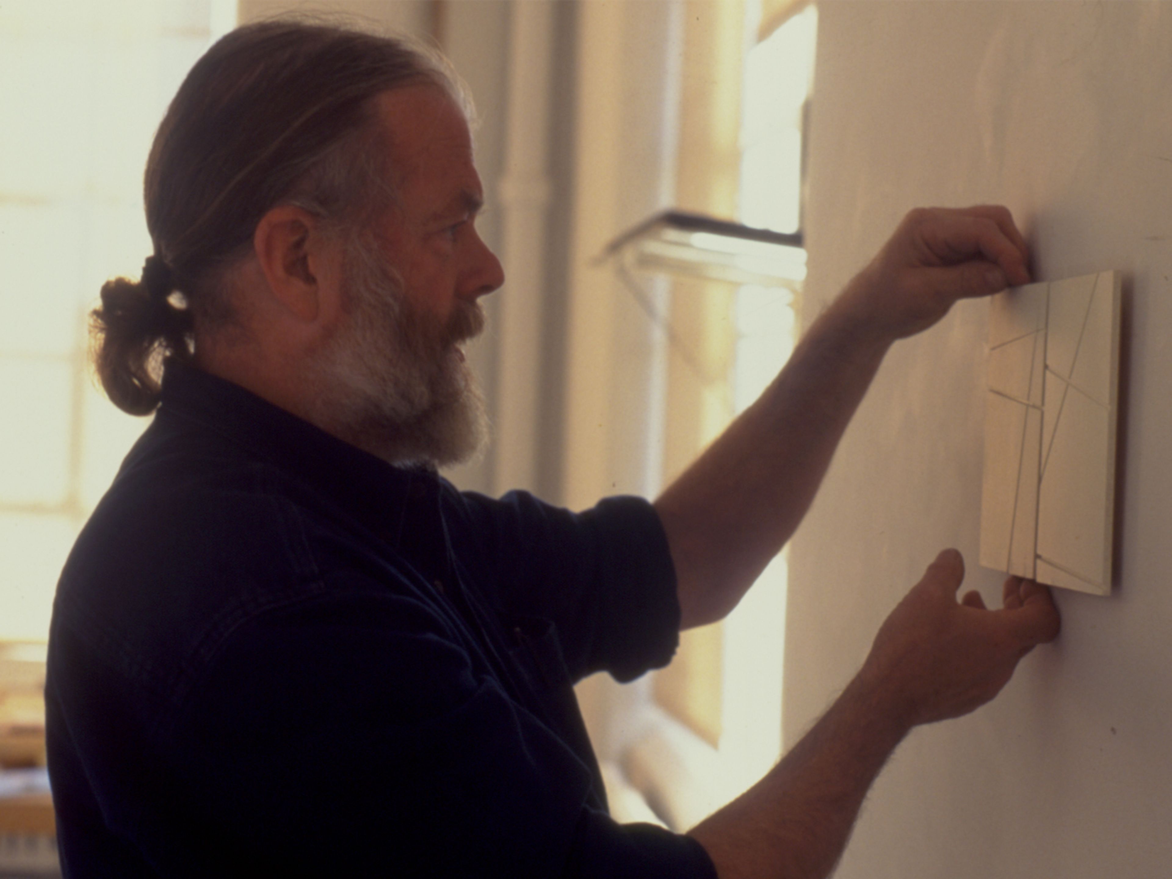 Fred Sandback during the installation of Fred Sandback: Recent Work, Lawrence Markey Gallery, c. 1998. Photo by Lawrence Markey