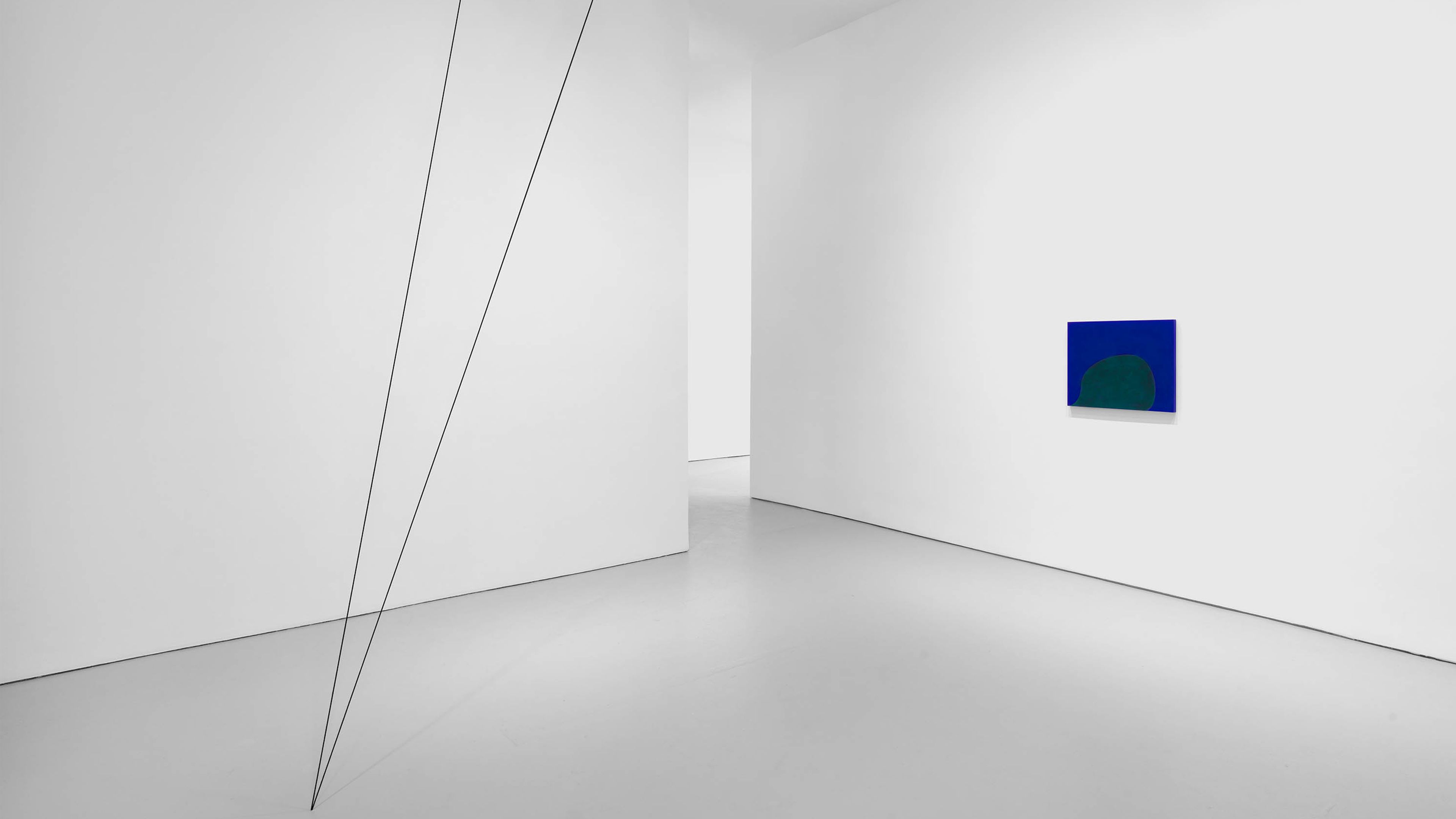 Fred Sandback’s (1943–2003) sculptures outline planes and volumes in space. Though he employed metal rods and elastic cords early in his career, the artist soon dispensed with mass and weight by using acrylic yarn to create works that address their physical surroundings—the “pedestrian space,” as Sandback called it, of everyday life. By stretching lengths of yarn horizontally, vertically, or diagonally at different scales and in varied configurations, the artist developed a singular formal vocabulary that elaborated on the phenomenological experience of space and volume with unwavering consistency and ingenuity.