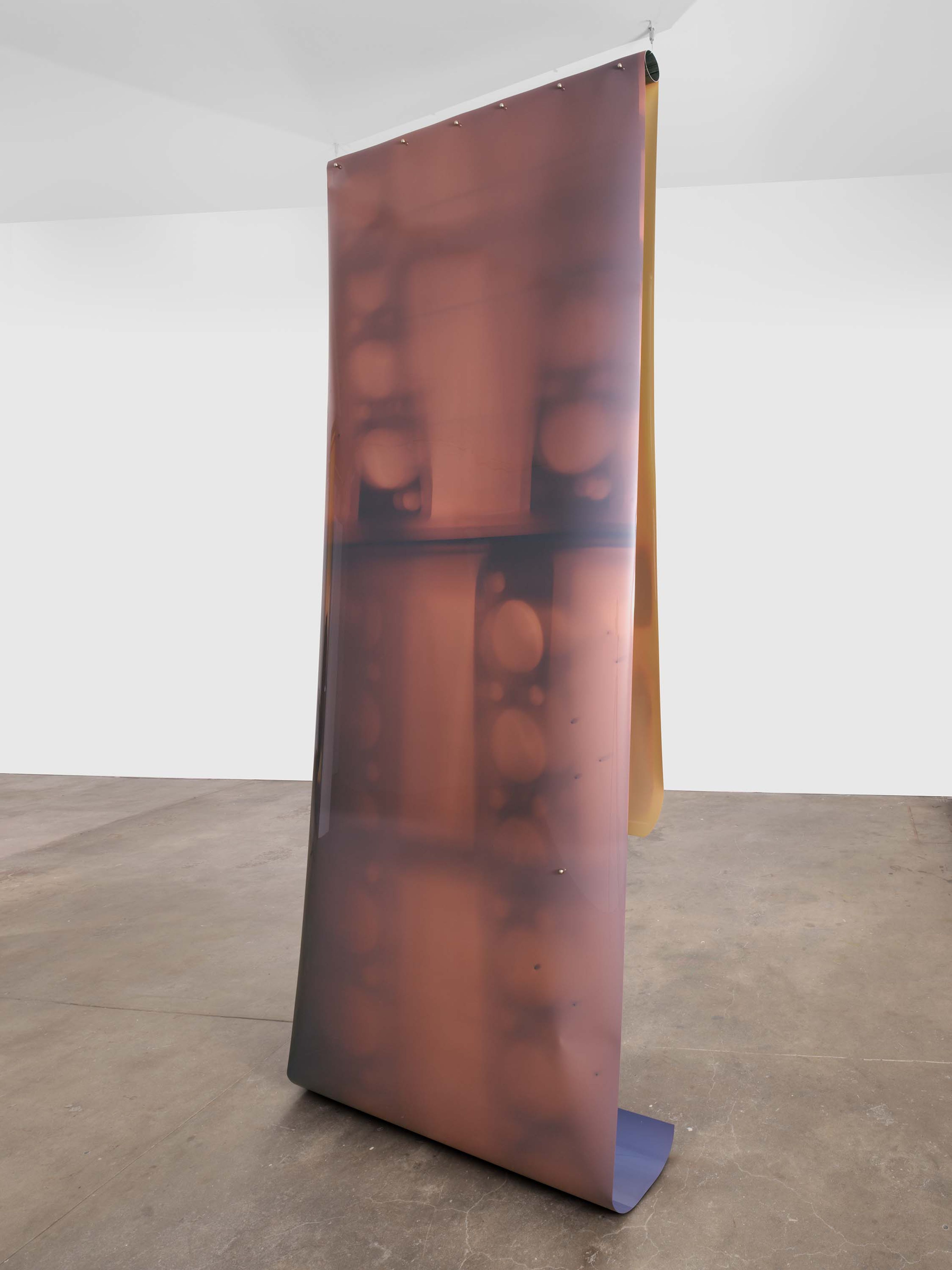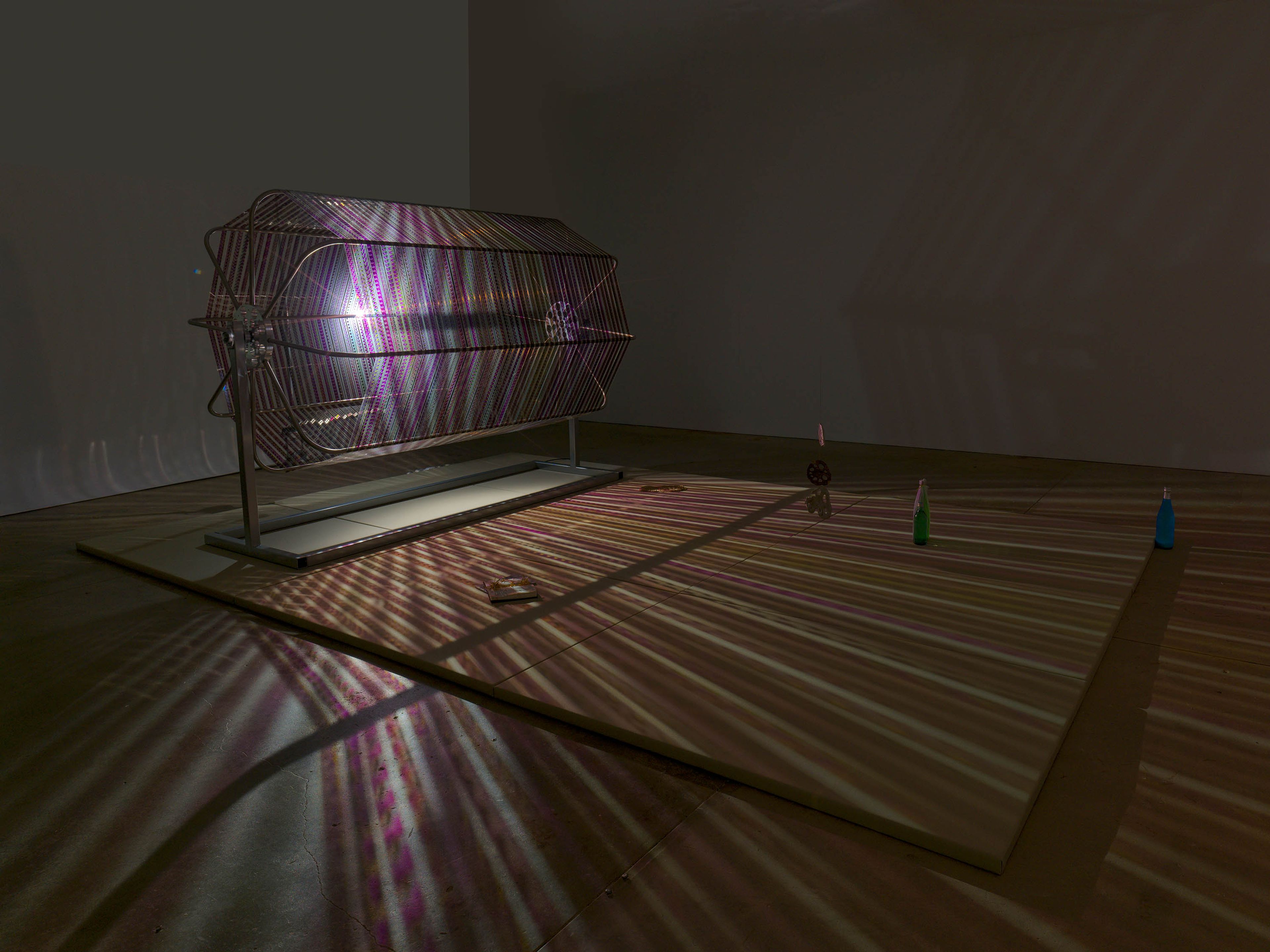 Powder coated steel, aluminum, stainless steel, 35mm film, stepper motor, relays, controllers, stage lights, cables, upholstered wood base, cast aluminum lotus root, cast bronze lotus root, nylon, cast aluminum book ('In Praise of Shadows' by Jun’ichirō Tanizaki), photograph of a mudflat, book ('Autobiography of Death' by Kim Hyesoon), thread, metallic twist ties, cast aluminum anchovy, cast bronze cabbage leaf, cast aluminum lotus tubers, plastic tangerines, tissue paper, spirits