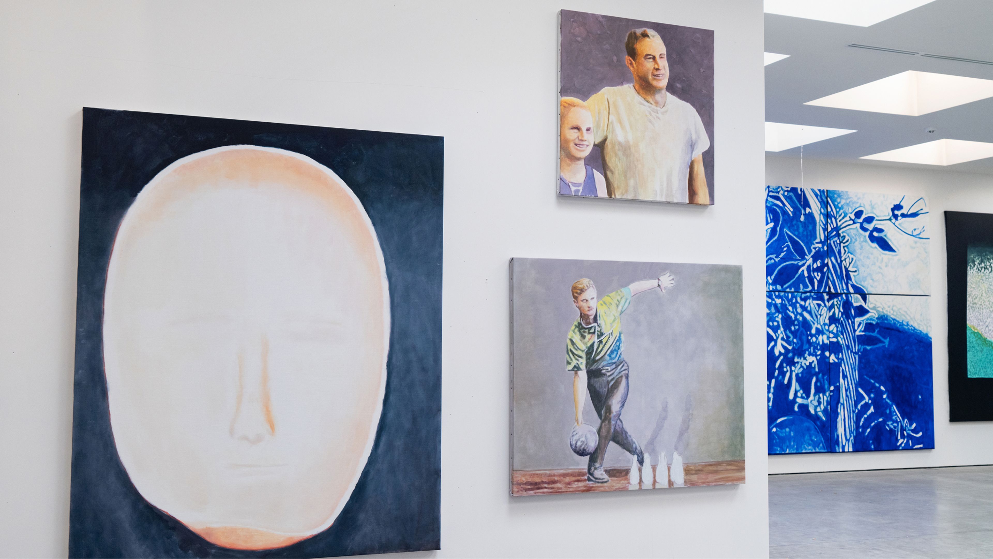 In the first gallery, Hall of Fame (2025) features a figure donning the yellow NFL Hall of Fame jacket and holding a football between his hands as he stares vacantly ahead, a champion of the most American of pastimes.