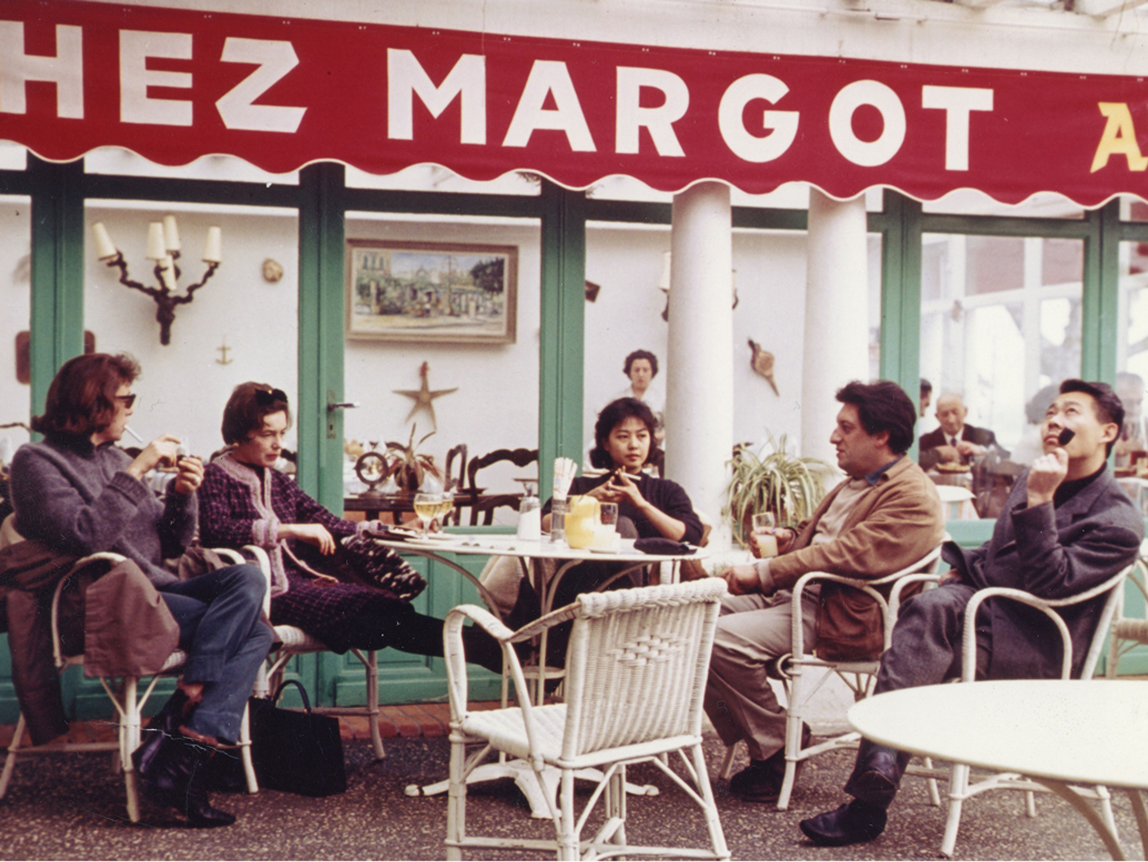 Joan Mitchell, Patricia Matisse, Zao May, Jean Paul Riopelle, and Zao Wou-ki at Chez Margot, Golfe-Juan, 1962. Photographer unknown, Joan Mitchell Foundation Archives