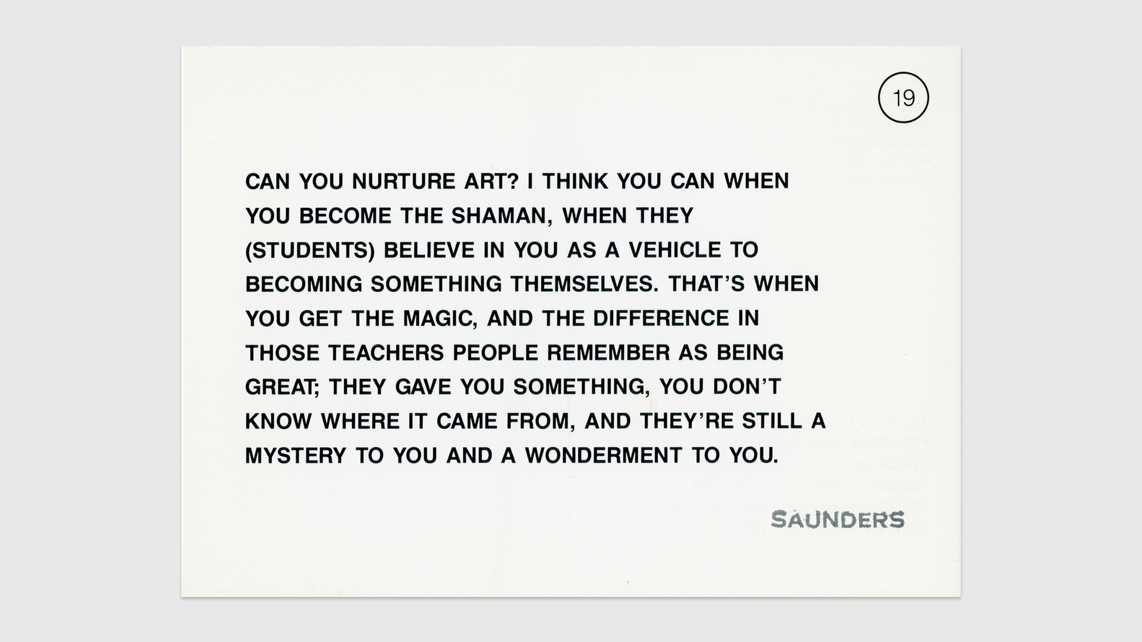 Saunders’s creative and holistic approach to education was in part a response to his skepticism around traditional systems of training. As the artist stated, “I’ve had too much schooling to think of myself as either naive or childish.… I mean, children paint beautifully, but as long as the designation ‘children’s art’ exists, there will be an undermining of their content.”