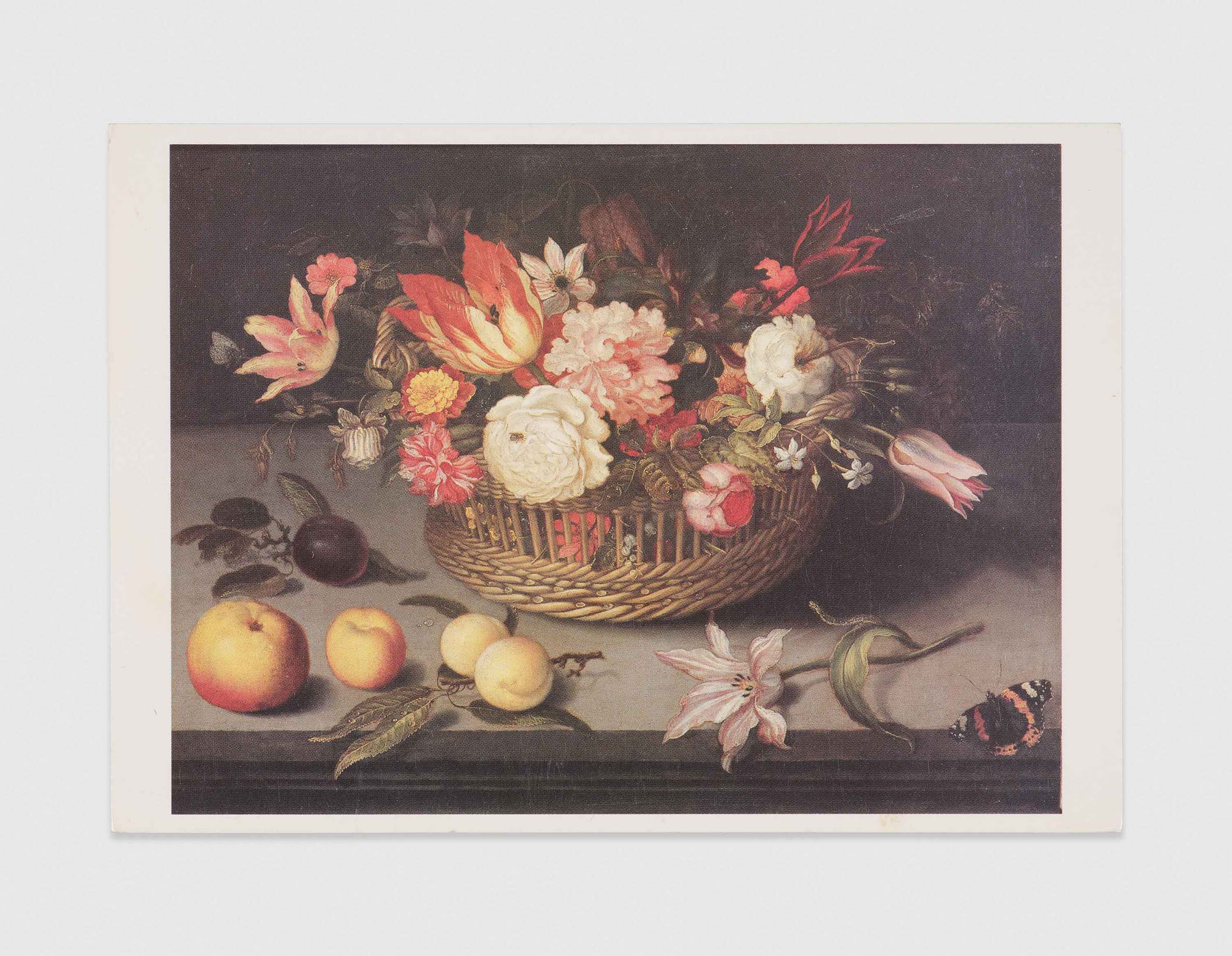 Balthasar van der Ast, Basket of Flowers, c. 1622, reproduced as part of a selection of postcards from Saunders’s collection, gathered by the artist throughout his domestic and international travels over the years