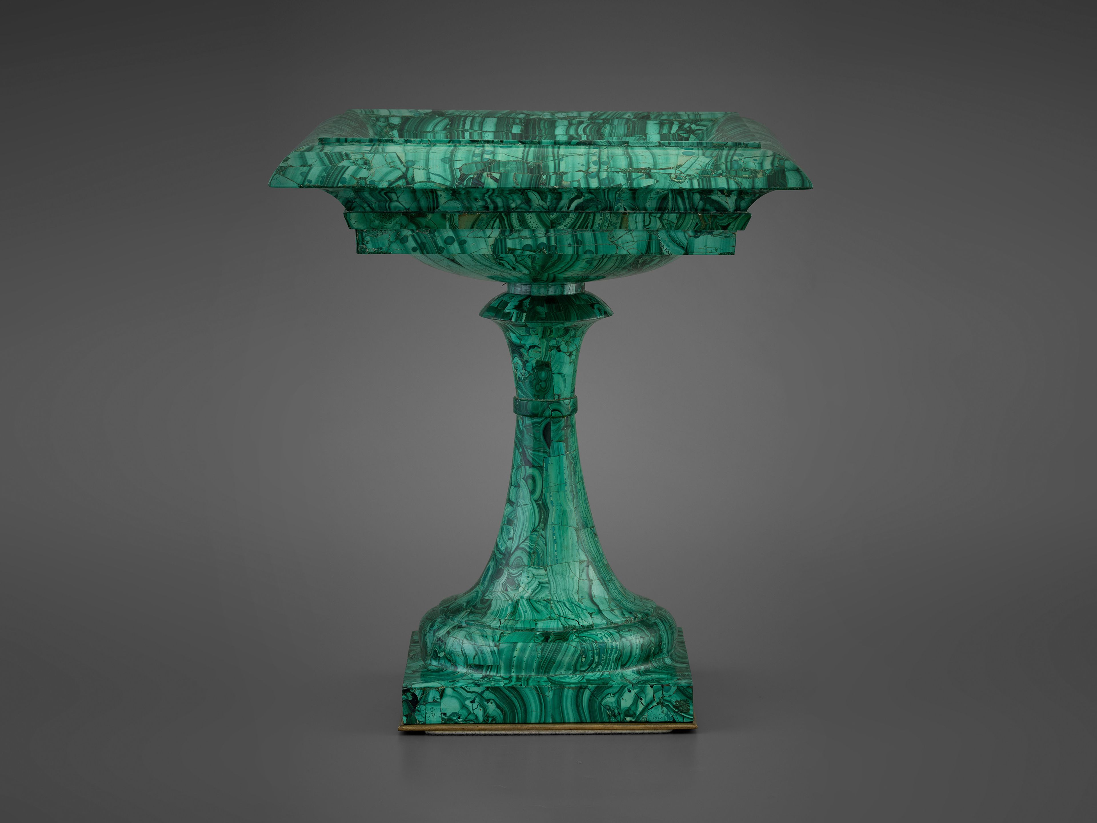 A monumental malachite tazza presented by Emperor Nicolas I to the infante Luisa of Spain for her wedding with the Duke Antoine de Montpensier. Imperial lapidary workshops, Peterhof, 1846. After a design by Ivan Ivanovich Galberg. © Galerie Kugel