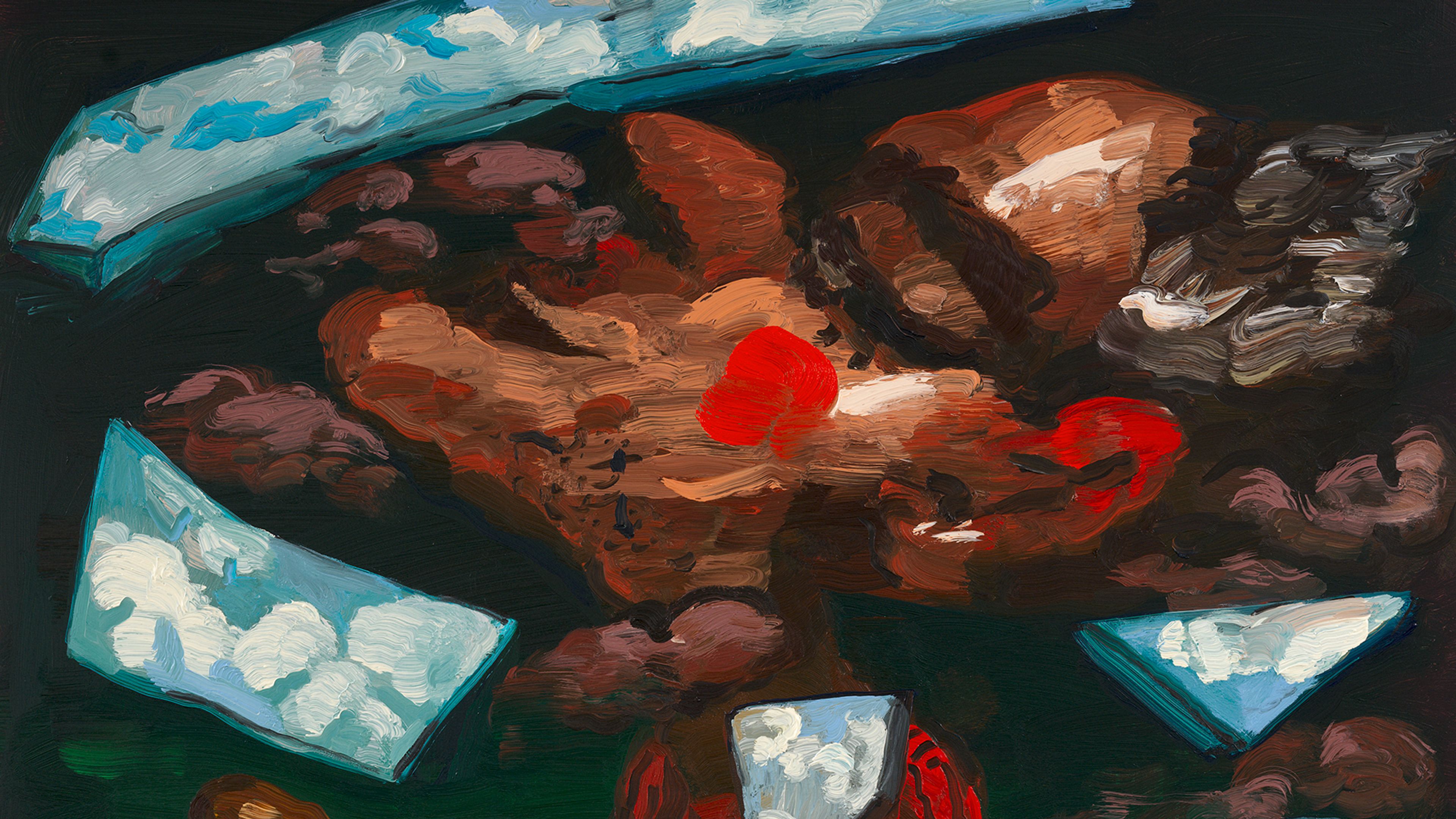 Additional highlights include a painting, The Whistler (2025), by the American artist Dana Schutz, depicting a man strolling with a baguette and a bouquet, while shards of sky fall around him. Often depicting figures in seemingly impossible, enigmatic, or invented situations, her works reveal the deeper complications, tensions, and ambiguities of contemporary life. In this large-scale canvas, Schutz continues her practice of constructing complex visual allegories that engage the capacity of art to represent subjective experience.