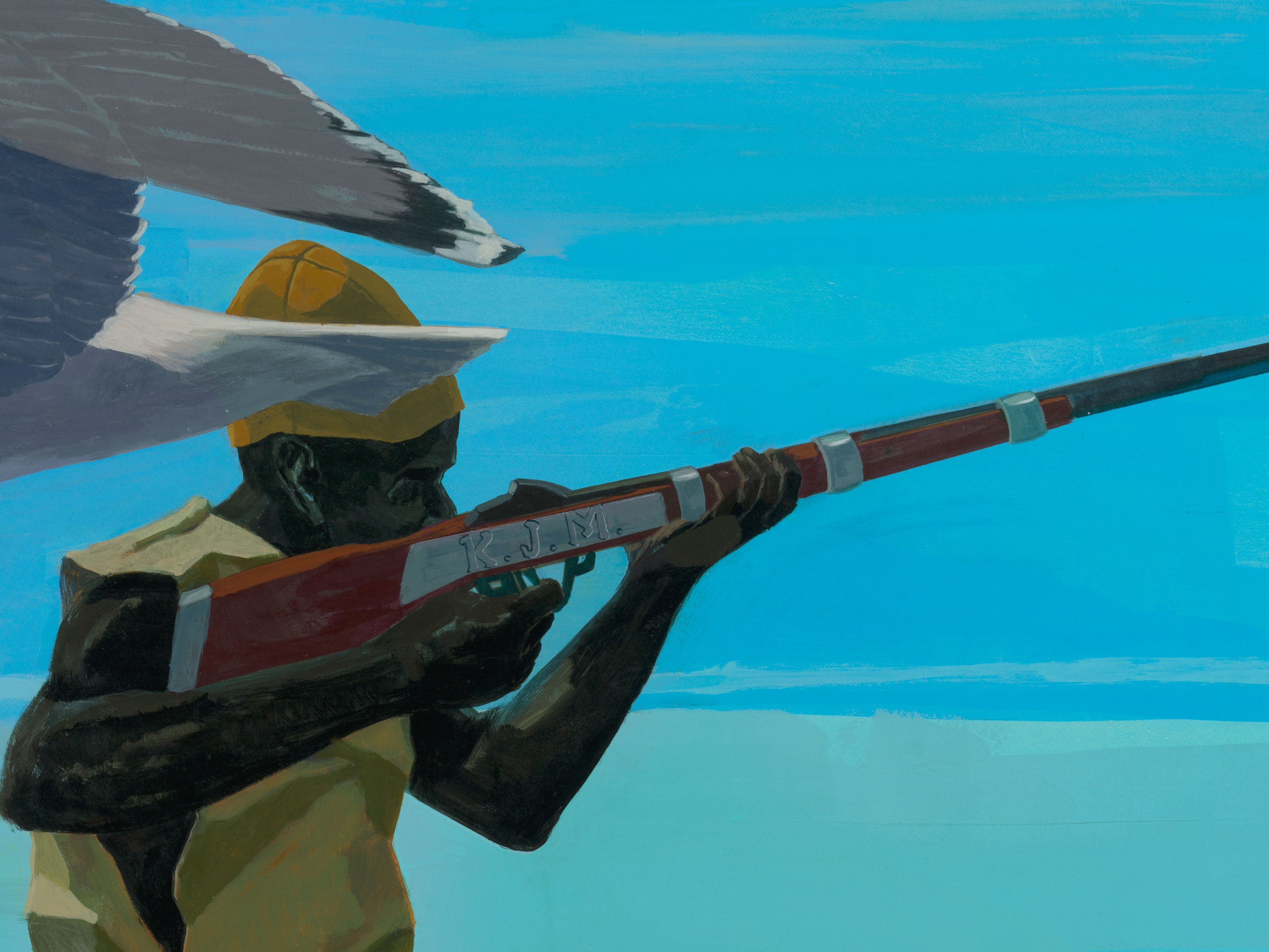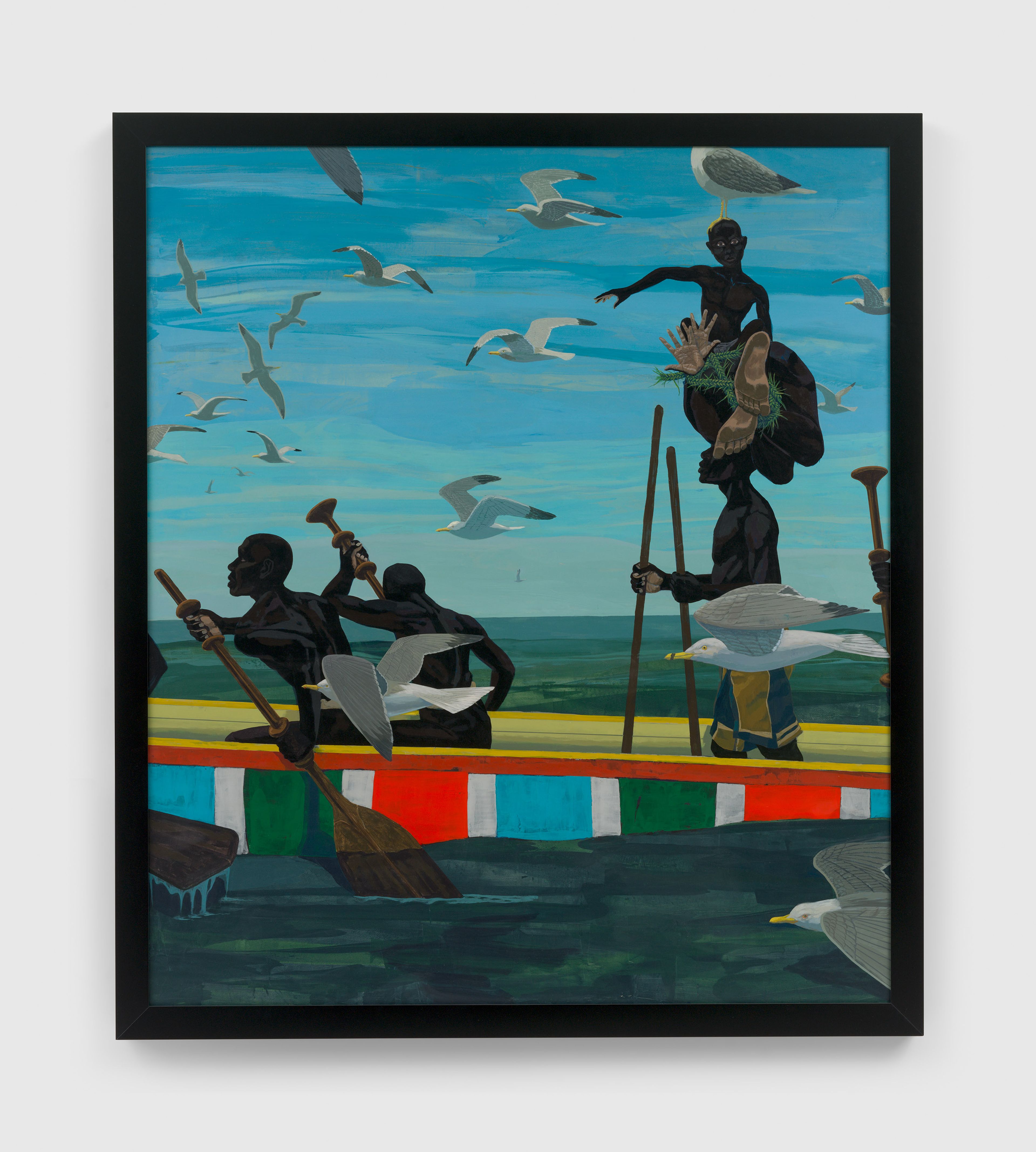 Haul, the last painting of the cycle, pictures the return from a trade. A canoe comes back to shore, laden with goods received: kegs of rum, guns, and great baskets of cowrie shells—all known to have been traded within Africa in those years—as well as a Victorian teacup, a mantel clock, and other such European prizes. A female figure bedecked in cowries—Marshall’s own La Grande Odalisque—reclines in the center of the canvas with her hand raised to the sky to block the sun. Idling seagulls dot the composition and placid sea, as though to suggest that the boat is moving at a leisurely pace; in fact, upon closer inspection, four rowers are required to move the canoe’s tremendous bounty through the water. The scene features a handful of anachronistic details, including objects in modern gift wrap, a blonde wig wearing a crown, and the 1970s-inflected outfit of a gunner who keeps watch over the horizon. On the rifle plate, Marshall has affixed his own monogram, as if to further stamp the artist’s presence and authorial subjectivity.